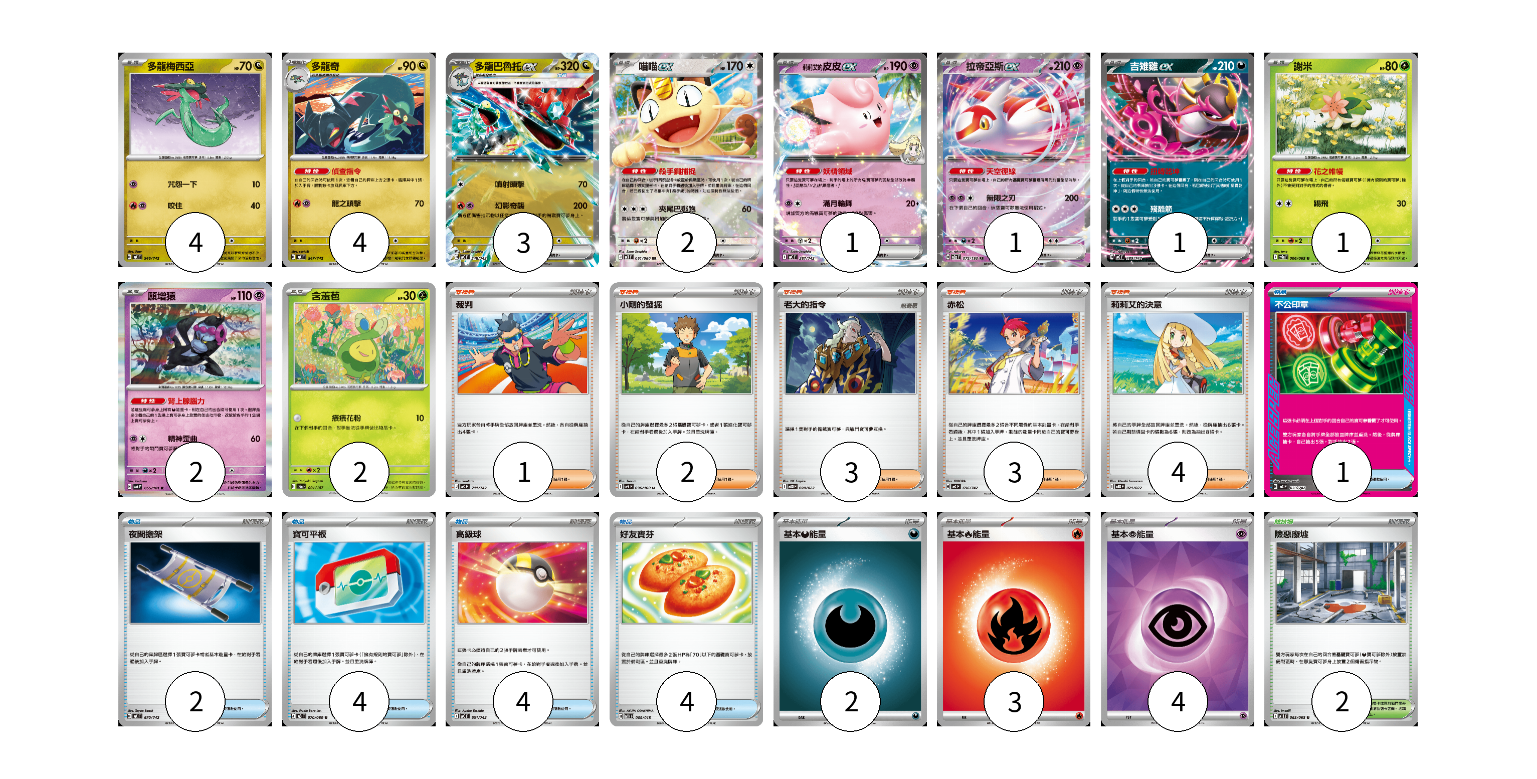 牌組構築方案 以此牌組為基礎新構築牌組 顯示卡面 顯示列表 寶可夢卡(21) 4 4 3 2 1 1 1 1 2 2 物品卡(15) 1 2 4 4 4 支援者卡(13) 1 2 3 3 4 競技場卡(2) 2 能量卡(9) 2 3 4 寶可夢卡(21) 卡牌名稱 張數 卡牌名稱 張數 多龍梅西亞 MC 546/742 04 多龍奇 MC 547/742 04 多龍巴魯托ex MC 548/742 03 喵喵ex M3 061/080 02 <莉莉艾的>皮皮ex MC 287/742 01 拉帝亞斯ex M2a 075/193 01 吉雉雞ex MC 489/742 01 謝米 SV9a 006/063 01 願增猿 SV6 055/101 02 含羞苞 SV8a 001/187 02 物品卡(15) 卡牌名稱 張數 卡牌名稱 張數 不公印章 MC 633/742 01 夜間擔架 MC 670/742 02 寶可平板 M3 070/080 04 高級球 MC 651/742 04 好友寶芬 SVTH 009/018 04 支援者卡(13) 卡牌名稱 張數 卡牌名稱 張數 裁判 MC 711/742 01 小剛的發掘 SV9 096/100 02 老大的指令 MBD 020/022 03 赤松 MC 696/742 03 莉莉艾的決意 MBD 021/022 04 競技場卡(2) 卡牌名稱 張數 卡牌名稱 張數 險惡廢墟 M1L 063/063 02 能量卡(9) 卡牌名稱 張數 卡牌名稱 張數 基本【惡】能量 MC DAR 02 基本【火】能量 MC FIR 03 基本【超】能量 SVOD PSY 04 以此牌組為基礎新構築牌組 牌組編碼 HIcfML-BQqdon-ueRVjm copy 列印牌組單 牌組編碼已複製 分享至SNS