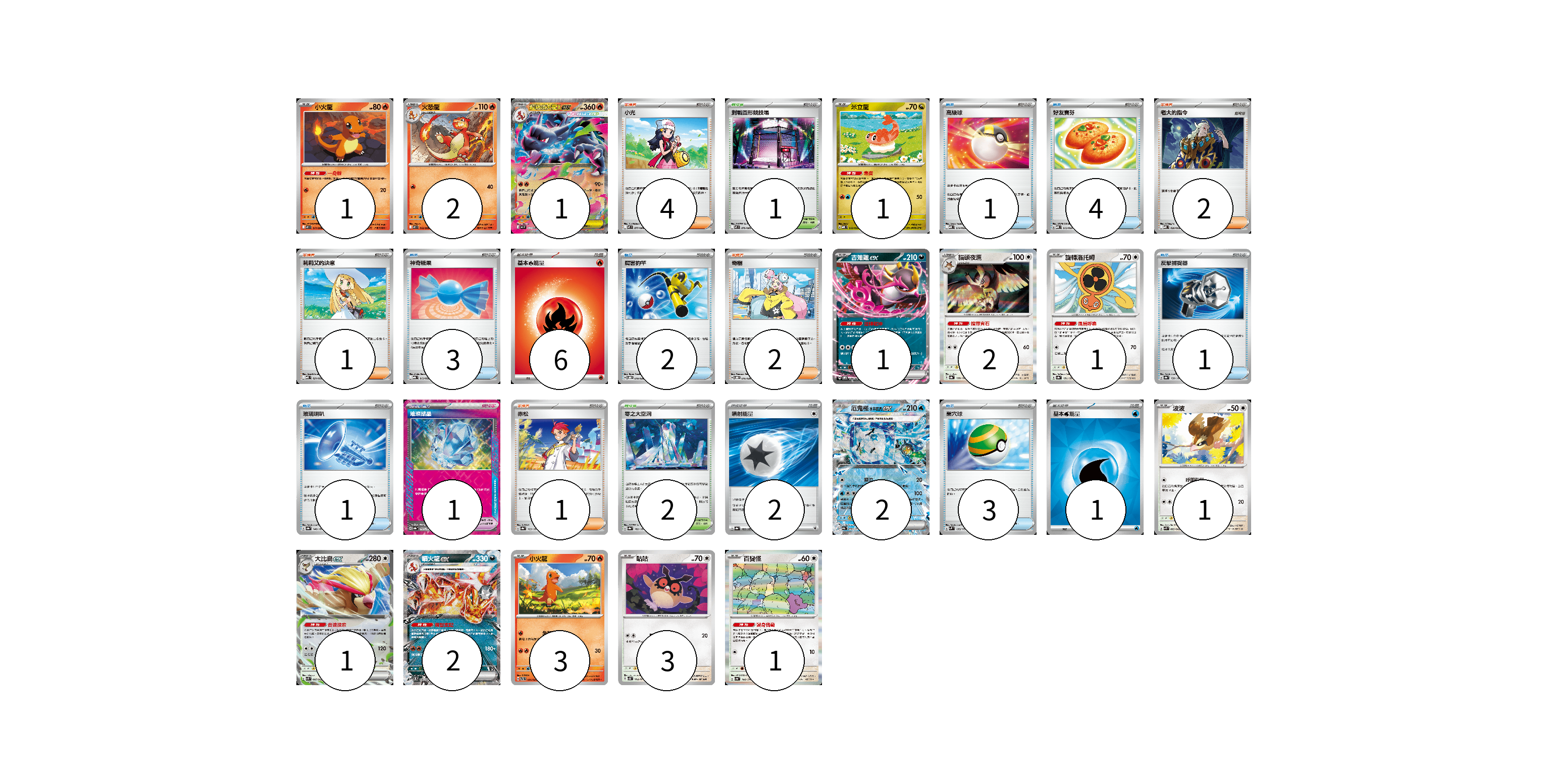 牌組構築方案 以此牌組為基礎新構築牌組 顯示卡面 顯示列表 寶可夢卡(22) 1 2 1 1 1 2 1 2 1 1 2 3 3 1 寶可夢道具(1) 1 物品卡(15) 1 4 3 2 1 1 3 支援者卡(10) 4 2 1 2 1 競技場卡(3) 1 2 能量卡(9) 6 2 1 寶可夢卡(22) 卡牌名稱 張數 卡牌名稱 張數 小火龍 M2 011/080 01 火恐龍 M2 012/080 02 超級噴火龍Xex M2 013/080 01 米立龍 MBD 010/022 01 吉雉雞ex SVOM 009/021 01 貓頭夜鷹 SV8a 128/187 02 旋轉洛托姆 SV8a 131/187 01 厄鬼椪 水井面具ex SV8a 050/187 02 波波 SVK 003/042 01 大比鳥ex SVK 005/042 01 噴火龍ex SVTL 006/021 02 小火龍 SVTL 001/021 03 咕咕 SV5K 054/071 03 百變怪 SV4a 144/190 01 寶可夢道具(1) 卡牌名稱 張數 卡牌名稱 張數 璀璨結晶 SV8a 152/187 01 物品卡(15) 卡牌名稱 張數 卡牌名稱 張數 高級球 MBD 014/022 01 好友寶芬 MBD 013/022 04 神奇糖果 MBG 013/022 03 厲害釣竿 SVOD 010/020 02 反擊捕捉器 SV8a 139/187 01 玻璃喇叭 SV8a 140/187 01 巢穴球 SVM 133/175 03 支援者卡(10) 卡牌名稱 張數 卡牌名稱 張數 小光 M2 077/080 04 老大的指令 MBD 020/022 02 莉莉艾的決意 MBD 021/022 01 奇樹 SVOD 016/020 02 赤松 SV8a 163/187 01 競技場卡(3) 卡牌名稱 張數 卡牌名稱 張數 對戰圓形競技場 M2 079/080 01 零之大空洞 SV8a 182/187 02 能量卡(9) 卡牌名稱 張數 卡牌名稱 張數 基本【火】能量 M-P FIR 06 噴射能量 SV8a 185/187 02 基本【水】能量 SVM WAT 01 以此牌組為基礎新構築牌組 牌組編碼 HJfMrF-XdRnpt-LGMjch copy 列印牌組單 牌組編碼已複製 分享至SNS
