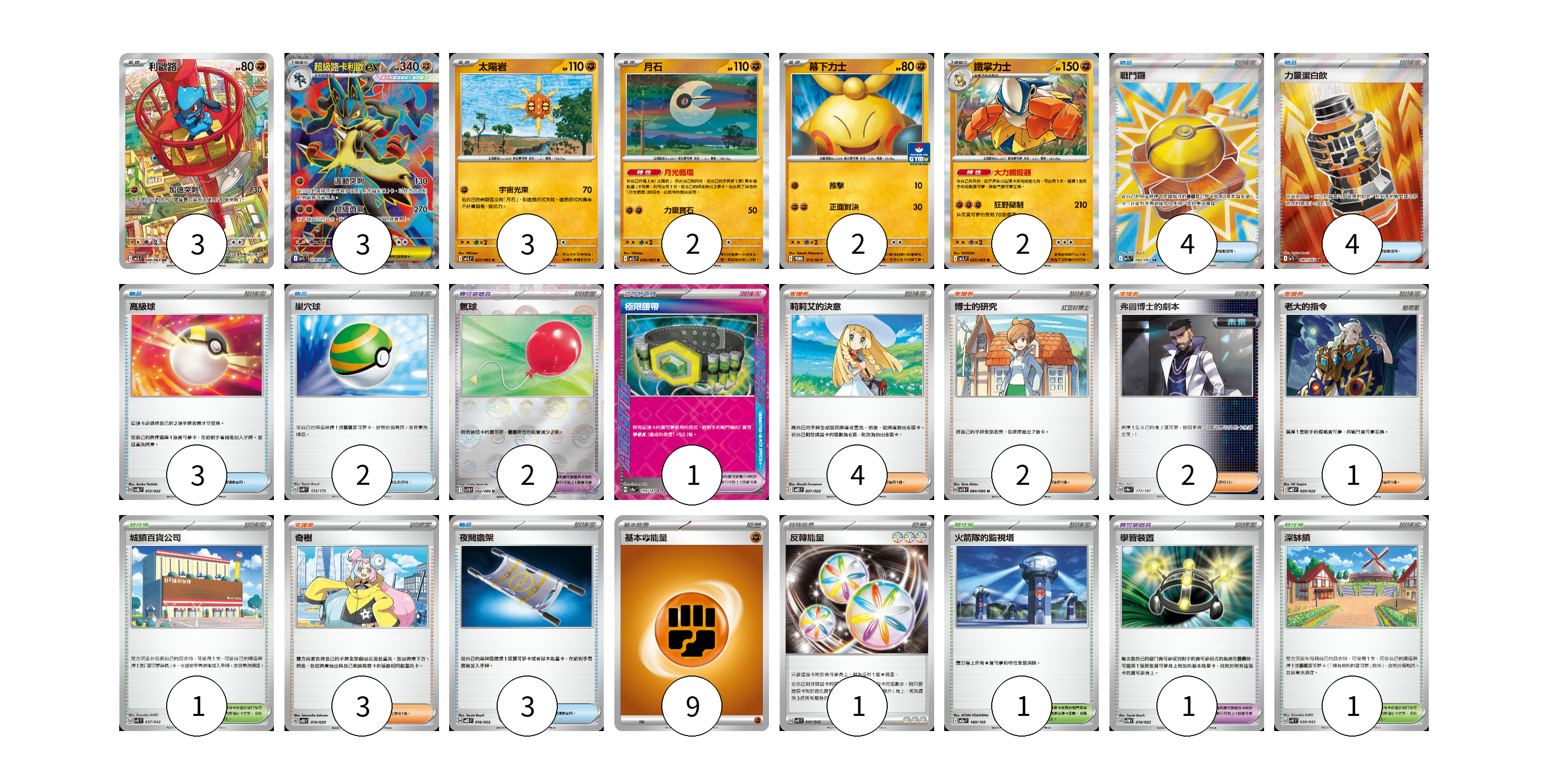 牌組構築方案 以此牌組為基礎新構築牌組 顯示卡面 顯示列表 寶可夢卡(15) 3 3 3 2 2 2 寶可夢道具(4) 2 1 1 物品卡(16) 4 4 3 2 3 支援者卡(12) 4 2 2 1 3 競技場卡(3) 1 1 1 能量卡(10) 9 1 寶可夢卡(15) 卡牌名稱 張數 卡牌名稱 張數 利歐路 M1L 068/063 03 超級路卡利歐ex M1L 078/063 03 太陽岩 M1L 027/063 03 月石 M1L 026/063 02 幕下力士 M-P 015/M-P 02 鐵掌力士 M1L 025/063 02 寶可夢道具(4) 卡牌名稱 張數 卡牌名稱 張數 氣球 SV11B 082/086 02 極限腰帶 SV8a 159/187 01 學習裝置 SVTM 016/022 01 物品卡(16) 卡牌名稱 張數 卡牌名稱 張數 戰鬥鑼 M1L 082/063 04 力量蛋白飲 M1L 081/063 04 高級球 SVQL 015/022 03 巢穴球 SVM 133/175 02 夜間擔架 MBD 016/022 03 支援者卡(12) 卡牌名稱 張數 卡牌名稱 張數 莉莉艾的決意 MBD 021/022 04 博士的研究 SV11B 084/086 02 弗圖博士的劇本 SV8a 175/187 02 老大的指令 MBD 020/022 01 奇樹 SVOD 016/020 03 競技場卡(3) 卡牌名稱 張數 卡牌名稱 張數 城鎮百貨公司 SVK 037/042 01 火箭隊的監視塔 M2a 189/193 01 深缽鎮 SVK 039/042 01 能量卡(10) 卡牌名稱 張數 卡牌名稱 張數 基本鬥能量 sv-p FIG 09 反轉能量 SVK 041/042 01 以此牌組為基礎新構築牌組 牌組編碼 HKsbdv-RuiRXr-yTOJhc copy 列印牌組單 牌組編碼已複製 分享至SNS