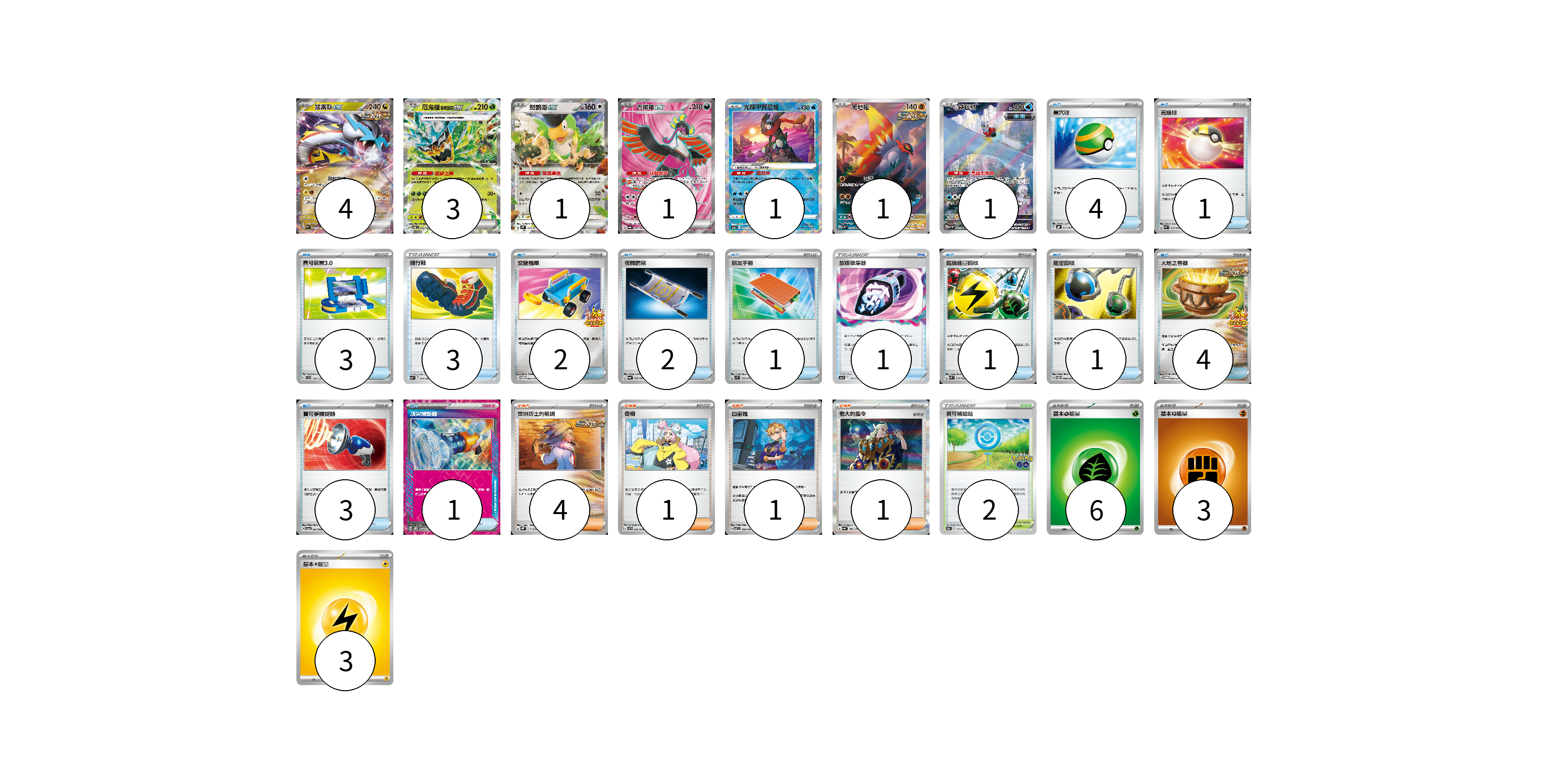 牌組構築方案 以此牌組為基礎新構築牌組 顯示卡面 顯示列表 寶可夢卡(12) 4 3 1 1 1 1 1 物品卡(27) 4 1 3 3 2 2 1 1 1 1 4 3 1 支援者卡(7) 4 1 1 1 競技場卡(2) 2 能量卡(12) 6 3 3 寶可夢卡(12) 卡牌名稱 張數 卡牌名稱 張數 猛雷鼓ex SV5K 053/071 04 厄鬼椪 碧草面具ex SV6 016/101 03 怒鸚哥ex SV2P 065/071 01 吉雉雞ex SV6a 081/064 01 光輝甲賀忍蛙 S12a 033/172 01 爬地翅 SV4K 074/066 01 鐵包袱 SV4M 071/066 01 物品卡(27) 卡牌名稱 張數 卡牌名稱 張數 巢穴球 SVHK 012/022 04 高級球 SVK 018/042 01 寶可裝置3.0 SVD 121/139 03 健行鞋 SVF 015/038 03 交替推車 SV-P 082/SV-P 02 夜間擔架 SV6a 056/064 02 朋友手冊 SV1S 069/078 01 放逐吸塵器 S12a 144/172 01 超級能量回收 SVK 010/042 01 能量回收 SVTM 009/022 01 大地之容器 SV-P 084/SV-P 04 寶可夢捕捉器 SV5a 057/066 03 頂尖捕捉器 SV5M 062/071 01 支援者卡(7) 卡牌名稱 張數 卡牌名稱 張數 奧琳博士的氣魄 SVHK 017/022 04 奇樹 SVF 029/038 01 白蕾雅 SV7 100/102 01 老大的指令 SV4a 181/190 01 競技場卡(2) 卡牌名稱 張數 卡牌名稱 張數 寶可補給站 S10b 071/071 02 能量卡(12) 卡牌名稱 張數 卡牌名稱 張數 基本【草】能量 SVF GRA 06 基本【鬥】能量 SVD FIG 03 基本【雷】能量 SVHM LIG 03 以此牌組為基礎新構築牌組 牌組編碼 HLTqvu-UNBDji-kPHaiq copy 列印牌組單 牌組編碼已複製 分享至SNS