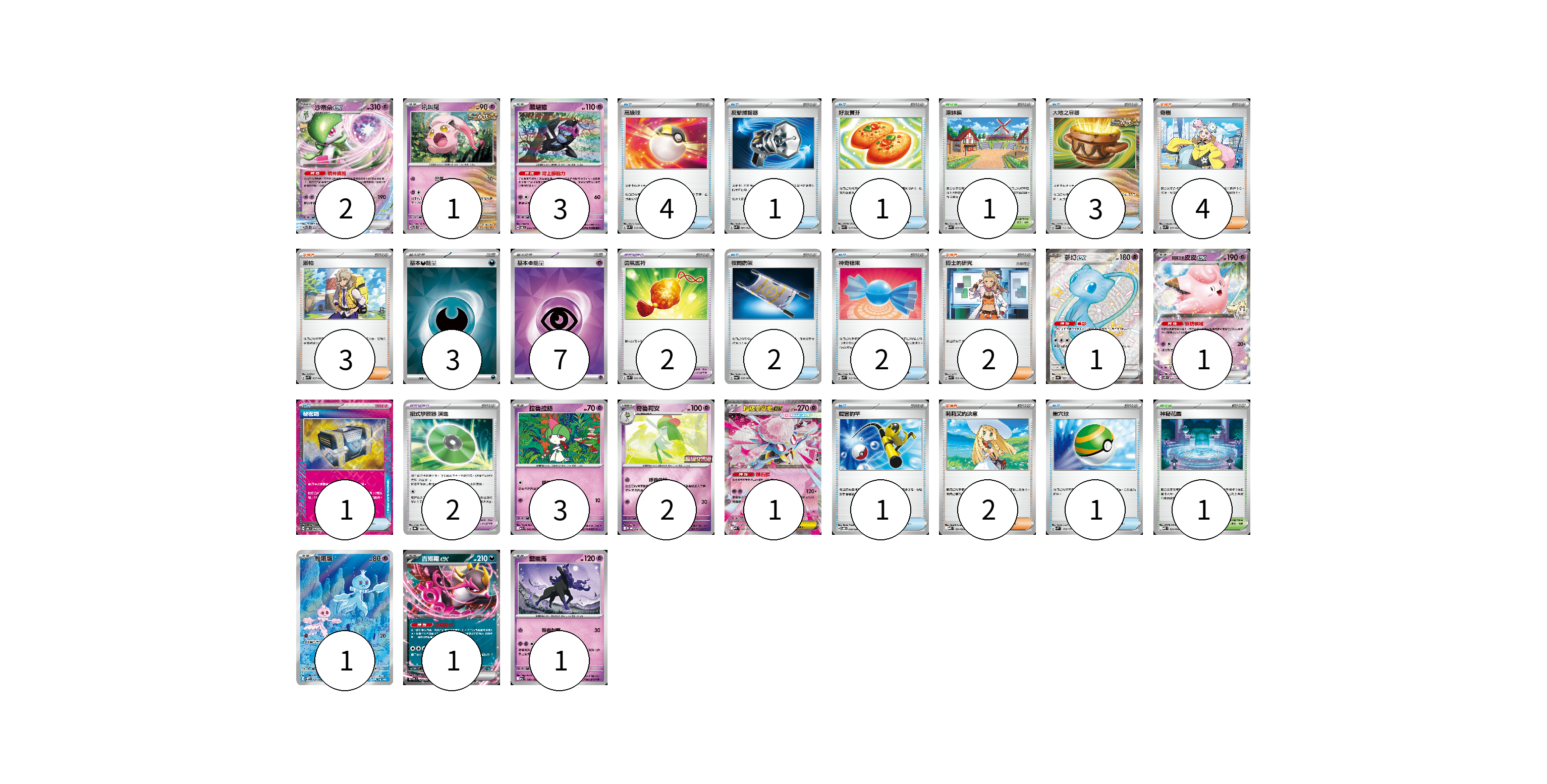 牌組構築方案 以此牌組為基礎新構築牌組 顯示卡面 顯示列表 寶可夢卡(17) 2 1 3 1 1 3 2 1 1 1 1 寶可夢道具(4) 2 2 物品卡(16) 4 1 1 3 2 2 1 1 1 支援者卡(11) 4 3 2 2 競技場卡(2) 1 1 能量卡(10) 3 7 寶可夢卡(17) 卡牌名稱 張數 卡牌名稱 張數 沙奈朵ex SVTS 004/022 02 吼叫尾 SVTS 007/022 01 願增猿 SV6 055/101 03 夢幻ex SV4a 327/190 01 莉莉艾的皮皮ex SV9 033/100 01 拉魯拉絲 M1S 040/063 03 奇魯莉安 M-P 006/M-P 02 超級蒂安希ex MBD 006/022 01 輕飄飄 SV11W 124/086 01 吉雉雞ex MC 489/742 01 靈幽馬 M2a 080/193 01 寶可夢道具(4) 卡牌名稱 張數 卡牌名稱 張數 勇氣護符 SVK 024/042 02 招式學習器 演進 SV8a 160/187 02 物品卡(16) 卡牌名稱 張數 卡牌名稱 張數 高級球 SVK 018/042 04 反擊捕捉器 SVK 009/042 01 好友寶芬 SVK 015/042 01 大地之容器 SVK 012/042 03 夜間擔架 SV6a 056/064 02 神奇糖果 SVK 019/042 02 秘密箱 SV6 092/101 01 厲害釣竿 SVOD 010/020 01 巢穴球 SVM 133/175 01 支援者卡(11) 卡牌名稱 張數 卡牌名稱 張數 奇樹 SVK 031/042 04 派帕 SVK 035/042 03 博士的研究 SVK 032/042 02 莉莉艾的決意 MBD 021/022 02 競技場卡(2) 卡牌名稱 張數 卡牌名稱 張數 深缽鎮 SVK 039/042 01 神秘花園 MBD 022/022 01 能量卡(10) 卡牌名稱 張數 卡牌名稱 張數 基本【惡】能量 SVK DAR 03 基本【超】能量 SVK PSY 07 以此牌組為基礎新構築牌組 牌組編碼 HMbjIr-gSRFhe-BvlzGo copy 列印牌組單 牌組編碼已複製 分享至SNS