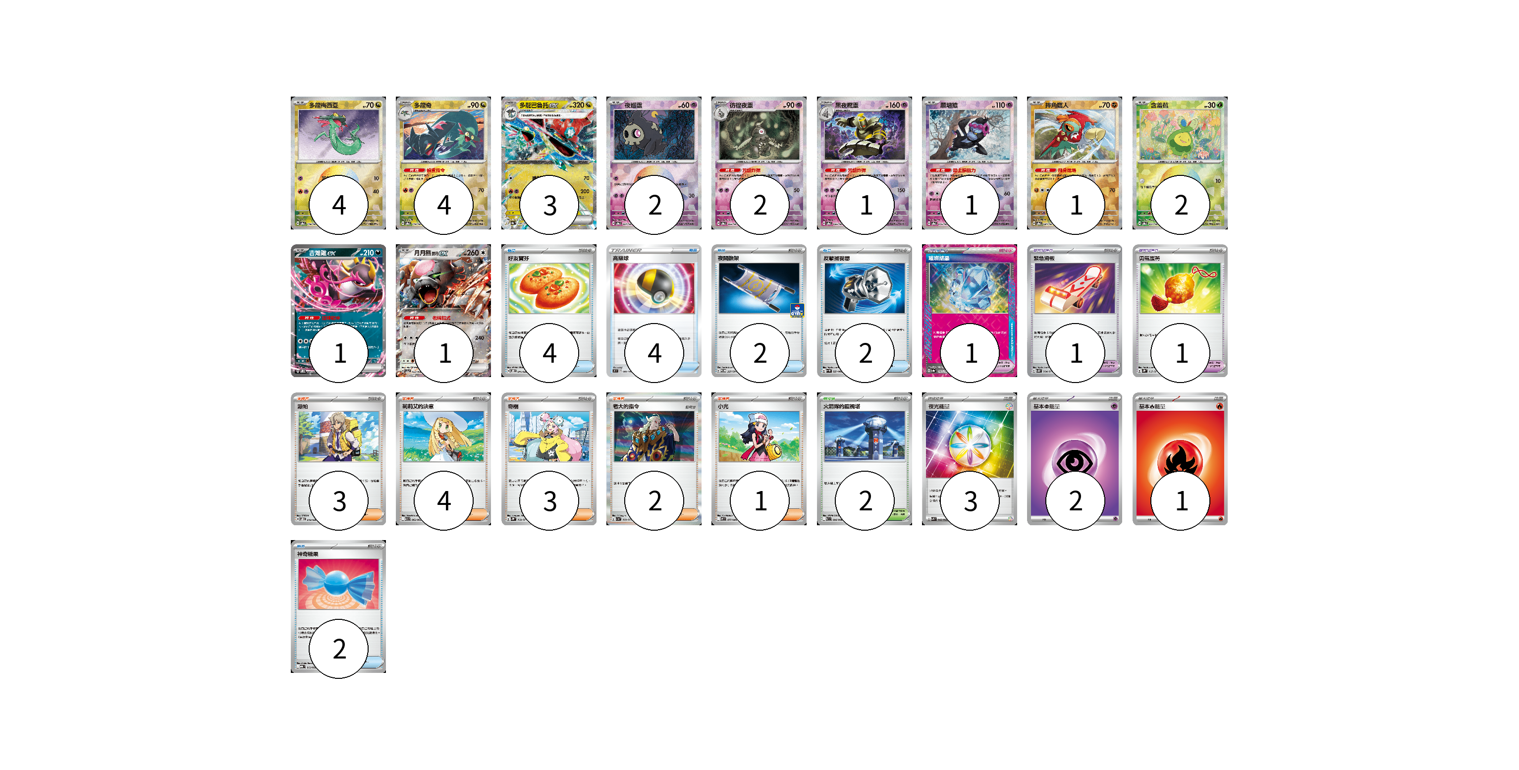 牌組構築方案 以此牌組為基礎新構築牌組 顯示卡面 顯示列表 寶可夢卡(22) 4 4 3 2 2 1 1 1 2 1 1 寶可夢道具(3) 1 1 1 物品卡(14) 4 4 2 2 2 支援者卡(13) 3 4 3 2 1 競技場卡(2) 2 能量卡(6) 3 2 1 寶可夢卡(22) 卡牌名稱 張數 卡牌名稱 張數 多龍梅西亞 SV8a 118/187 04 多龍奇 SV8a 119/187 04 多龍巴魯托ex SV8a 120/187 03 夜巡靈 SV8a 064/187 02 彷徨夜靈 SV8a 065/187 02 黑夜魔靈 SV8a 066/187 01 願增猿 SV8a 075/187 01 摔角鷹人 SV8a 084/187 01 含羞苞 SV8a 001/187 02 吉雉雞ex SVOD 004/020 01 月月熊 赫月 ex SV5a 052/066 01 寶可夢道具(3) 卡牌名稱 張數 卡牌名稱 張數 璀璨結晶 SV8a 152/187 01 緊急滑板 SV5K 064/071 01 勇氣護符 SV2D 067/071 01 物品卡(14) 卡牌名稱 張數 卡牌名稱 張數 好友寶芬 SVOD 011/020 04 高級球 S9 089/100 04 夜間擔架 SV-P 227/SV-P 02 反擊捕捉器 SV4M 059/066 02 神奇糖果 MBG 013/022 02 支援者卡(13) 卡牌名稱 張數 卡牌名稱 張數 派帕 SVOD 018/020 03 莉莉艾的決意 M1L 062/063 04 奇樹 SV2D 069/071 03 老大的指令 SV1a 069/073 02 小光 M2 077/080 01 競技場卡(2) 卡牌名稱 張數 卡牌名稱 張數 火箭隊的監視塔 SV10 096/098 02 能量卡(6) 卡牌名稱 張數 卡牌名稱 張數 夜光能量 SVK 042/042 03 基本超能量 sv-p PSY 02 基本火能量 sv-p FIR 01 以此牌組為基礎新構築牌組 牌組編碼 HNKBPA-DuZvFD-mUcriP copy 列印牌組單 牌組編碼已複製 分享至SNS
