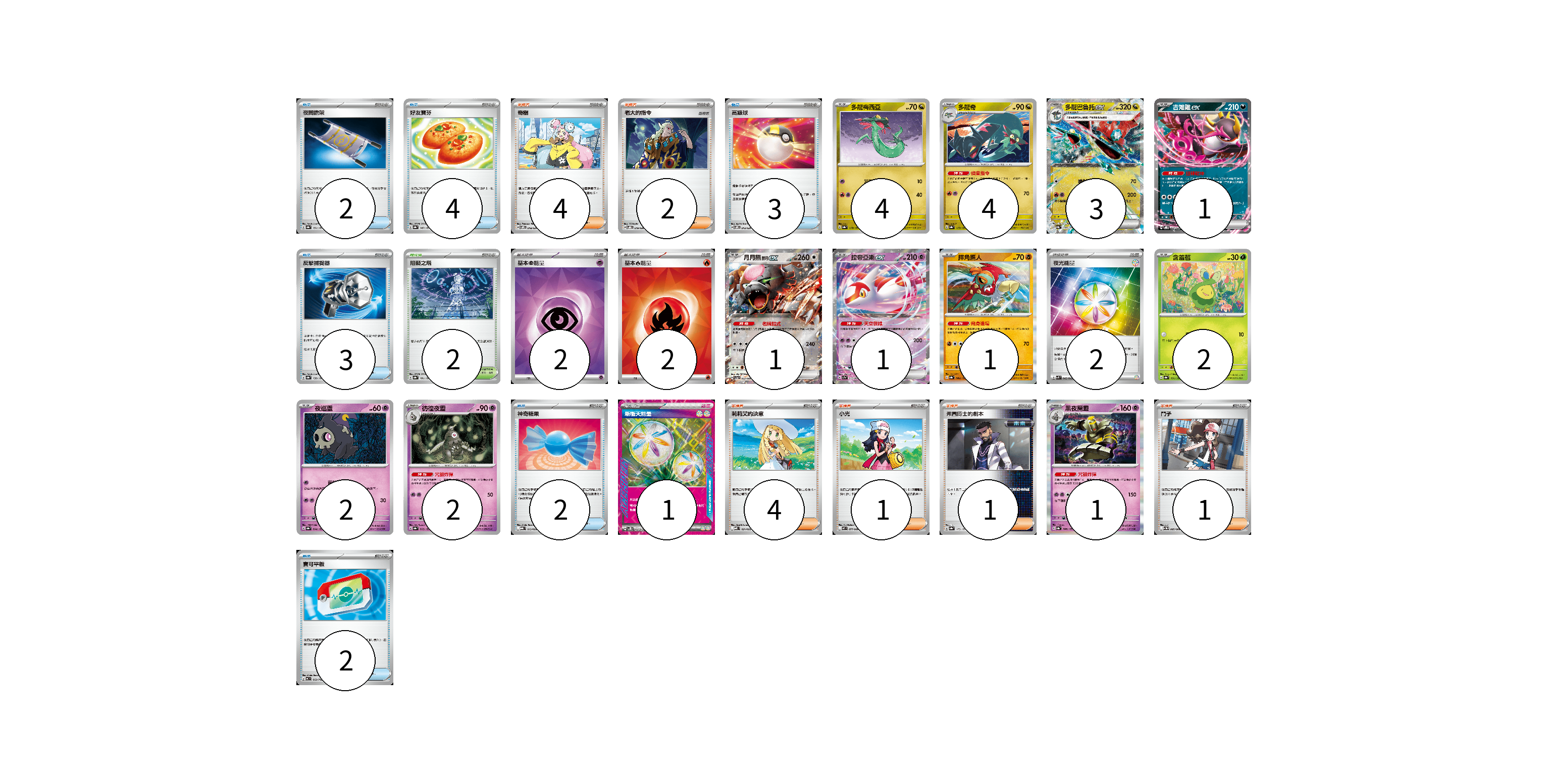 牌組構築方案 以此牌組為基礎新構築牌組 顯示卡面 顯示列表 寶可夢卡(22) 4 4 3 1 1 1 1 2 2 2 1 物品卡(16) 2 4 3 3 2 2 支援者卡(13) 4 2 4 1 1 1 競技場卡(2) 2 能量卡(7) 2 2 2 1 寶可夢卡(22) 卡牌名稱 張數 卡牌名稱 張數 多龍梅西亞 SV8a 118/187 04 多龍奇 SV8a 119/187 04 多龍巴魯托ex SV8a 120/187 03 吉雉雞ex SVOD 004/020 01 月月熊 赫月 ex SV5a 052/066 01 拉帝亞斯ex SV7a 019/064 01 摔角鷹人 SV8a 084/187 01 含羞苞 SV8a 001/187 02 夜巡靈 SV8a 064/187 02 彷徨夜靈 SV8a 065/187 02 黑夜魔靈 SV8a 066/187 01 物品卡(16) 卡牌名稱 張數 卡牌名稱 張數 夜間擔架 SV8a 151/187 02 好友寶芬 SV8a 147/187 04 高級球 SVOM 013/021 03 反擊捕捉器 SV8a 139/187 03 神奇糖果 MBG 013/022 02 寶可平板 MC 662/742 02 支援者卡(13) 卡牌名稱 張數 卡牌名稱 張數 奇樹 SVOM 018/021 04 老大的指令 SVOD 019/020 02 莉莉艾的決意 MBD 021/022 04 小光 M2 077/080 01 弗圖博士的劇本 SV8a 175/187 01 鬥子 SV11W 085/086 01 競技場卡(2) 卡牌名稱 張數 卡牌名稱 張數 阻礙之塔 SV8a 181/187 02 能量卡(7) 卡牌名稱 張數 卡牌名稱 張數 基本【超】能量 SVOD PSY 02 基本【火】能量 SVK FIR 02 夜光能量 SVK 042/042 02 新衝天能量 SV5K 071/071 01 以此牌組為基礎新構築牌組 牌組編碼 HNpyqe-sCvpoj-QDeOgZ copy 列印牌組單 牌組編碼已複製 分享至SNS