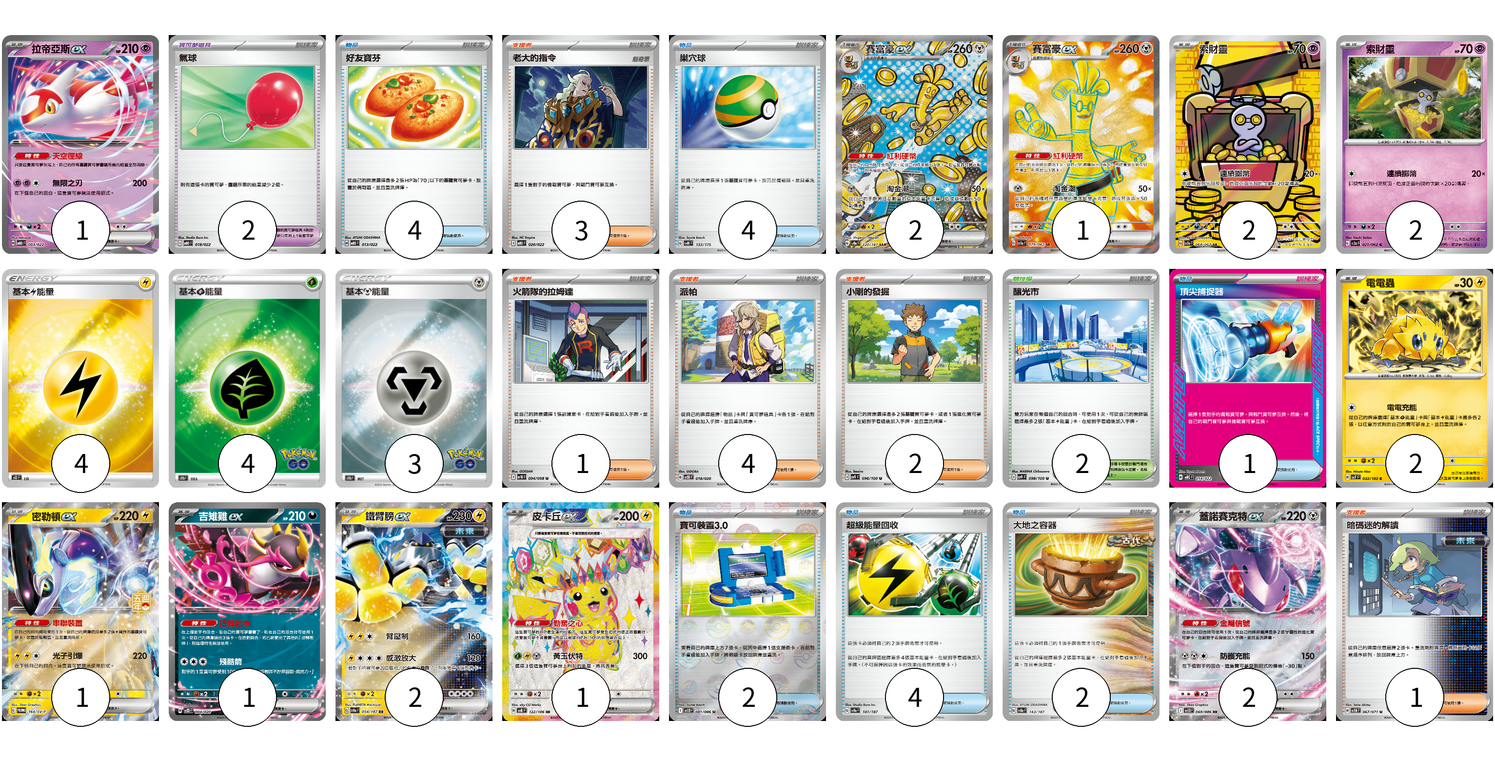 牌組構築方案 以此牌組為基礎新構築牌組 顯示卡面 顯示列表 寶可夢卡(17) 1 2 1 2 2 2 1 1 2 1 2 寶可夢道具(2) 2 物品卡(17) 4 4 1 2 4 2 支援者卡(11) 3 1 4 2 1 競技場卡(2) 2 能量卡(11) 4 4 3 寶可夢卡(17) 卡牌名稱 張數 卡牌名稱 張數 拉帝亞斯ex MBD 003/022 01 賽富豪ex SV8a 220/187 02 賽富豪ex SV3a 079/062 01 索財靈 SV3a 068/062 02 索財靈 SV3a 021/062 02 電電蟲 SV7 032/102 02 密勒頓ex SV-P 164/SV-P 01 吉雉雞ex SVOD 004/020 01 鐵臂膀ex SV8a 054/187 02 皮卡丘ex SV8 122/106 01 蓋諾賽克特ex SV11B 069/086 02 寶可夢道具(2) 卡牌名稱 張數 卡牌名稱 張數 氣球 MBD 018/022 02 物品卡(17) 卡牌名稱 張數 卡牌名稱 張數 好友寶芬 MBD 013/022 04 巢穴球 SVM 133/175 04 頂尖捕捉器 MBG 014/022 01 寶可裝置3.0 SV11B 081/086 02 超級能量回收 SV8a 141/187 04 大地之容器 SV8a 143/187 02 支援者卡(11) 卡牌名稱 張數 卡牌名稱 張數 老大的指令 MBD 020/022 03 火箭隊的拉姆達 SV10 094/098 01 派帕 SVOD 018/020 04 小剛的發掘 SV9 096/100 02 暗碼迷的解讀 SV5M 067/071 01 競技場卡(2) 卡牌名稱 張數 卡牌名稱 張數 釀光市 SV9 098/100 02 能量卡(11) 卡牌名稱 張數 卡牌名稱 張數 基本【雷】能量 SO LIG 04 基本草能量 S10b GRA 04 基本鋼能量 S10b MET 03 以此牌組為基礎新構築牌組 牌組編碼 HQehvs-jHElnX-RRABRl copy 列印牌組單 牌組編碼已複製 分享至SNS