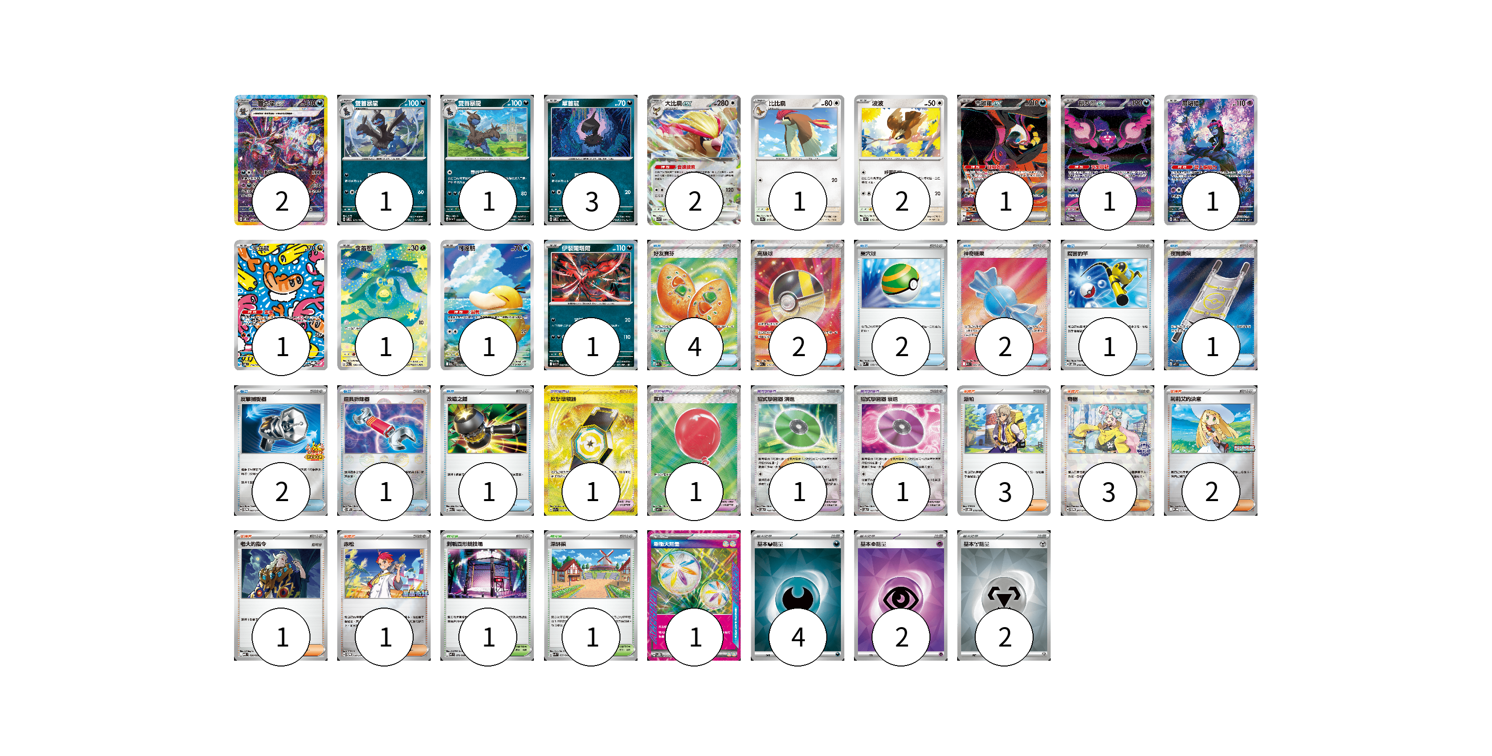 牌組構築方案 以此牌組為基礎新構築牌組 顯示卡面 顯示列表 寶可夢卡(19) 2 1 1 3 2 1 2 1 1 1 1 1 1 1 寶可夢道具(4) 1 1 1 1 物品卡(16) 4 2 2 2 1 1 2 1 1 支援者卡(10) 3 3 2 1 1 競技場卡(2) 1 1 能量卡(9) 1 4 2 2 寶可夢卡(19) 卡牌名稱 張數 卡牌名稱 張數 三首惡龍ex SV8 133/106 02 雙首暴龍 SV8 071/106 01 雙首暴龍 SV1a 058/073 01 單首龍 SV8 070/106 03 大比鳥ex SV3 089/108 02 比比鳥 SV2a 017/165 01 波波 SV2a 016/165 02 吉雉雞ex SV6a 089/064 01 桃歹郎ex SV6a 090/064 01 願增猿 SV6 107/101 01 米立龍 SV6 112/101 01 含羞苞 M2a 196/193 01 可達鴨 M2a 199/193 01 伊裴爾塔爾 M1L 040/063 01 寶可夢道具(4) 卡牌名稱 張數 卡牌名稱 張數 反擊增幅器 SV7a 093/064 01 氣球 M1L 084/063 01 招式學習器 演進 SV8a 160/187 01 招式學習器 衰退 SV8a 161/187 01 物品卡(16) 卡牌名稱 張數 卡牌名稱 張數 好友寶芬 M1S 081/063 04 高級球 M2a 216/193 02 巢穴球 SVM 133/175 02 神奇糖果 M1S 082/063 02 厲害釣竿 SVOD 010/020 01 夜間擔架 M1L 083/063 01 反擊捕捉器 SV-P 083/SV-P 02 道具拆除器 SV11W 080/086 01 改造之錘 M2a 148/193 01 支援者卡(10) 卡牌名稱 張數 卡牌名稱 張數 派帕 SVOD 018/020 03 奇樹 SV-P 247/SV-P 03 莉莉艾的決意 M-P 011/M-P 02 老大的指令 MBD 020/022 01 赤松 SV-P 150/SV-P 01 競技場卡(2) 卡牌名稱 張數 卡牌名稱 張數 對戰圓形競技場 M2 079/080 01 深缽鎮 SVK 039/042 01 能量卡(9) 卡牌名稱 張數 卡牌名稱 張數 新衝天能量 SV5K 071/071 01 基本【惡】能量 SVK DAR 04 基本【超】能量 SVK PSY 02 基本【鋼】能量 SVK MET 02 以此牌組為基礎新構築牌組 牌組編碼 HQwSKZ-WqlAzN-WYBkxH copy 列印牌組單 牌組編碼已複製 分享至SNS
