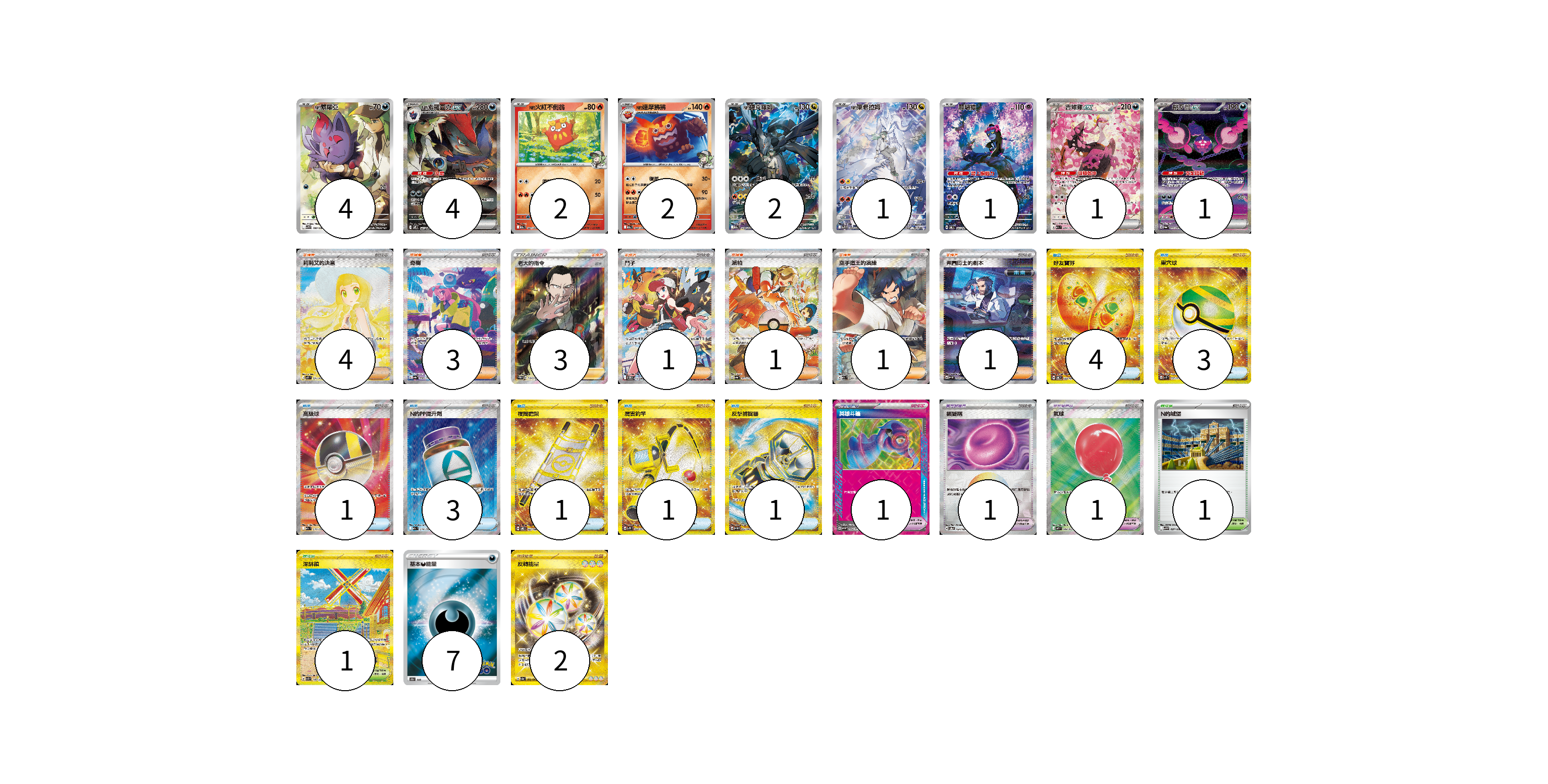 牌組構築方案 以此牌組為基礎新構築牌組 顯示卡面 顯示列表 寶可夢卡(18) 4 4 2 2 2 1 1 1 1 寶可夢道具(3) 1 1 1 物品卡(14) 4 3 1 3 1 1 1 支援者卡(14) 4 3 3 1 1 1 1 競技場卡(2) 1 1 能量卡(9) 7 2 寶可夢卡(18) 卡牌名稱 張數 卡牌名稱 張數 N的索羅亞 SV9 108/100 04 N的索羅亞克ex SV9 127/100 04 N的火紅不倒翁 M2a 027/193 02 N的達摩狒狒 M2a 028/193 02 N的捷克羅姆 M2a 210/193 02 N的萊希拉姆 SV9 109/100 01 願增猿 SV6 107/101 01 吉雉雞ex M2a 244/193 01 桃歹郎ex SV6a 090/064 01 寶可夢道具(3) 卡牌名稱 張數 卡牌名稱 張數 英雄斗篷 SV5M 064/071 01 鎖鏈糬 SV8a 154/187 01 氣球 M1L 084/063 01 物品卡(14) 卡牌名稱 張數 卡牌名稱 張數 好友寶芬 SV6 133/101 04 巢穴球 SV1S 107/078 03 高級球 M2a 216/193 01 N的PP提升劑 M2a 214/193 03 夜間擔架 SV8 137/106 01 厲害釣竿 SV2P 098/071 01 反擊捕捉器 SV4M 094/066 01 支援者卡(14) 卡牌名稱 張數 卡牌名稱 張數 莉莉艾的決意 M1L 091/063 04 奇樹 SV4a 350/190 03 老大的指令(坂木) SC1b 170/153 03 鬥子 SV11W 173/086 01 派帕 SV4a 353/190 01 空手道王的演練 M2a 220/193 01 弗圖博士的劇本 SV4M 091/066 01 競技場卡(2) 卡牌名稱 張數 卡牌名稱 張數 N的城堡 SV9 097/100 01 深缽鎮 SV3 140/108 01 能量卡(9) 卡牌名稱 張數 卡牌名稱 張數 基本惡能量 S10b DAR 07 反轉能量 SV3a 092/062 02 以此牌組為基礎新構築牌組 牌組編碼 HRAwKe-dSElMz-mTkqog copy 列印牌組單 牌組編碼已複製 分享至SNS