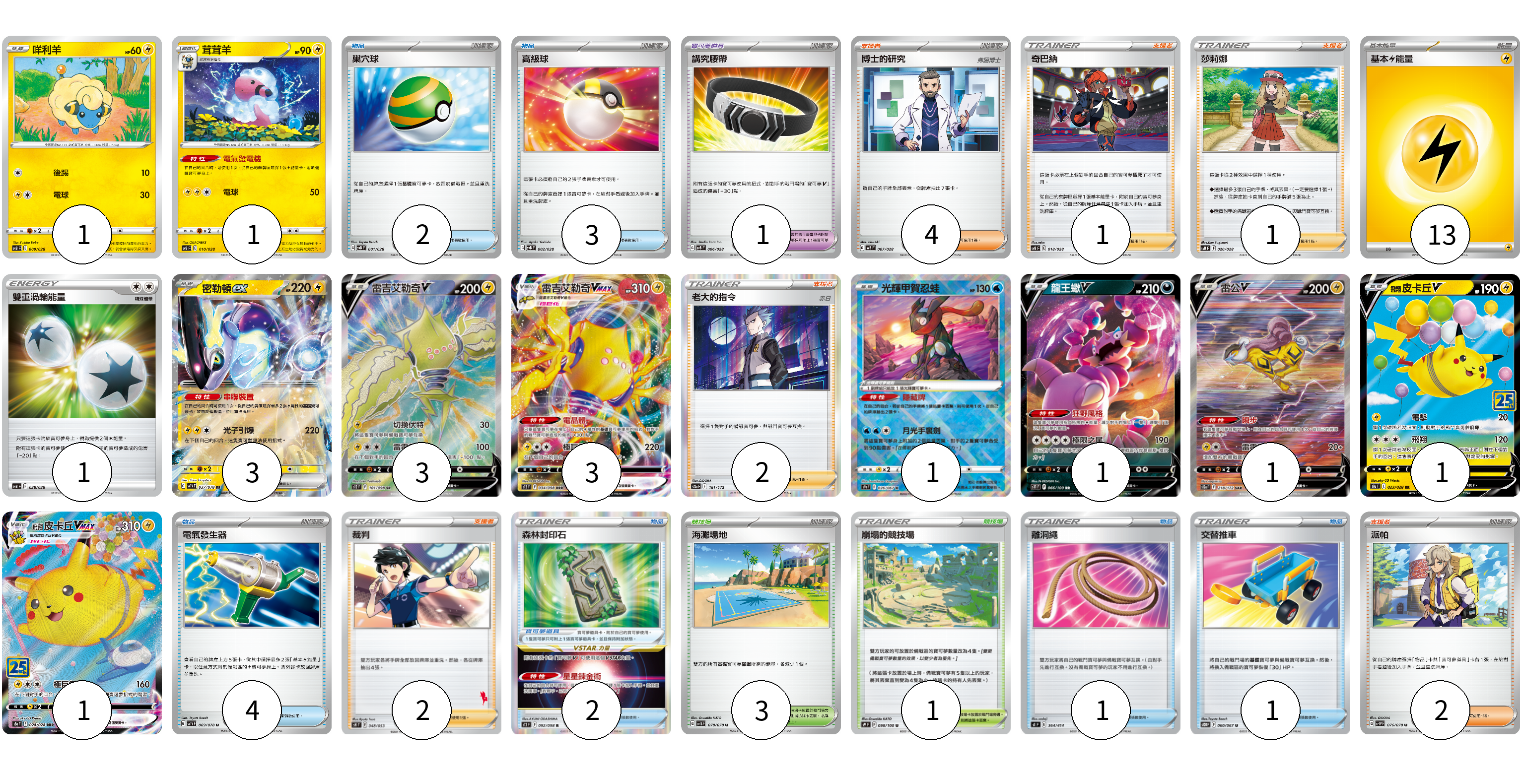 牌組構築方案 以此牌組為基礎新構築牌組 顯示卡面 顯示列表 寶可夢卡(16) 1 1 3 3 3 1 1 1 1 1 寶可夢道具(3) 1 2 物品卡(11) 2 3 4 1 1 支援者卡(12) 4 1 1 2 2 2 競技場卡(4) 3 1 能量卡(14) 13 1 寶可夢卡(16) 卡牌名稱 張數 卡牌名稱 張數 咩利羊 SVB 009/028 01 茸茸羊 SVB 010/028 01 密勒頓ex SV1V 037/078 03 雷吉艾勒奇V S12 101/098 03 雷吉艾勒奇VMAX S12 034/098 03 光輝甲賀忍蛙 S9a 026/067 01 龍王蠍V S11 066/100 01 雷公V S12a 218/172 01 飛翔皮卡丘V S8a 023/028 01 飛翔皮卡丘VMAX S8a 024/028 01 寶可夢道具(3) 卡牌名稱 張數 卡牌名稱 張數 講究腰帶 SVB 006/028 01 森林封印石 S12 092/098 02 物品卡(11) 卡牌名稱 張數 卡牌名稱 張數 巢穴球 SVB 001/028 02 高級球 SVB 002/028 03 電氣發生器 SV1V 069/078 04 離洞繩 SI 364/414 01 交替推車 S10D 060/067 01 支援者卡(12) 卡牌名稱 張數 卡牌名稱 張數 博士的研究(奧琳博士) SVB 007/028 04 奇巴納 SVB 018/028 01 莎莉娜 SVB 020/028 01 老大的指令(赤日) S12a 161/172 02 裁判 SH 048/053 02 派帕 SV1V 076/078 02 競技場卡(4) 卡牌名稱 張數 卡牌名稱 張數 海灘場地 SV1S 078/078 03 崩塌的競技場 S9 098/100 01 能量卡(14) 卡牌名稱 張數 卡牌名稱 張數 基本【雷】能量 SVB LIG 13 雙重渦輪能量 SVB 028/028 01 以此牌組為基礎新構築牌組 牌組編碼 HRLcBt-suTanC-HdZZHL copy 列印牌組單 牌組編碼已複製 分享至SNS