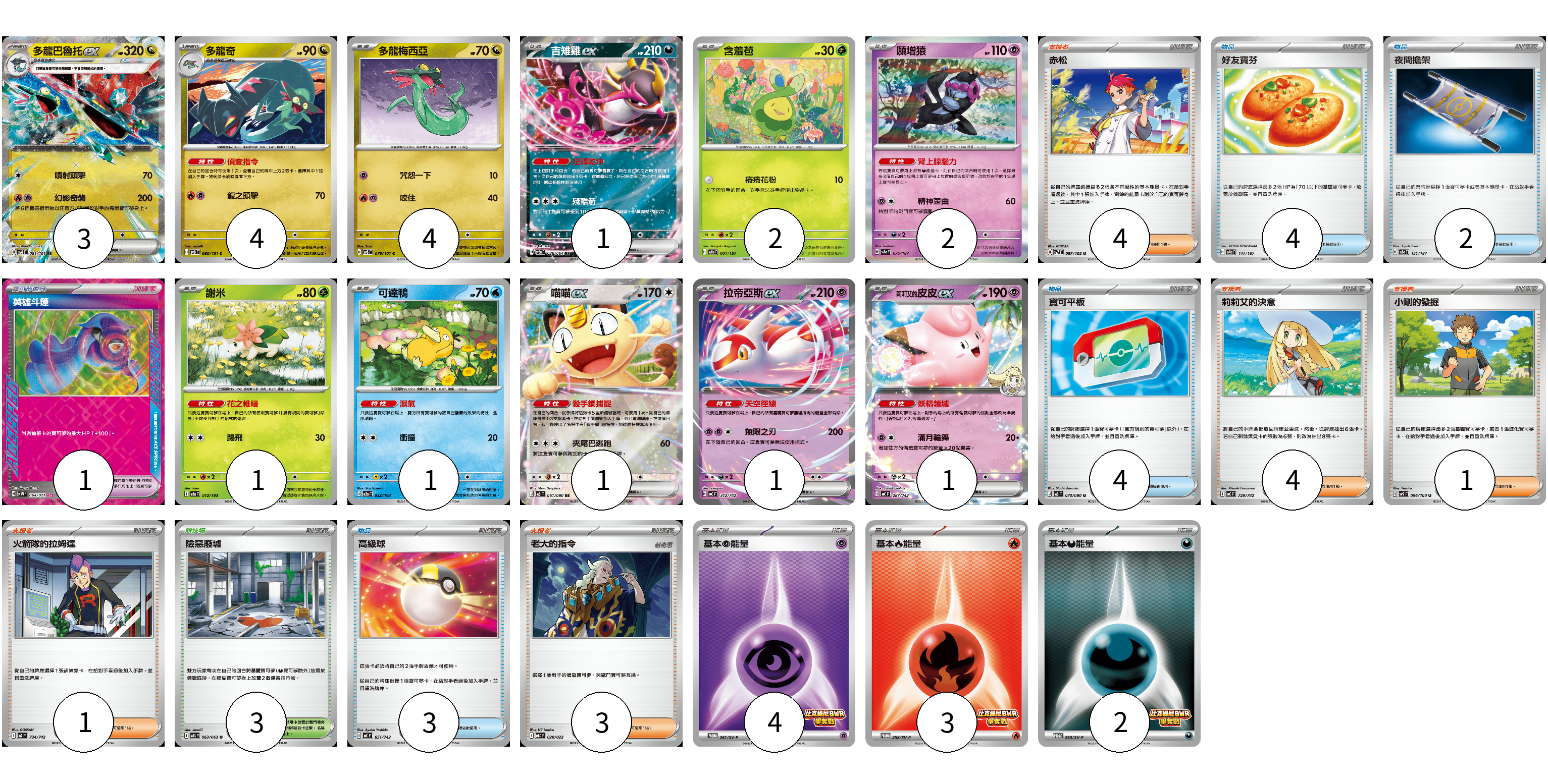 牌組構築方案 以此牌組為基礎新構築牌組 顯示卡面 顯示列表 寶可夢卡(21) 3 4 4 1 2 2 1 1 1 1 1 寶可夢道具(1) 1 物品卡(13) 4 2 4 3 支援者卡(13) 4 4 1 1 3 競技場卡(3) 3 能量卡(9) 4 3 2 寶可夢卡(21) 卡牌名稱 張數 卡牌名稱 張數 多龍巴魯托ex SV6 081/101 03 多龍奇 SV6 080/101 04 多龍梅西亞 SV6 079/101 04 吉雉雞ex SV6a 038/064 01 含羞苞 SV8a 001/187 02 願增猿 SV8a 075/187 02 謝米 M2a 012/193 01 可達鴨 M2a 032/193 01 喵喵ex M3 061/080 01 拉帝亞斯ex MC 312/742 01 <莉莉艾的>皮皮ex MC 287/742 01 寶可夢道具(1) 卡牌名稱 張數 卡牌名稱 張數 英雄斗篷 SV5M 064/071 01 物品卡(13) 卡牌名稱 張數 卡牌名稱 張數 好友寶芬 SV8a 147/187 04 夜間擔架 SV8a 151/187 02 寶可平板 M3 070/080 04 高級球 MC 651/742 03 支援者卡(13) 卡牌名稱 張數 卡牌名稱 張數 赤松 SV7 097/102 04 莉莉艾的決意 MC 729/742 04 小剛的發掘 SV9 096/100 01 火箭隊的拉姆達 MC 734/742 01 老大的指令 MBD 020/022 03 競技場卡(3) 卡牌名稱 張數 卡牌名稱 張數 險惡廢墟 M1L 063/063 03 能量卡(9) 卡牌名稱 張數 卡牌名稱 張數 基本【超】能量 SV-P 261/SV-P 04 基本【火】能量 SV-P 258/SV-P 03 基本【惡】能量 SV-P 263/SV-P 02 以此牌組為基礎新構築牌組 牌組編碼 HRchsB-AMrCFT-wpjIVr copy 列印牌組單 牌組編碼已複製 分享至SNS