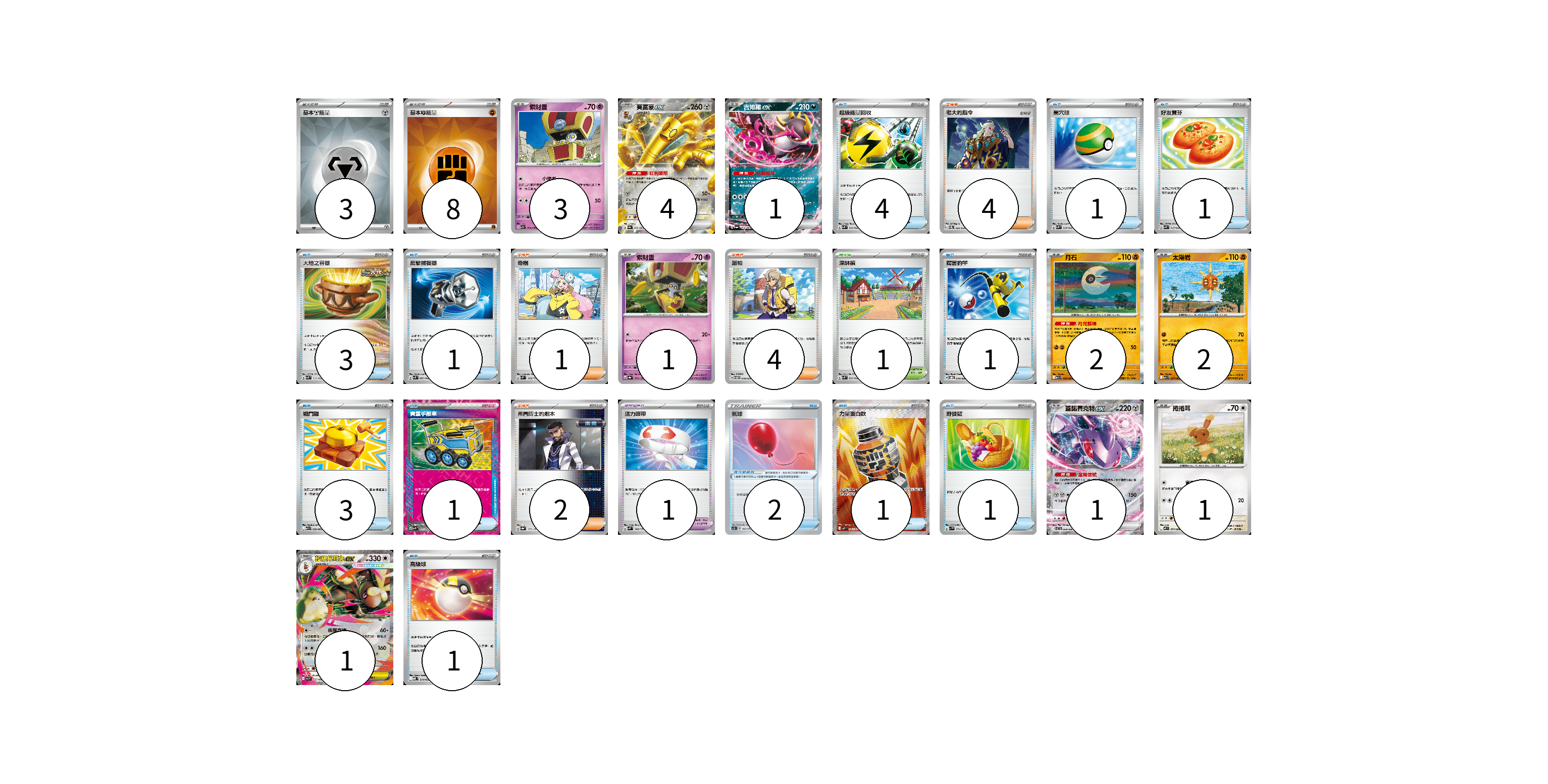 牌組構築方案 以此牌組為基礎新構築牌組 顯示卡面 顯示列表 寶可夢卡(16) 3 4 1 1 2 2 1 1 1 寶可夢道具(3) 1 2 物品卡(18) 4 1 1 3 1 1 3 1 1 1 1 支援者卡(11) 4 1 4 2 競技場卡(1) 1 能量卡(11) 3 8 寶可夢卡(16) 卡牌名稱 張數 卡牌名稱 張數 索財靈 SV7a 024/064 03 賽富豪ex SV3a 050/062 04 吉雉雞ex SV6a 038/064 01 索財靈 SV8a 073/187 01 月石 M1L 026/063 02 太陽岩 M1L 027/063 02 蓋諾賽克特ex SV11B 069/086 01 捲捲耳 M2 071/080 01 超級長耳兔ex M2 072/080 01 寶可夢道具(3) 卡牌名稱 張數 卡牌名稱 張數 活力頭帶 SVM 140/175 01 氣球 SC1b 142/153 02 物品卡(18) 卡牌名稱 張數 卡牌名稱 張數 超級能量回收 SVK 010/042 04 巢穴球 SVK 016/042 01 好友寶芬 SVK 015/042 01 大地之容器 SVK 012/042 03 反擊捕捉器 SVK 009/042 01 厲害釣竿 SVOD 010/020 01 戰鬥鑼 M1L 059/063 03 貴重手推車 SVK 020/042 01 力量蛋白飲 M1L 081/063 01 野餐籃 SV1V 071/078 01 高級球 MBD 014/022 01 支援者卡(11) 卡牌名稱 張數 卡牌名稱 張數 老大的指令 SVEM 020/020 04 奇樹 SVM 160/175 01 派帕 SVTM 019/022 04 弗圖博士的劇本 SV8a 175/187 02 競技場卡(1) 卡牌名稱 張數 卡牌名稱 張數 深缽鎮 SVK 039/042 01 能量卡(11) 卡牌名稱 張數 卡牌名稱 張數 基本【鋼】能量 SVK MET 03 基本【鬥】能量 SVK FIG 08 以此牌組為基礎新構築牌組 牌組編碼 HTGcRn-naqTkz-hUMFCj copy 列印牌組單 牌組編碼已複製 分享至SNS