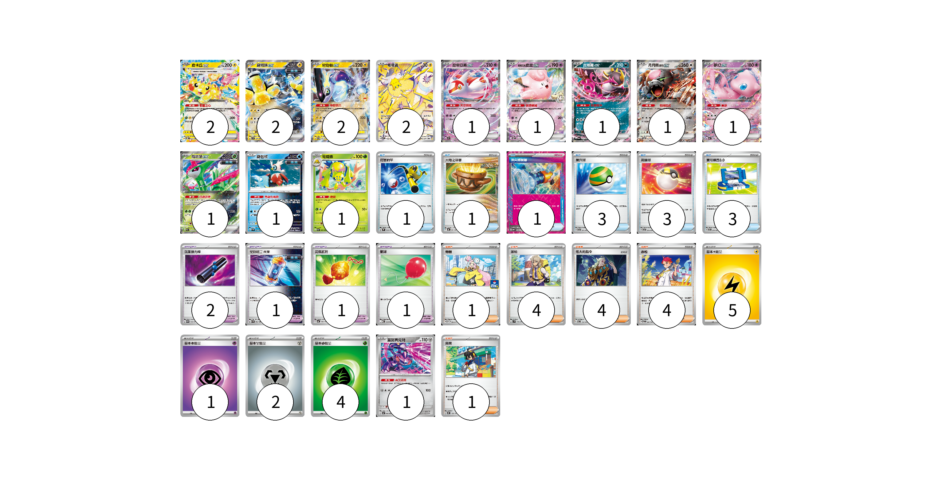 牌組構築方案 以此牌組為基礎新構築牌組 顯示卡面 顯示列表 寶可夢卡(17) 2 2 2 2 1 1 1 1 1 1 1 1 1 寶可夢道具(5) 2 1 1 1 物品卡(12) 1 1 1 3 3 3 支援者卡(14) 1 4 4 4 1 能量卡(12) 5 1 2 4 寶可夢卡(17) 卡牌名稱 張數 卡牌名稱 張數 皮卡丘ex SV8 033/106 02 鐵臂膀ex SV4M 027/066 02 密勒頓ex SV-P 164/SV-P 02 電電蟲 SV7 108/102 02 拉帝亞斯ex SV7a 019/064 01 莉莉艾的皮皮ex SV9 033/100 01 吉雉雞ex SV6a 038/064 01 月月熊 赫月 ex SV5a 052/066 01 夢幻ex SV4a 076/190 01 鐵斑葉ex SV5M 016/071 01 鐵包袱 SV4M 020/066 01 電蜘蛛 SV6a 002/064 01 蓋諾賽克特 SV6a 040/064 01 寶可夢道具(5) 卡牌名稱 張數 卡牌名稱 張數 沉重接力棒 SV5M 066/071 02 驅勁能量 未來 SV4M 062/066 01 勇氣護符 SV4a 169/190 01 氣球 MBD 018/022 01 物品卡(12) 卡牌名稱 張數 卡牌名稱 張數 厲害釣竿 SV2P 066/071 01 大地之容器 SV4K 060/066 01 頂尖捕捉器 SV8a 148/187 01 巢穴球 SVTL 011/021 03 高級球 SVTL 012/021 03 寶可裝置3.0 SVTL 014/021 03 支援者卡(14) 卡牌名稱 張數 卡牌名稱 張數 奇樹 SV-P 106/SV-P 01 派帕 SV1V 076/078 04 老大的指令 SVEL 019/020 04 赤松 SV7 097/102 04 烏栗 SV8a 169/187 01 能量卡(12) 卡牌名稱 張數 卡牌名稱 張數 基本雷能量 sv-p LIG 05 基本超能量 sv-p PSY 01 基本鋼能量 sv-p MET 02 基本草能量 sv-p GRA 04 以此牌組為基礎新構築牌組 牌組編碼 HUdtFw-coTkBL-TnPvyA copy 列印牌組單 牌組編碼已複製 分享至SNS