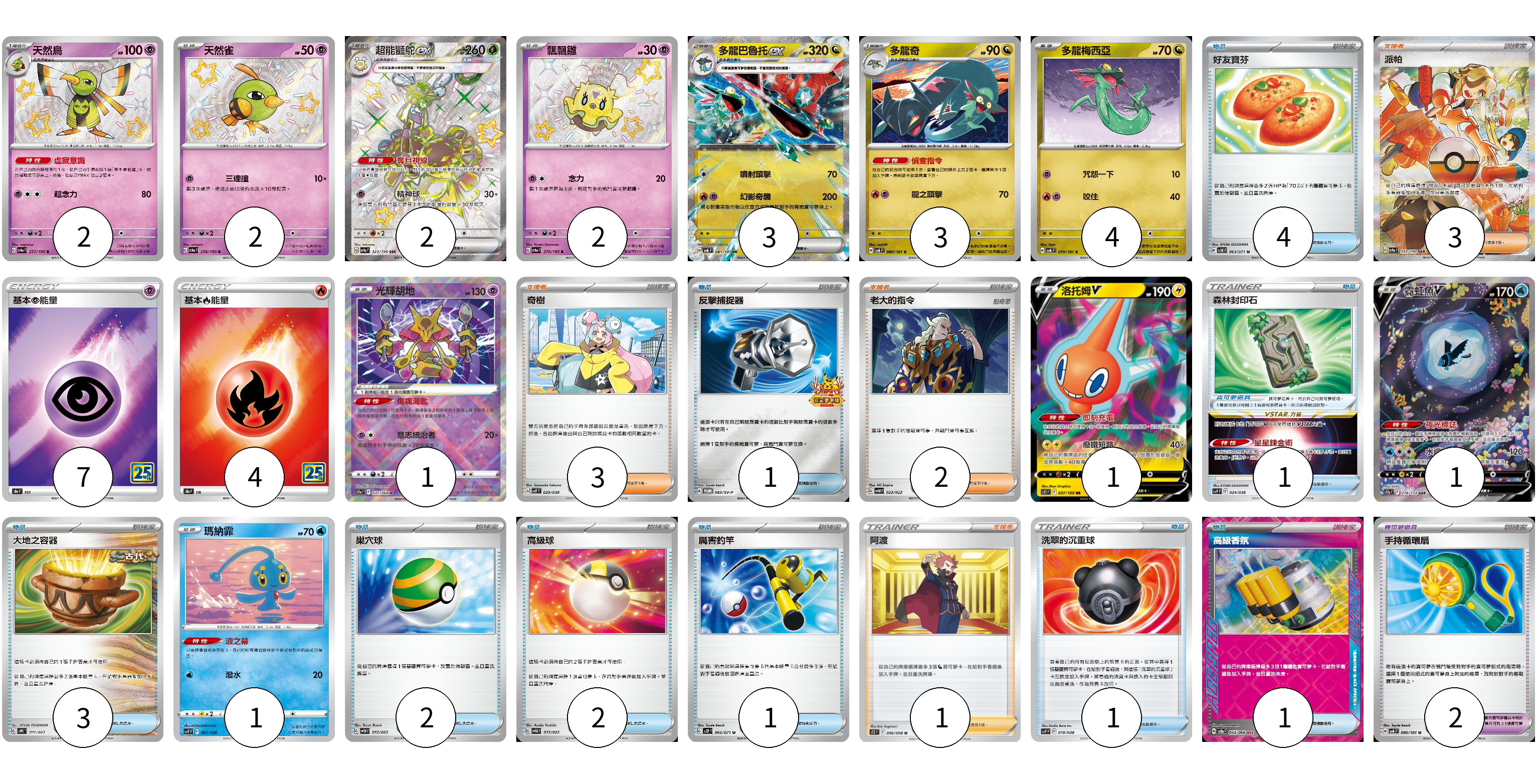 牌組構築方案 以此牌組為基礎新構築牌組 顯示卡面 顯示列表 寶可夢卡(22) 2 2 2 2 3 3 4 1 1 1 1 寶可夢道具(2) 2 物品卡(16) 4 1 1 3 2 2 1 1 1 支援者卡(9) 3 3 2 1 能量卡(11) 7 4 寶可夢卡(22) 卡牌名稱 張數 卡牌名稱 張數 天然鳥 SV4a 257/190 02 天然雀 SV4a 256/190 02 超能豔鴕ex SV4a 323/190 02 飄飄雛 SV4a 270/190 02 多龍巴魯托ex SV6 081/101 03 多龍奇 SV6 080/101 03 多龍梅西亞 SV6 079/101 04 光輝胡地 S11a 031/068 01 洛托姆V S11 037/100 01 霓虹魚V S12a 216/172 01 瑪納霏 SVF 003/038 01 寶可夢道具(2) 卡牌名稱 張數 卡牌名稱 張數 手持循環扇 SV6 095/101 02 物品卡(16) 卡牌名稱 張數 卡牌名稱 張數 好友寶芬 SV5K 063/071 04 反擊捕捉器 SV-P 083/SV-P 01 森林封印石 SVF 024/038 01 大地之容器 SVHK 011/022 03 巢穴球 SVHM 012/022 02 高級球 SVHM 013/022 02 厲害釣竿 SV2P 066/071 01 洗翠的沉重球 SVF 019/038 01 高級香氛 SV5a 055/066 01 支援者卡(9) 卡牌名稱 張數 卡牌名稱 張數 派帕 SV4a 353/190 03 奇樹 SVF 029/038 03 老大的指令 SVHM 022/022 02 阿渡 S12 096/098 01 能量卡(11) 卡牌名稱 張數 卡牌名稱 張數 基本超能量 S8a PSY 07 基本火能量 S8a FIR 04 以此牌組為基礎新構築牌組 牌組編碼 HYnuUK-jwkRmz-guozsP copy 列印牌組單 牌組編碼已複製 分享至SNS