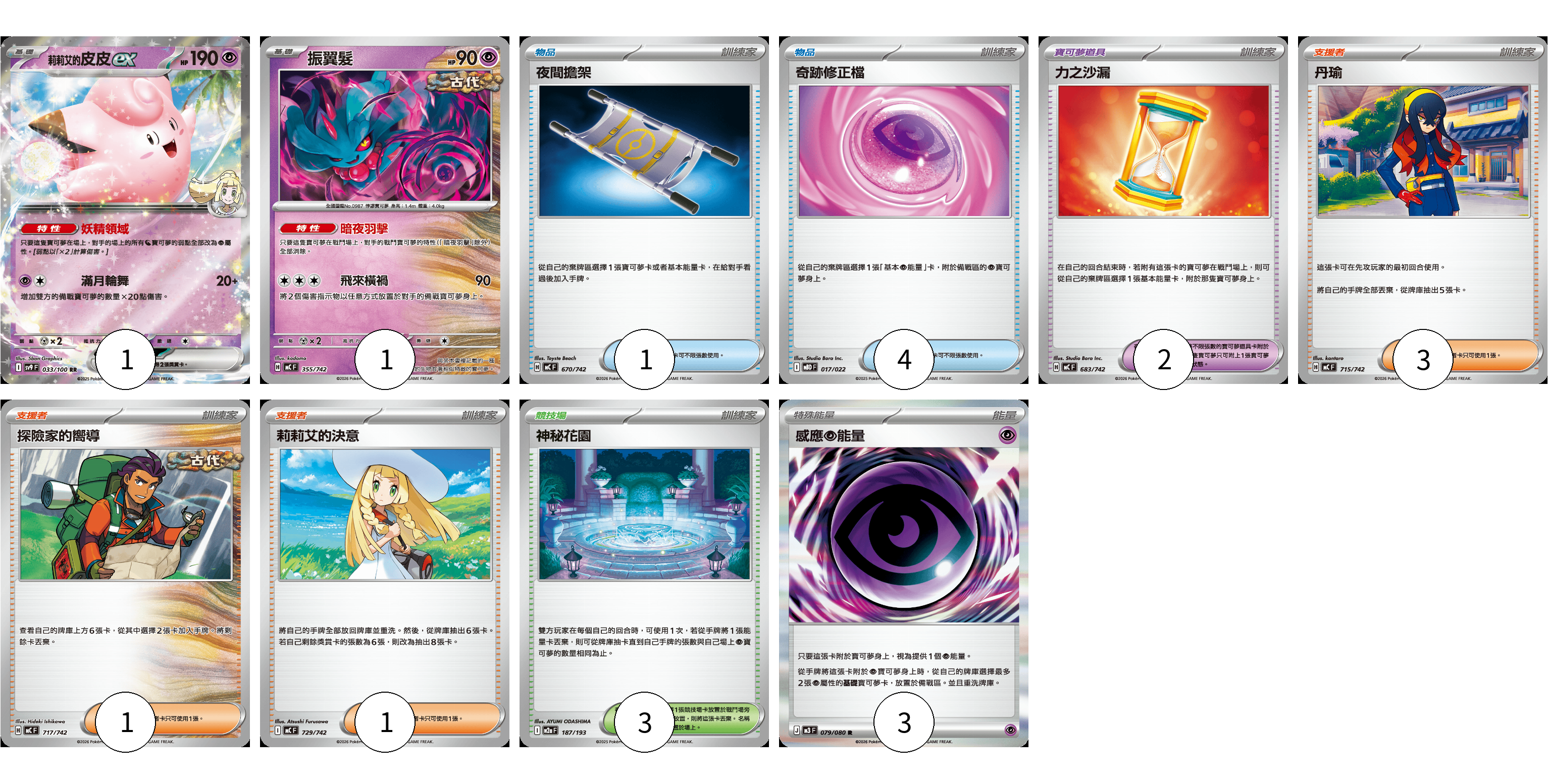牌組構築方案 以此牌組為基礎新構築牌組 顯示卡面 顯示列表 寶可夢卡(2) 1 1 寶可夢道具(2) 2 物品卡(5) 1 4 支援者卡(5) 3 1 1 競技場卡(3) 3 能量卡(3) 3 寶可夢卡(2) 卡牌名稱 張數 卡牌名稱 張數 莉莉艾的皮皮ex SV9 033/100 01 振翼髮 MC 355/742 01 寶可夢道具(2) 卡牌名稱 張數 卡牌名稱 張數 力之沙漏 MC 683/742 02 物品卡(5) 卡牌名稱 張數 卡牌名稱 張數 夜間擔架 MC 670/742 01 奇跡修正檔 MBD 017/022 04 支援者卡(5) 卡牌名稱 張數 卡牌名稱 張數 丹瑜 MC 715/742 03 探險家的嚮導 MC 717/742 01 莉莉艾的決意 MC 729/742 01 競技場卡(3) 卡牌名稱 張數 卡牌名稱 張數 神秘花園 M2a 187/193 03 能量卡(3) 卡牌名稱 張數 卡牌名稱 張數 感應【超】能量 M3 079/080 03 以此牌組為基礎新構築牌組 牌組編碼 HZnzkx-hdGSyg-xOLdHy copy 列印牌組單 牌組編碼已複製 分享至SNS