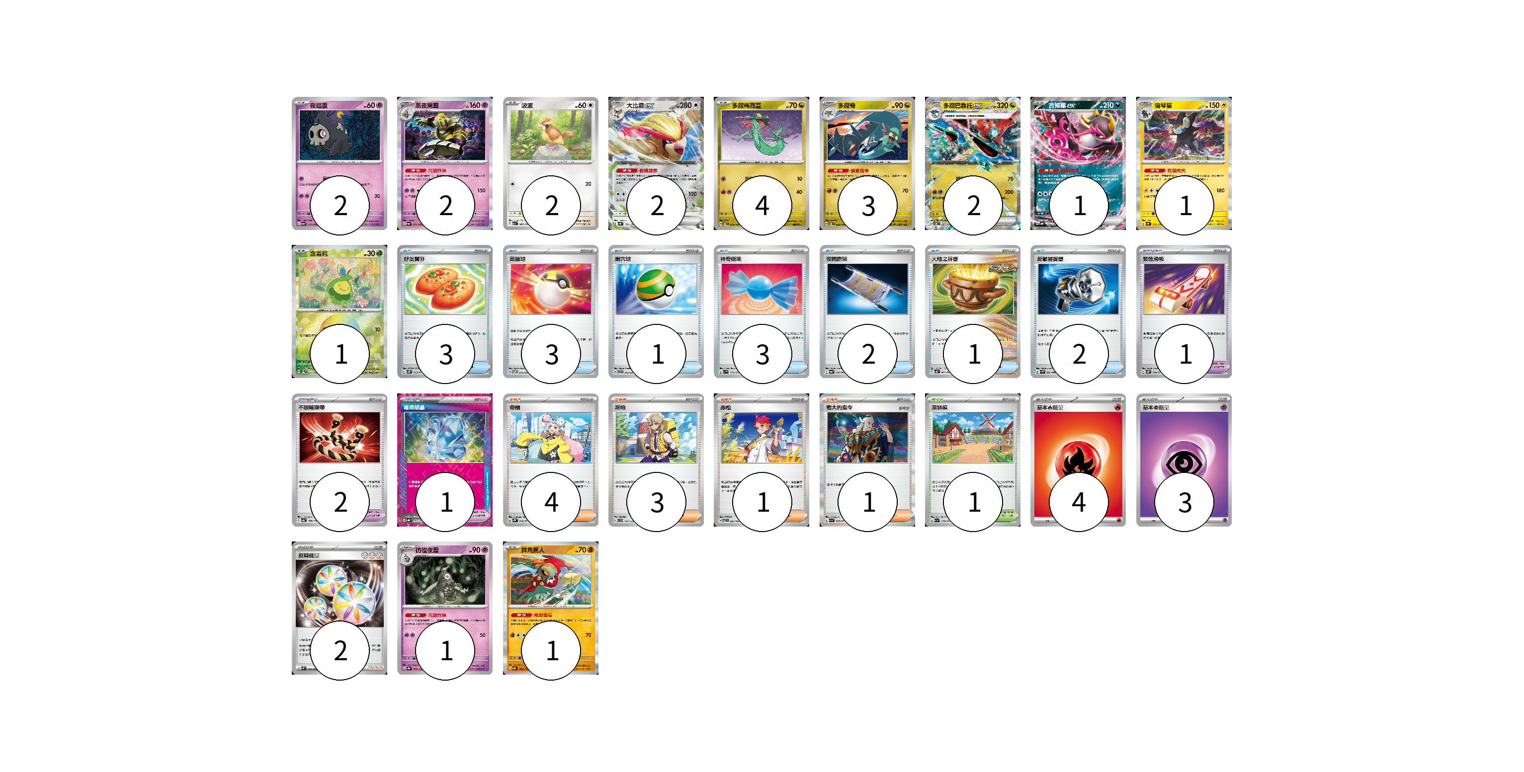 牌組構築方案 以此牌組為基礎新構築牌組 顯示卡面 顯示列表 寶可夢卡(22) 2 2 2 2 4 3 2 1 1 1 1 1 寶可夢道具(4) 1 2 1 物品卡(15) 3 3 1 3 2 1 2 支援者卡(9) 4 3 1 1 競技場卡(1) 1 能量卡(9) 4 3 2 寶可夢卡(22) 卡牌名稱 張數 卡牌名稱 張數 夜巡靈 SV6a 018/064 02 黑夜魔靈 SV6a 020/064 02 波波 SV3 087/108 02 大比鳥ex SV4a 139/190 02 多龍梅西亞 SV6 079/101 04 多龍奇 SV6 080/101 03 多龍巴魯托ex SV6 081/101 02 吉雉雞ex SV8a 104/187 01 倫琴貓 SV4a 061/190 01 含羞苞 SV8a 001/187 01 彷徨夜靈 SV8a 065/187 01 摔角鷹人 SV8a 084/187 01 寶可夢道具(4) 卡牌名稱 張數 卡牌名稱 張數 緊急滑板 SV5K 064/071 01 不服輸頭帶 SV4a 168/190 02 璀璨結晶 SV8a 152/187 01 物品卡(15) 卡牌名稱 張數 卡牌名稱 張數 好友寶芬 SV5K 063/071 03 高級球 SVTM 012/022 03 巢穴球 SVTR 013/021 01 神奇糖果 SV1V 072/078 03 夜間擔架 SV6a 056/064 02 大地之容器 SV4K 060/066 01 反擊捕捉器 SV4M 059/066 02 支援者卡(9) 卡牌名稱 張數 卡牌名稱 張數 奇樹 SV2D 069/071 04 派帕 SVD 137/139 03 赤松 SV7 097/102 01 老大的指令 SV1a 069/073 01 競技場卡(1) 卡牌名稱 張數 卡牌名稱 張數 深缽鎮 SV1a 070/073 01 能量卡(9) 卡牌名稱 張數 卡牌名稱 張數 基本火能量 sv-p FIR 04 基本超能量 sv-p PSY 03 反轉能量 SVK 041/042 02 以此牌組為基礎新構築牌組 牌組編碼 HghRon-gESvIO-aQNLRR copy 列印牌組單 牌組編碼已複製 分享至SNS