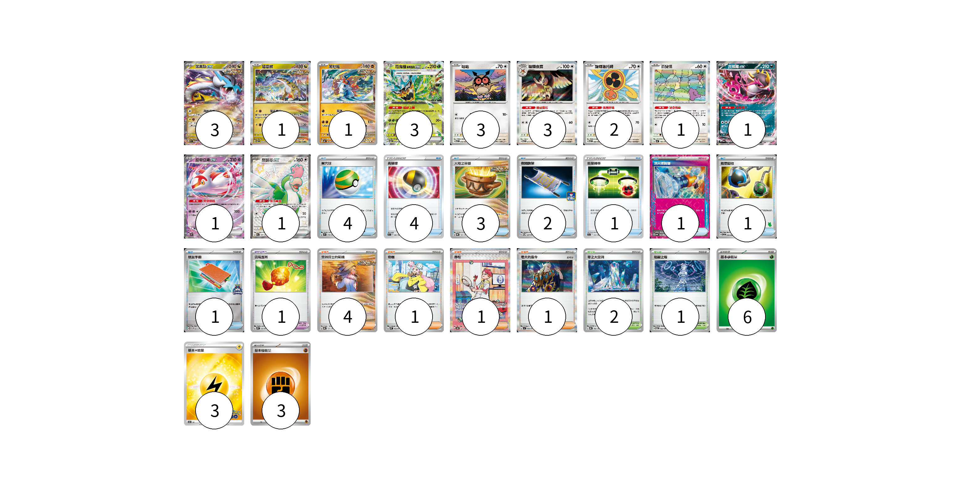 牌組構築方案 以此牌組為基礎新構築牌組 顯示卡面 顯示列表 寶可夢卡(20) 3 1 1 3 3 3 2 1 1 1 1 寶可夢道具(1) 1 物品卡(17) 4 4 3 2 1 1 1 1 支援者卡(7) 4 1 1 1 競技場卡(3) 2 1 能量卡(12) 6 3 3 寶可夢卡(20) 卡牌名稱 張數 卡牌名稱 張數 猛雷鼓ex SV5K 053/071 03 猛雷鼓 SV7 075/102 01 爬地翅 SV4K 041/066 01 厄鬼椪 碧草面具ex SV6 016/101 03 咕咕 SV7 076/102 03 貓頭夜鷹 SV7 077/102 03 旋轉洛托姆 SV7 080/102 02 百變怪 SV4a 144/190 01 吉雉雞ex SV6a 038/064 01 拉帝亞斯ex SV7a 019/064 01 怒鸚哥ex SV4a 337/190 01 寶可夢道具(1) 卡牌名稱 張數 卡牌名稱 張數 勇氣護符 SV2D 067/071 01 物品卡(17) 卡牌名稱 張數 卡牌名稱 張數 巢穴球 SV1S 070/078 04 高級球 S9 089/100 04 大地之容器 SV8a 143/187 03 夜間擔架 SV-P 227/SV-P 02 能量轉移 S11a 059/068 01 頂尖捕捉器 SV8a 148/187 01 能量回收 SVI 049/066 01 朋友手冊 SV-P 182/SV-P 01 支援者卡(7) 卡牌名稱 張數 卡牌名稱 張數 奧琳博士的氣魄 SV8a 167/187 04 奇樹 SV2D 069/071 01 赤松 SV8a 227/187 01 老大的指令 SV1a 069/073 01 競技場卡(3) 卡牌名稱 張數 卡牌名稱 張數 零之大空洞 SV8a 182/187 02 阻礙之塔 SV6 100/101 01 能量卡(12) 卡牌名稱 張數 卡牌名稱 張數 基本【草】能量 SVF GRA 06 基本雷能量 S10b LIG 03 基本【鬥】能量 SVHK FIG 03 以此牌組為基礎新構築牌組 牌組編碼 HgrzEN-SELnTs-aGLCrF copy 列印牌組單 牌組編碼已複製 分享至SNS