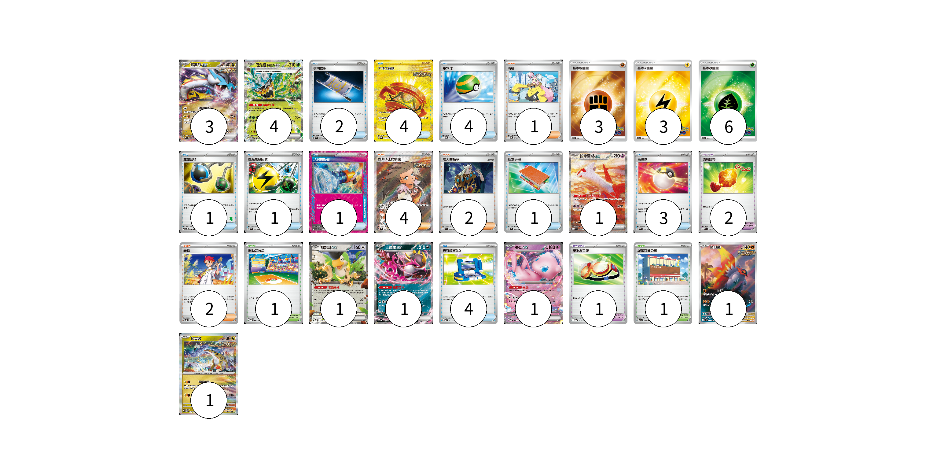 牌組構築方案 以此牌組為基礎新構築牌組 顯示卡面 顯示列表 寶可夢卡(13) 3 4 1 1 1 1 1 1 寶可夢道具(3) 2 1 物品卡(21) 2 4 4 1 1 1 1 3 4 支援者卡(9) 1 4 2 2 競技場卡(2) 1 1 能量卡(12) 3 3 6 寶可夢卡(13) 卡牌名稱 張數 卡牌名稱 張數 猛雷鼓ex SV5K 053/071 03 厄鬼椪 碧草面具ex SV6 016/101 04 拉帝亞斯ex SV7a 087/064 01 怒鸚哥ex SVK 006/042 01 吉雉雞ex SV6a 038/064 01 夢幻ex SVK 001/042 01 爬地翅 SV4K 074/066 01 猛雷鼓 SV7 075/102 01 寶可夢道具(3) 卡牌名稱 張數 卡牌名稱 張數 勇氣護符 SVM 142/175 02 安全護目鏡 SV2a 157/165 01 物品卡(21) 卡牌名稱 張數 卡牌名稱 張數 夜間擔架 SV6a 056/064 02 大地之容器 SV6a 093/064 04 巢穴球 SV4a 159/190 04 能量回收 SVI 049/066 01 超級能量回收 SVK 010/042 01 頂尖捕捉器 SV5M 062/071 01 朋友手冊 SV1S 069/078 01 高級球 SVK 018/042 03 寶可裝置3.0 SVEL 014/020 04 支援者卡(9) 卡牌名稱 張數 卡牌名稱 張數 奇樹 SV4a 174/190 01 奧琳博士的氣魄 SV4K 085/066 04 老大的指令 SVK 036/042 02 赤松 SV8a 163/187 02 競技場卡(2) 卡牌名稱 張數 卡牌名稱 張數 激動競技場 SV8 105/106 01 城鎮百貨公司 SV4a 183/190 01 能量卡(12) 卡牌名稱 張數 卡牌名稱 張數 基本鬥能量 S10b FIG 03 基本雷能量 S10b LIG 03 基本草能量 S10b GRA 06 以此牌組為基礎新構築牌組 牌組編碼 HhHPCk-ksXevf-uTxTJE copy 列印牌組單 牌組編碼已複製 分享至SNS
