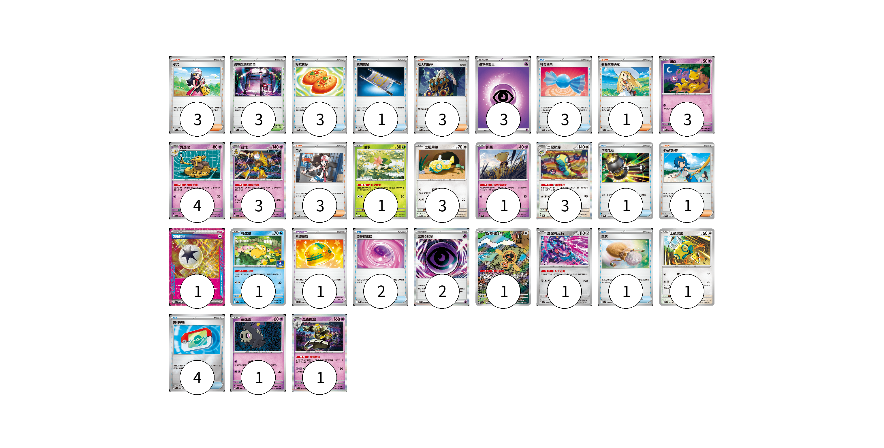 牌組構築方案 以此牌組為基礎新構築牌組 顯示卡面 顯示列表 寶可夢卡(24) 3 4 3 1 3 1 3 1 1 1 1 1 1 寶可夢道具(1) 1 物品卡(15) 3 1 3 1 2 1 4 支援者卡(11) 3 3 1 3 1 競技場卡(3) 3 能量卡(6) 3 1 2 寶可夢卡(24) 卡牌名稱 張數 卡牌名稱 張數 凱西 M1S 036/063 03 勇基拉 M1S 037/063 04 胡地 M1S 038/063 03 謝米 SV9a 006/063 01 土龍弟弟 SV9 078/100 03 凱西 SV8a 057/187 01 土龍節節 SV8a 130/187 03 可達鴨 SV-P 220/SV-P 01 旋轉洛托姆 M2a 213/193 01 蓋諾賽克特 SV6a 040/064 01 土龍弟弟 SV8a 129/187 01 夜巡靈 MC 308/742 01 黑夜魔靈 M2a 074/193 01 寶可夢道具(1) 卡牌名稱 張數 卡牌名稱 張數 幸運頭盔 SV5a 060/066 01 物品卡(15) 卡牌名稱 張數 卡牌名稱 張數 好友寶芬 MBD 013/022 03 夜間擔架 MBD 016/022 01 神奇糖果 MBG 013/022 03 改造之錘 SV8a 138/187 01 奇跡修正檔 MBD 017/022 02 聖灰 M2a 150/193 01 寶可平板 MC 662/742 04 支援者卡(11) 卡牌名稱 張數 卡牌名稱 張數 小光 M2 077/080 03 老大的指令 MBD 020/022 03 莉莉艾的決意 M1L 062/063 01 鬥子 SV11W 085/086 03 水蓮的照顧 SV8a 168/187 01 競技場卡(3) 卡牌名稱 張數 卡牌名稱 張數 對戰圓形競技場 M2 079/080 03 能量卡(6) 卡牌名稱 張數 卡牌名稱 張數 基本【超】能量 MBD PSY 03 富裕能量 SV7a 064/064 01 感應【超】能量 M3 079/080 02 以此牌組為基礎新構築牌組 牌組編碼 HhmwYN-aOPGaH-BuHiIO copy 列印牌組單 牌組編碼已複製 分享至SNS