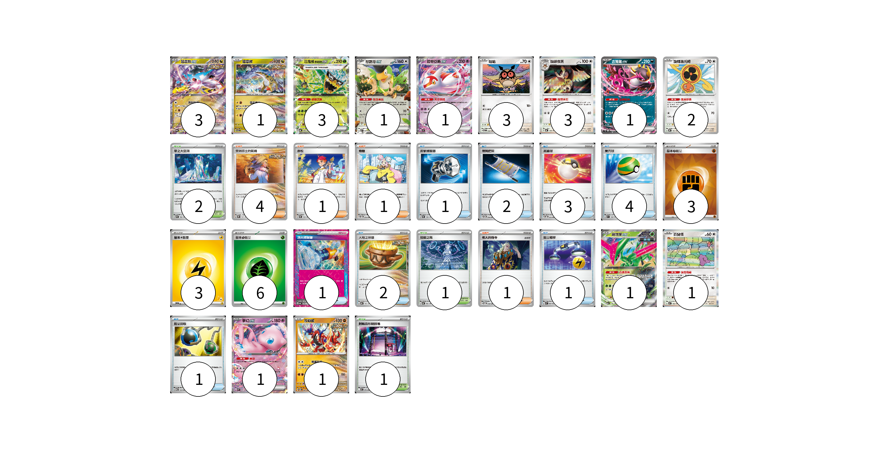 牌組構築方案 以此牌組為基礎新構築牌組 顯示卡面 顯示列表 寶可夢卡(22) 3 1 3 1 1 3 3 1 2 1 1 1 1 物品卡(15) 1 2 3 4 1 2 1 1 支援者卡(7) 4 1 1 1 競技場卡(4) 2 1 1 能量卡(12) 3 3 6 寶可夢卡(22) 卡牌名稱 張數 卡牌名稱 張數 猛雷鼓ex SV8a 124/187 03 猛雷鼓 SV7 075/102 01 厄鬼椪 碧草面具ex SV8a 020/187 03 怒鸚哥ex SVK 006/042 01 拉帝亞斯ex SV7a 019/064 01 咕咕 SV7 076/102 03 貓頭夜鷹 SV8a 128/187 03 吉雉雞ex SVOD 004/020 01 旋轉洛托姆 SV8a 131/187 02 鐵斑葉ex SV8a 016/187 01 百變怪 SV4a 144/190 01 夢幻ex SVK 001/042 01 故勒頓 SV8 069/106 01 物品卡(15) 卡牌名稱 張數 卡牌名稱 張數 反擊捕捉器 SV8a 139/187 01 夜間擔架 SVOM 016/021 02 高級球 SVOD 012/020 03 巢穴球 SVM 133/175 04 頂尖捕捉器 SV8a 148/187 01 大地之容器 SV8a 143/187 02 能量轉移 SVK 008/042 01 能量回收 SVQL 012/022 01 支援者卡(7) 卡牌名稱 張數 卡牌名稱 張數 奧琳博士的氣魄 SV8a 167/187 04 赤松 SV8a 163/187 01 奇樹 SVOD 016/020 01 老大的指令 SVOD 019/020 01 競技場卡(4) 卡牌名稱 張數 卡牌名稱 張數 零之大空洞 SV8a 182/187 02 阻礙之塔 SV8a 181/187 01 對戰圓形競技場 M2 079/080 01 能量卡(12) 卡牌名稱 張數 卡牌名稱 張數 基本【鬥】能量 SVK FIG 03 基本【雷】能量 SVI LIG 03 基本【草】能量 SVTM GRA 06 以此牌組為基礎新構築牌組 牌組編碼 HiLPEd-ZhAScy-IIKTRJ copy 列印牌組單 牌組編碼已複製 分享至SNS