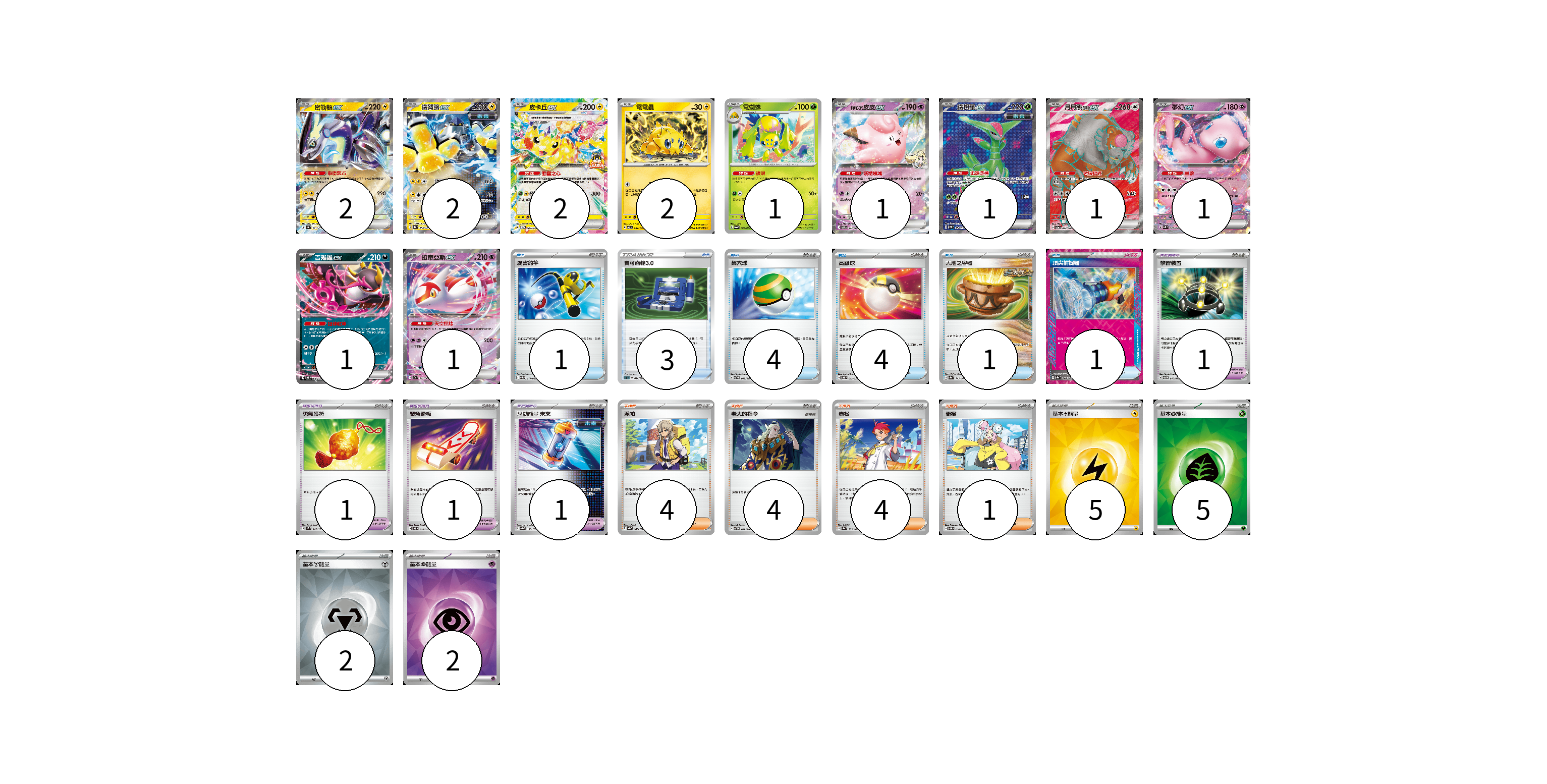 牌組構築方案 以此牌組為基礎新構築牌組 顯示卡面 顯示列表 寶可夢卡(15) 2 2 2 2 1 1 1 1 1 1 1 寶可夢道具(4) 1 1 1 1 物品卡(14) 1 3 4 4 1 1 支援者卡(13) 4 4 4 1 能量卡(14) 5 5 2 2 寶可夢卡(15) 卡牌名稱 張數 卡牌名稱 張數 密勒頓ex SV4a 071/190 02 鐵臂膀ex SV8a 054/187 02 皮卡丘ex SV-P 185/SV-P 02 電電蟲 SV7 032/102 02 電蜘蛛 SV6a 002/064 01 莉莉艾的皮皮ex SV9 033/100 01 鐵斑葉ex SV5M 084/071 01 月月熊 赫月 ex SV5a 084/066 01 夢幻ex SVK 001/042 01 吉雉雞ex SVOD 004/020 01 拉帝亞斯ex SV7a 019/064 01 寶可夢道具(4) 卡牌名稱 張數 卡牌名稱 張數 學習裝置 SVTM 016/022 01 勇氣護符 SVM 142/175 01 緊急滑板 SVOD 015/020 01 驅勁能量 未來 SV8a 158/187 01 物品卡(14) 卡牌名稱 張數 卡牌名稱 張數 厲害釣竿 SVEM 011/020 01 寶可齒輪3.0 SLD 014/020 03 巢穴球 SVTG 012/019 04 高級球 SVOD 012/020 04 大地之容器 SV8a 143/187 01 頂尖捕捉器 SV8a 148/187 01 支援者卡(13) 卡牌名稱 張數 卡牌名稱 張數 派帕 SV4a 180/190 04 老大的指令 SVTH 017/018 04 赤松 SV8a 163/187 04 奇樹 SVOM 018/021 01 能量卡(14) 卡牌名稱 張數 卡牌名稱 張數 基本【雷】能量 SVK LIG 05 基本【草】能量 SVK GRA 05 基本【鋼】能量 SVOD MET 02 基本【超】能量 SVOD PSY 02 以此牌組為基礎新構築牌組 牌組編碼 HiPGyG-oeZKJE-yXYKtR copy 列印牌組單 牌組編碼已複製 分享至SNS
