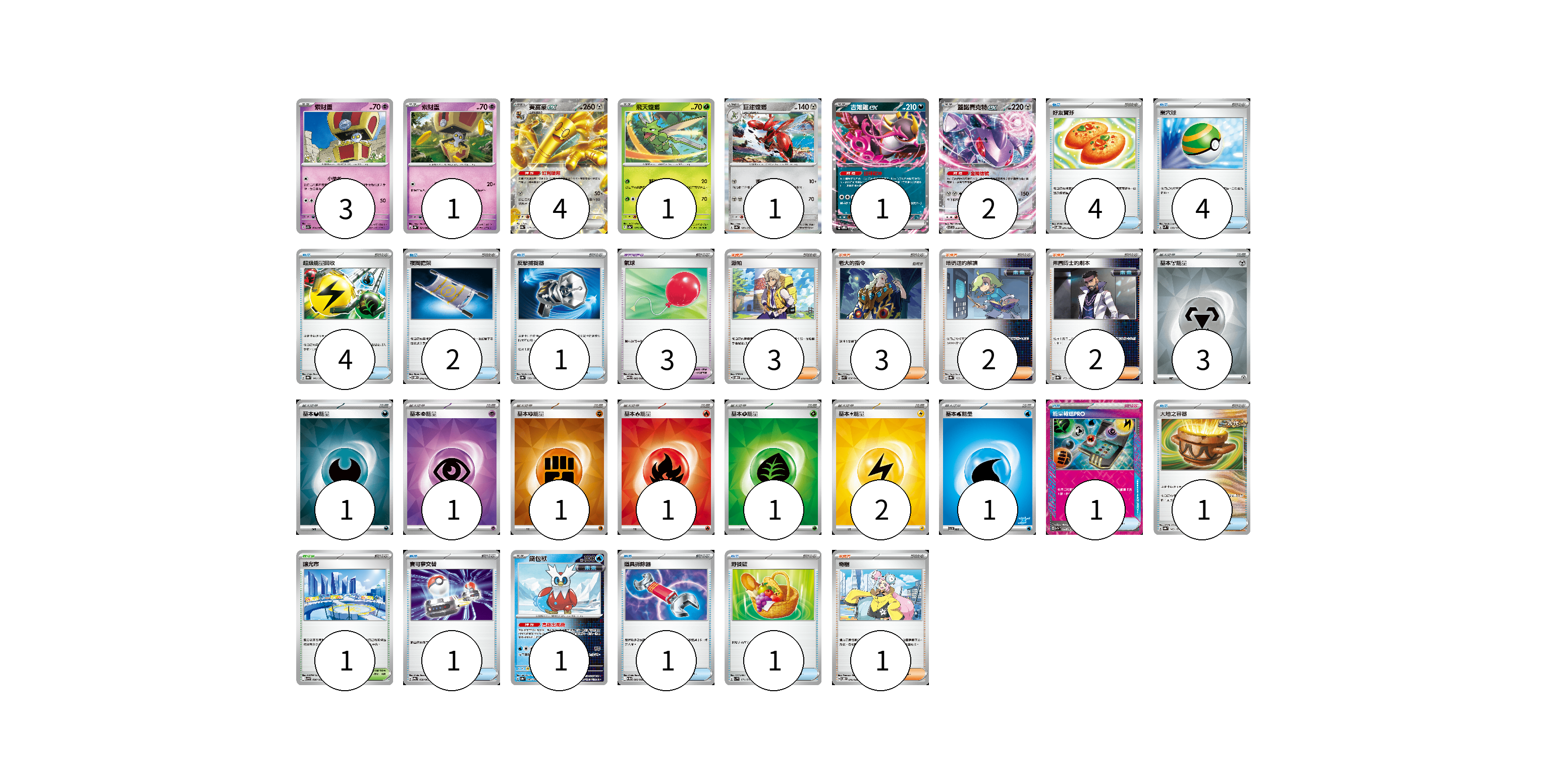 牌組構築方案 以此牌組為基礎新構築牌組 顯示卡面 顯示列表 寶可夢卡(14) 3 1 4 1 1 1 2 1 寶可夢道具(3) 3 物品卡(20) 4 4 4 2 1 1 1 1 1 1 支援者卡(11) 3 3 2 2 1 競技場卡(1) 1 能量卡(11) 3 1 1 1 1 1 2 1 寶可夢卡(14) 卡牌名稱 張數 卡牌名稱 張數 索財靈 SV7a 024/064 03 索財靈 SV3a 021/062 01 賽富豪ex SV8a 117/187 04 飛天螳螂 SV2a 123/165 01 巨鉗螳螂 SV4a 129/190 01 吉雉雞ex SVOD 004/020 01 蓋諾賽克特ex SV11B 069/086 02 鐵包袱 SV8a 047/187 01 寶可夢道具(3) 卡牌名稱 張數 卡牌名稱 張數 氣球 SV11B 082/086 03 物品卡(20) 卡牌名稱 張數 卡牌名稱 張數 好友寶芬 SVOD 011/020 04 巢穴球 SVM 133/175 04 超級能量回收 SV8a 141/187 04 夜間擔架 SVOM 016/021 02 反擊捕捉器 SV8a 139/187 01 能量輸送PRO SV7a 052/064 01 大地之容器 SV8a 143/187 01 寶可夢交替 SV9a 058/063 01 道具拆除器 SV11W 080/086 01 野餐籃 SV1V 071/078 01 支援者卡(11) 卡牌名稱 張數 卡牌名稱 張數 派帕 SVOD 018/020 03 老大的指令 SVK 036/042 03 暗碼迷的解讀 SV8a 165/187 02 弗圖博士的劇本 SV8a 175/187 02 奇樹 SVOD 016/020 01 競技場卡(1) 卡牌名稱 張數 卡牌名稱 張數 釀光市 SV9 098/100 01 能量卡(11) 卡牌名稱 張數 卡牌名稱 張數 基本【鋼】能量 SVOD MET 03 基本【惡】能量 SVOM DAR 01 基本【超】能量 SVOD PSY 01 基本【鬥】能量 SVM FIG 01 基本【火】能量 SVM FIR 01 基本【草】能量 SVM GRA 01 基本【雷】能量 SVM LIG 02 基本【水】能量 SVI WAT 01 以此牌組為基礎新構築牌組 牌組編碼 HjTKeK-xGxSYV-YjvtIA copy 列印牌組單 牌組編碼已複製 分享至SNS
