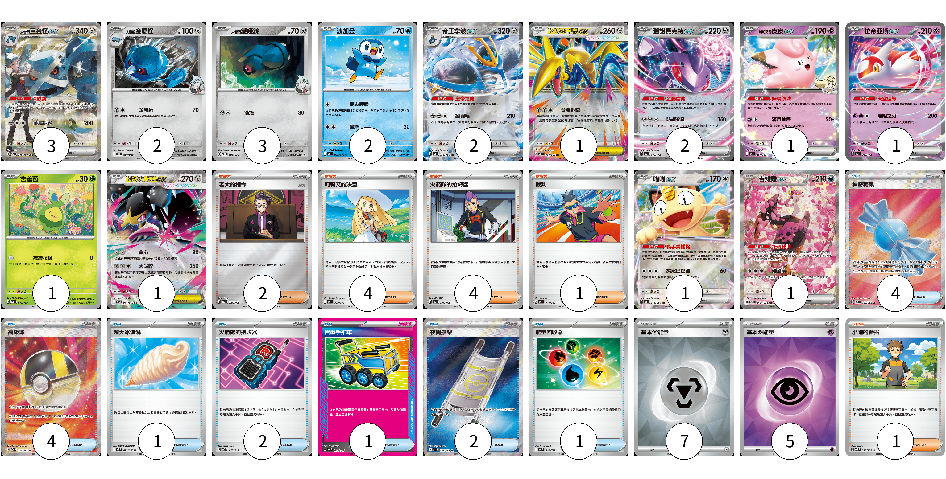 牌組構築方案 以此牌組為基礎新構築牌組 顯示卡面 顯示列表 寶可夢卡(21) 3 2 3 2 2 1 2 1 1 1 1 1 1 物品卡(15) 4 4 1 2 1 2 1 支援者卡(12) 2 4 4 1 1 能量卡(12) 7 5 寶可夢卡(21) 卡牌名稱 張數 卡牌名稱 張數 <大吾的>巨金怪ex M2a 245/193 03 <大吾的>金屬怪 SVOD 007/020 02 <大吾的>鐵啞鈴 SVOD 006/020 03 波加曼 M2 027/080 02 帝王拿波ex M2 058/080 02 超級盔甲鳥ex M3 054/080 01 蓋諾賽克特ex MC 512/742 02 <莉莉艾的>皮皮ex MC 287/742 01 拉帝亞斯ex MC 312/742 01 含羞苞 M2a 011/193 01 超級大嘴娃ex M1L 046/063 01 喵喵ex M3 061/080 01 吉雉雞ex M2a 244/193 01 物品卡(15) 卡牌名稱 張數 卡牌名稱 張數 神奇糖果 M1S 082/063 04 高級球 M2a 216/193 04 超大冰淇淋 M2 073/080 01 火箭隊的接收器 MC 675/742 02 貴重手推車 MC 658/742 01 夜間擔架 M1L 083/063 02 能量回收器 MC 640/742 01 支援者卡(12) 卡牌名稱 張數 卡牌名稱 張數 老大的指令 MC 724/742 02 莉莉艾的決意 MC 729/742 04 火箭隊的拉姆達 MC 734/742 04 裁判 MC 711/742 01 小剛的發掘 SV9 096/100 01 能量卡(12) 卡牌名稱 張數 卡牌名稱 張數 基本【鋼】能量 SVOD MET 07 基本【超】能量 SVOD PSY 05 以此牌組為基礎新構築牌組 牌組編碼 HjlDQB-gKRoYq-ecKxRs copy 列印牌組單 牌組編碼已複製 分享至SNS