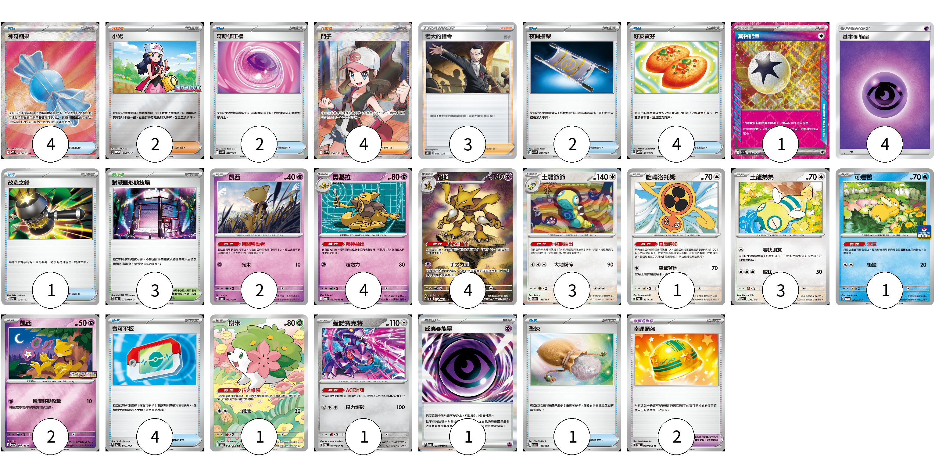 牌組構築方案 以此牌組為基礎新構築牌組 顯示卡面 顯示列表 寶可夢卡(22) 2 4 4 3 1 3 1 2 1 1 寶可夢道具(2) 2 物品卡(18) 4 2 2 4 1 4 1 支援者卡(9) 2 4 3 競技場卡(3) 3 能量卡(6) 1 4 1 寶可夢卡(22) 卡牌名稱 張數 卡牌名稱 張數 凱西 SV8a 057/187 02 勇基拉 M1S 037/063 04 胡地 M1S 071/063 04 土龍節節 SV8a 130/187 03 旋轉洛托姆 SV8a 131/187 01 土龍弟弟 SVM 095/175 03 可達鴨 SV-P 220/SV-P 01 凱西 M-P 004/M-P 02 謝米 SV9a 066/063 01 蓋諾賽克特 SV6a 040/064 01 寶可夢道具(2) 卡牌名稱 張數 卡牌名稱 張數 幸運頭盔 SV5a 060/066 02 物品卡(18) 卡牌名稱 張數 卡牌名稱 張數 神奇糖果 M1S 082/063 04 奇跡修正檔 MBD 017/022 02 夜間擔架 MBD 016/022 02 好友寶芬 MBD 013/022 04 改造之錘 SV8a 138/187 01 寶可平板 MC 662/742 04 聖灰 M2a 150/193 01 支援者卡(9) 卡牌名稱 張數 卡牌名稱 張數 小光 M-P 028/M-P 02 鬥子 SV11W 166/086 04 老大的指令(坂木) SJ 026/028 03 競技場卡(3) 卡牌名稱 張數 卡牌名稱 張數 對戰圓形競技場 M2 079/080 03 能量卡(6) 卡牌名稱 張數 卡牌名稱 張數 富裕能量 SV7a 064/064 01 基本超能量 AS6D PSY 04 感應【超】能量 M3 079/080 01 以此牌組為基礎新構築牌組 牌組編碼 HjpfSA-gbyNfP-OIQqyb copy 列印牌組單 牌組編碼已複製 分享至SNS