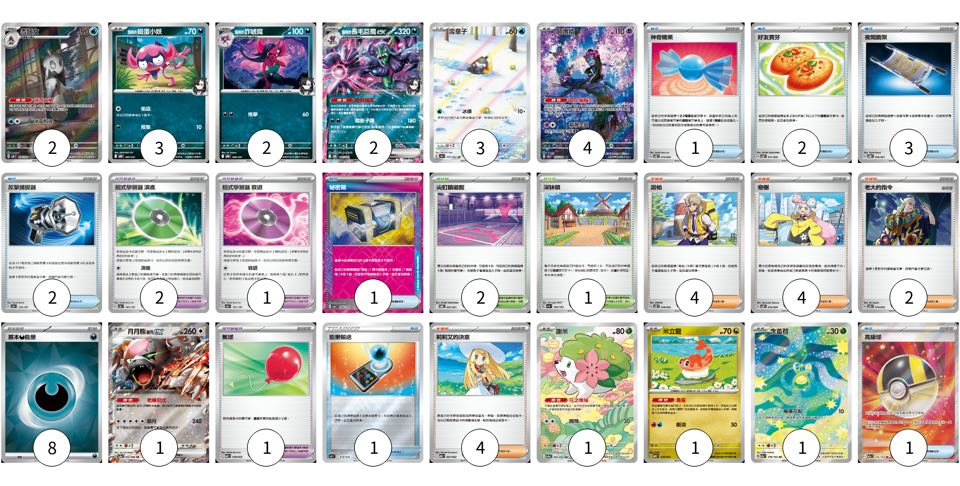 牌組構築方案 以此牌組為基礎新構築牌組 顯示卡面 顯示列表 寶可夢卡(20) 2 3 2 2 3 4 1 1 1 1 寶可夢道具(4) 2 1 1 物品卡(11) 1 2 3 2 1 1 1 支援者卡(14) 4 4 2 4 競技場卡(3) 2 1 能量卡(8) 8 寶可夢卡(20) 卡牌名稱 張數 卡牌名稱 張數 雪妖女 SV6 104/101 02 <瑪俐的>搗蛋小妖 SVOM 005/021 03 <瑪俐的>詐唬魔 SVOM 006/021 02 <瑪俐的>長毛巨魔ex SVOM 007/021 02 雪童子 SV3a 063/062 03 願增猿 SV6 107/101 04 月月熊 赫月 ex SV5a 052/066 01 謝米 SV9a 066/063 01 米立龍 MBD 010/022 01 含羞苞 M2a 196/193 01 寶可夢道具(4) 卡牌名稱 張數 卡牌名稱 張數 招式學習器 演進 SV8a 160/187 02 招式學習器 衰退 SV8a 161/187 01 氣球 MBD 018/022 01 物品卡(11) 卡牌名稱 張數 卡牌名稱 張數 神奇糖果 SVOD 013/020 01 好友寶芬 SVOD 011/020 02 夜間擔架 SVOM 016/021 03 反擊捕捉器 SV8a 139/187 02 秘密箱 SV6 092/101 01 能量輸送 SO 018/030 01 高級球 M2a 216/193 01 支援者卡(14) 卡牌名稱 張數 卡牌名稱 張數 派帕 SVOD 018/020 04 奇樹 SVOD 016/020 04 老大的指令 SVOD 019/020 02 莉莉艾的決意 MBD 021/022 04 競技場卡(3) 卡牌名稱 張數 卡牌名稱 張數 尖釘鎮道館 SVOM 021/021 02 深缽鎮 SV4a 185/190 01 能量卡(8) 卡牌名稱 張數 卡牌名稱 張數 基本【惡】能量 SVOM DAR 08 以此牌組為基礎新構築牌組 牌組編碼 HmJIIr-hJBdLG-mAnYhL copy 列印牌組單 牌組編碼已複製 分享至SNS