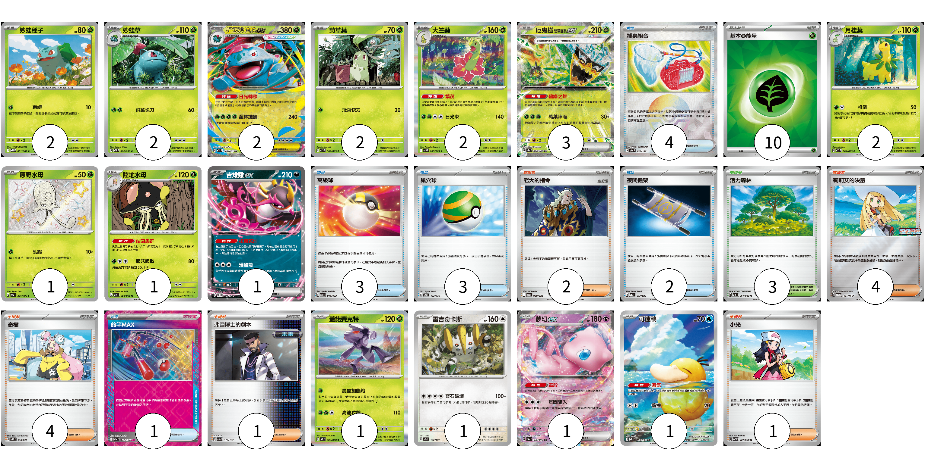 牌組構築方案 以此牌組為基礎新構築牌組 顯示卡面 顯示列表 寶可夢卡(22) 2 2 2 2 2 3 2 1 1 1 1 1 1 1 物品卡(13) 4 3 3 2 1 支援者卡(12) 2 4 4 1 1 競技場卡(3) 3 能量卡(10) 10 寶可夢卡(22) 卡牌名稱 張數 卡牌名稱 張數 妙蛙種子 M1L 001/063 02 妙蛙草 M1L 002/063 02 超級妙蛙花ex M1L 003/063 02 菊草葉 M1S 003/063 02 大竺葵 M1S 005/063 02 厄鬼椪 碧草面具ex SV8a 020/187 03 月桂葉 M1S 004/063 02 原野水母 SV4a 206/190 01 陸地水母 SV4M 008/066 01 吉雉雞ex SVOD 004/020 01 蓋諾賽克特 M2 008/080 01 雷吉奇卡斯 SV8a 132/187 01 夢幻ex SV4a 076/190 01 可達鴨 M2a 199/193 01 物品卡(13) 卡牌名稱 張數 卡牌名稱 張數 捕蟲組合 SV8a 150/187 04 高級球 MBD 014/022 03 巢穴球 SVM 133/175 03 夜間擔架 MBG 017/022 02 釣竿MAX SV8a 142/187 01 支援者卡(12) 卡牌名稱 張數 卡牌名稱 張數 老大的指令 MBD 020/022 02 莉莉艾的決意 M-P 011/M-P 04 奇樹 SVOD 016/020 04 弗圖博士的劇本 SV8a 175/187 01 小光 M2 077/080 01 競技場卡(3) 卡牌名稱 張數 卡牌名稱 張數 活力森林 M1S 061/063 03 能量卡(10) 卡牌名稱 張數 卡牌名稱 張數 基本【草】能量 SVK GRA 10 以此牌組為基礎新構築牌組 牌組編碼 HmgNwx-nUAagJ-VSljYm copy 列印牌組單 牌組編碼已複製 分享至SNS