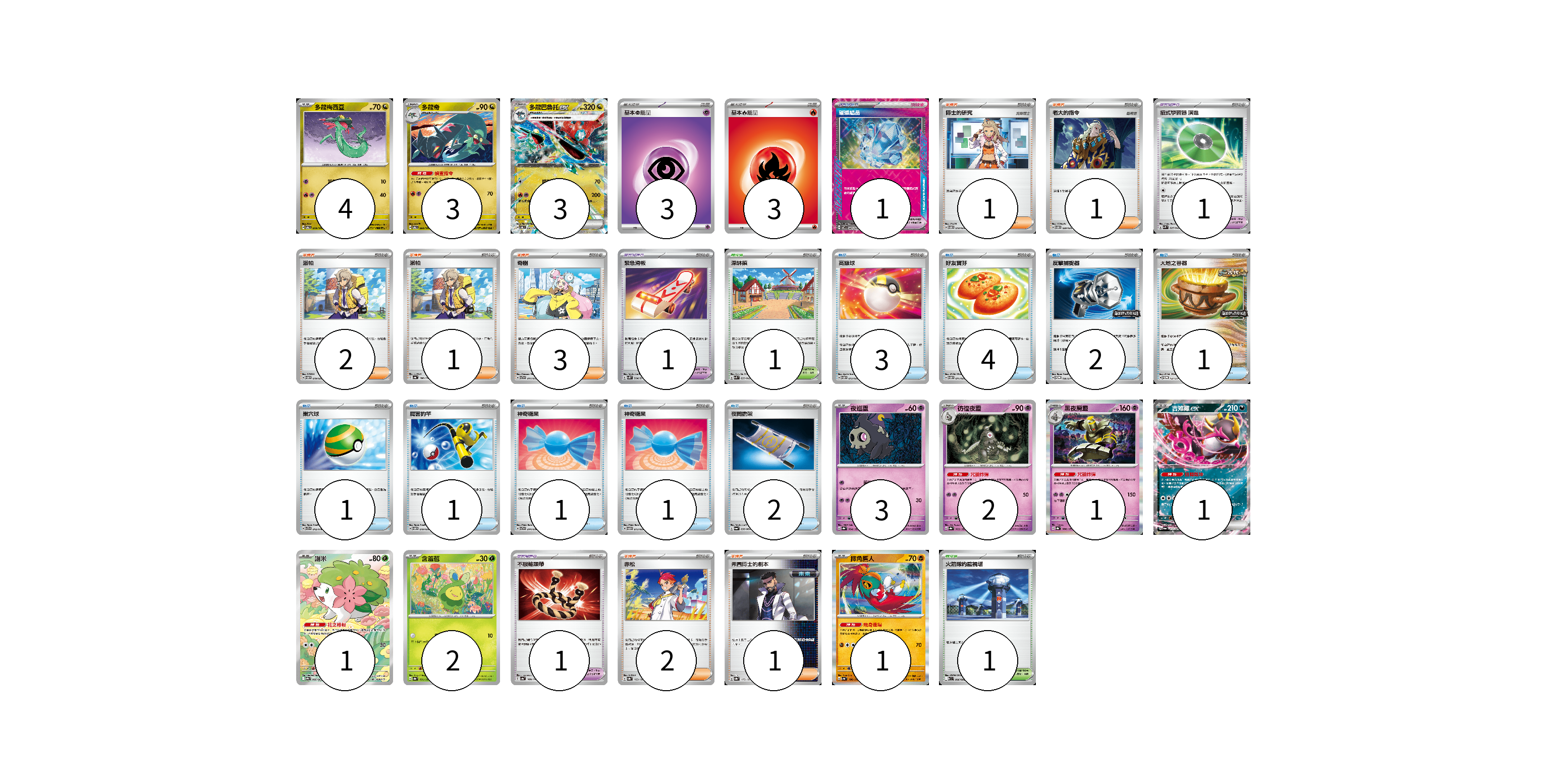 牌組構築方案 以此牌組為基礎新構築牌組 顯示卡面 顯示列表 寶可夢卡(21) 4 3 3 3 2 1 1 1 2 1 寶可夢道具(4) 1 1 1 1 物品卡(16) 3 4 2 1 1 1 1 1 2 支援者卡(11) 1 1 2 1 3 2 1 競技場卡(2) 1 1 能量卡(6) 3 3 寶可夢卡(21) 卡牌名稱 張數 卡牌名稱 張數 多龍梅西亞 SV6 079/101 04 多龍奇 SV6 080/101 03 多龍巴魯托ex SV6 081/101 03 夜巡靈 SV8a 064/187 03 彷徨夜靈 SV8a 065/187 02 黑夜魔靈 SV8a 066/187 01 吉雉雞ex SV6a 038/064 01 謝米 SV9a 066/063 01 含羞苞 SV8a 001/187 02 摔角鷹人 SV4a 106/190 01 寶可夢道具(4) 卡牌名稱 張數 卡牌名稱 張數 璀璨結晶 SV7 094/102 01 招式學習器 演進 SVK 025/042 01 緊急滑板 SV5K 064/071 01 不服輸頭帶 SV4a 168/190 01 物品卡(16) 卡牌名稱 張數 卡牌名稱 張數 高級球 SVTM 012/022 03 好友寶芬 SVTM 011/022 04 反擊捕捉器 SV-P 136/SV-P 02 大地之容器 SV-P 137/SV-P 01 巢穴球 SVTG 012/019 01 厲害釣竿 SVTM 010/022 01 神奇糖果 SVTG 014/019 01 神奇糖果 SVTM 013/022 01 夜間擔架 SV6a 056/064 02 支援者卡(11) 卡牌名稱 張數 卡牌名稱 張數 博士的研究 SVTM 018/022 01 老大的指令 SVTM 020/022 01 派帕 SVTM 019/022 02 派帕 SV4a 180/190 01 奇樹 SVTG 017/019 03 赤松 SV8a 163/187 02 弗圖博士的劇本 SV8a 175/187 01 競技場卡(2) 卡牌名稱 張數 卡牌名稱 張數 深缽鎮 SVK 039/042 01 火箭隊的監視塔 SV10 096/098 01 能量卡(6) 卡牌名稱 張數 卡牌名稱 張數 基本【超】能量 SVTS PSY 03 基本【火】能量 SVHK FIR 03 以此牌組為基礎新構築牌組 牌組編碼 HmjqCd-mlzjAD-mfarzW copy 列印牌組單 牌組編碼已複製 分享至SNS