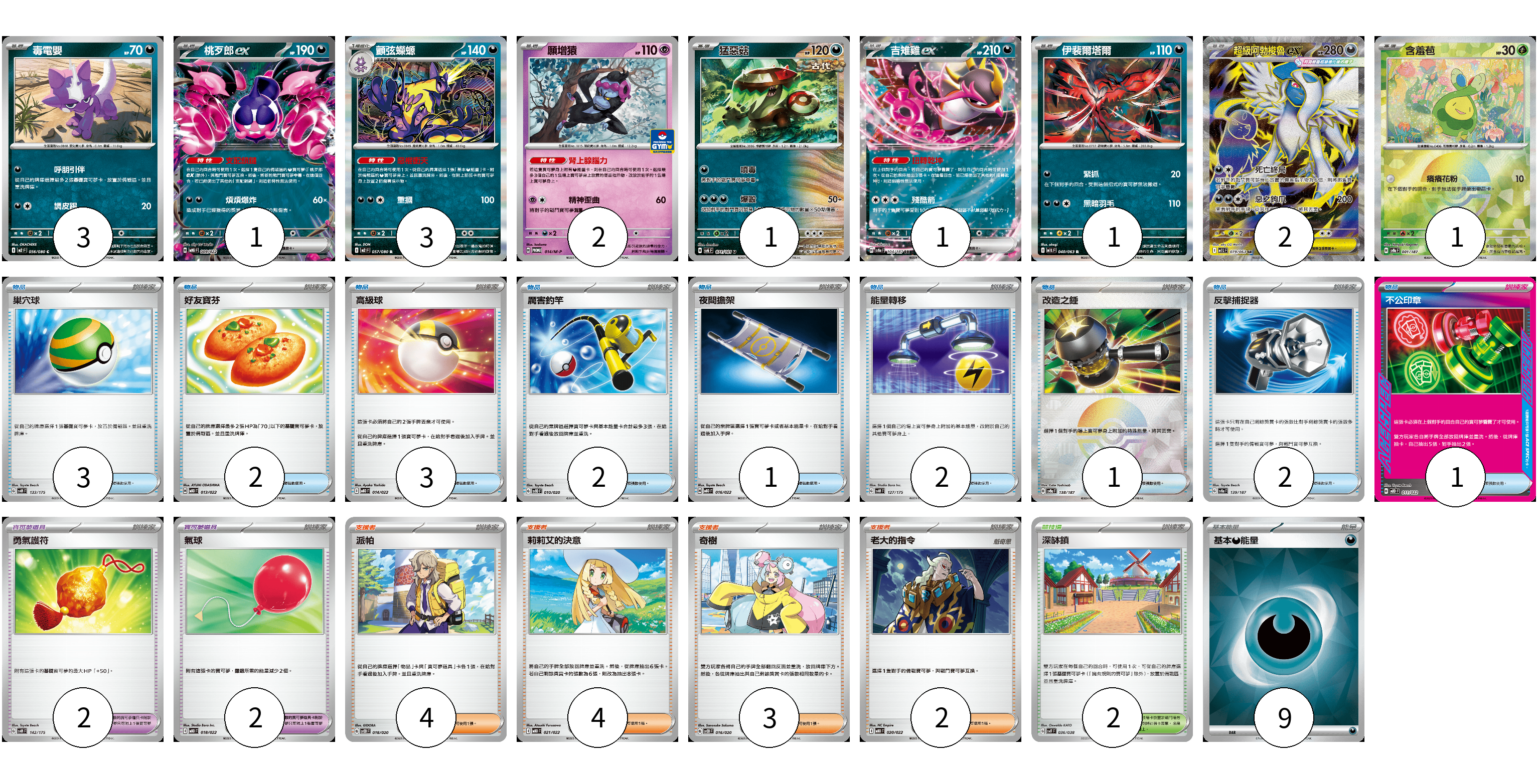牌組構築方案 以此牌組為基礎新構築牌組 顯示卡面 顯示列表 寶可夢卡(15) 3 1 3 2 1 1 1 2 1 寶可夢道具(4) 2 2 物品卡(17) 3 2 3 2 1 2 1 2 1 支援者卡(13) 4 4 3 2 競技場卡(2) 2 能量卡(9) 9 寶可夢卡(15) 卡牌名稱 張數 卡牌名稱 張數 毒電嬰 M2 056/080 03 桃歹郎ex MBG 009/022 01 顫弦蠑螈 M2 057/080 03 願增猿 M-P 014/M-P 02 猛惡菇 SV6 071/101 01 吉雉雞ex SV8a 104/187 01 伊裴爾塔爾 M1L 040/063 01 超級阿勃梭魯ex M1L 079/063 02 含羞苞 SV8a 001/187 01 寶可夢道具(4) 卡牌名稱 張數 卡牌名稱 張數 勇氣護符 SVM 142/175 02 氣球 MBD 018/022 02 物品卡(17) 卡牌名稱 張數 卡牌名稱 張數 巢穴球 SVM 133/175 03 好友寶芬 MBD 013/022 02 高級球 MBD 014/022 03 厲害釣竿 SVOD 010/020 02 夜間擔架 MBD 016/022 01 能量轉移 SVM 127/175 02 改造之錘 SV8a 138/187 01 反擊捕捉器 SV8a 139/187 02 不公印章 MBD 011/022 01 支援者卡(13) 卡牌名稱 張數 卡牌名稱 張數 派帕 SVOD 018/020 04 莉莉艾的決意 MBD 021/022 04 奇樹 SVOD 016/020 03 老大的指令 MBD 020/022 02 競技場卡(2) 卡牌名稱 張數 卡牌名稱 張數 深缽鎮 SVF 036/038 02 能量卡(9) 卡牌名稱 張數 卡牌名稱 張數 基本【惡】能量 SVOM DAR 09 以此牌組為基礎新構築牌組 牌組編碼 HmxmAs-SnsETd-nDEpYG copy 列印牌組單 牌組編碼已複製 分享至SNS