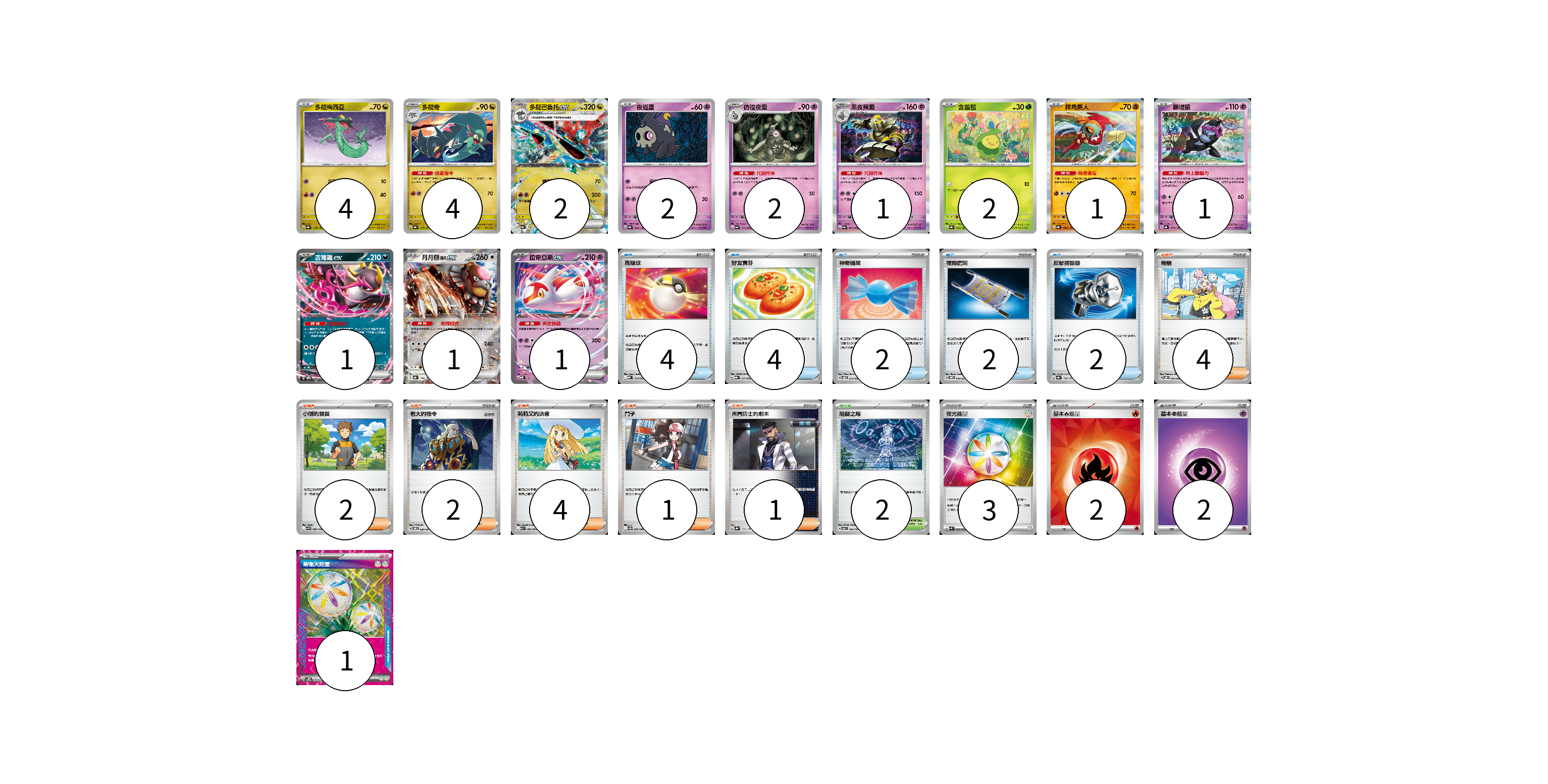 牌組構築方案 以此牌組為基礎新構築牌組 顯示卡面 顯示列表 寶可夢卡(22) 4 4 2 2 2 1 2 1 1 1 1 1 物品卡(14) 4 4 2 2 2 支援者卡(14) 4 2 2 4 1 1 競技場卡(2) 2 能量卡(8) 3 2 2 1 寶可夢卡(22) 卡牌名稱 張數 卡牌名稱 張數 多龍梅西亞 SV8a 118/187 04 多龍奇 SV8a 119/187 04 多龍巴魯托ex SV8a 120/187 02 夜巡靈 SV8a 064/187 02 彷徨夜靈 SV6a 019/064 02 黑夜魔靈 SV6a 020/064 01 含羞苞 SV8a 001/187 02 摔角鷹人 SV8a 084/187 01 願增猿 SV8a 075/187 01 吉雉雞ex SVOM 009/021 01 月月熊 赫月ex SV8a 134/187 01 拉帝亞斯ex MBD 003/022 01 物品卡(14) 卡牌名稱 張數 卡牌名稱 張數 高級球 MBD 014/022 04 好友寶芬 MBG 011/022 04 神奇糖果 SVOD 013/020 02 夜間擔架 SVOM 016/021 02 反擊捕捉器 SV8a 139/187 02 支援者卡(14) 卡牌名稱 張數 卡牌名稱 張數 奇樹 SVOD 016/020 04 小剛的發掘 SV9 096/100 02 老大的指令 SVOM 020/021 02 莉莉艾的決意 M1L 062/063 04 鬥子 SV11W 085/086 01 弗圖博士的劇本 SV8a 175/187 01 競技場卡(2) 卡牌名稱 張數 卡牌名稱 張數 阻礙之塔 SV6 100/101 02 能量卡(8) 卡牌名稱 張數 卡牌名稱 張數 夜光能量 SVK 042/042 03 基本【火】能量 SVQL FIR 02 基本【超】能量 MBD PSY 02 新衝天能量 SV5K 071/071 01 以此牌組為基礎新構築牌組 牌組編碼 HnJUdU-rJsqFM-tjVWEW copy 列印牌組單 牌組編碼已複製 分享至SNS
