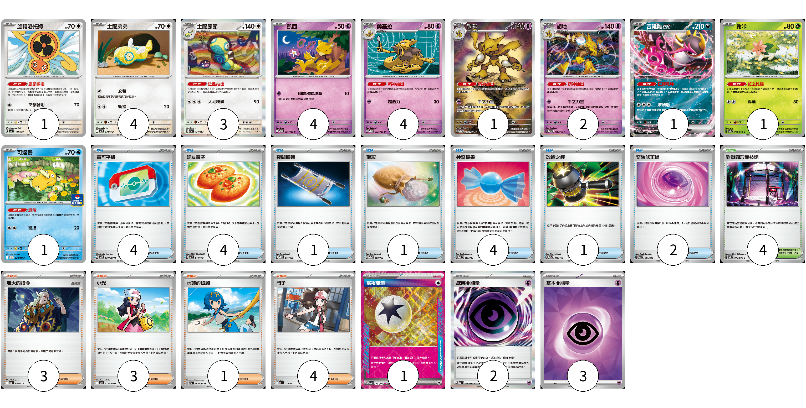 牌組構築方案 以此牌組為基礎新構築牌組 顯示卡面 顯示列表 寶可夢卡(22) 1 4 3 4 4 1 2 1 1 1 物品卡(17) 4 4 1 1 4 1 2 支援者卡(11) 3 3 1 4 競技場卡(4) 4 能量卡(6) 1 2 3 寶可夢卡(22) 卡牌名稱 張數 卡牌名稱 張數 旋轉洛托姆 SV8a 131/187 01 土龍弟弟 MC 574/742 04 土龍節節 SV8a 130/187 03 凱西 M1S 036/063 04 勇基拉 M1S 037/063 04 胡地 M1S 071/063 01 胡地 M1S 038/063 02 吉雉雞ex M2a 114/193 01 謝米 SV9a 006/063 01 可達鴨 SV-P 220/SV-P 01 物品卡(17) 卡牌名稱 張數 卡牌名稱 張數 寶可平板 M3 070/080 04 好友寶芬 MC 648/742 04 夜間擔架 MBD 016/022 01 聖灰 M2a 150/193 01 神奇糖果 MC 655/742 04 改造之錘 M2a 148/193 01 奇跡修正檔 MBD 017/022 02 支援者卡(11) 卡牌名稱 張數 卡牌名稱 張數 老大的指令 MBD 020/022 03 小光 M2 077/080 03 水蓮的照顧 SV5a 064/066 01 鬥子 MC 718/742 04 競技場卡(4) 卡牌名稱 張數 卡牌名稱 張數 對戰圓形競技場 M2 079/080 04 能量卡(6) 卡牌名稱 張數 卡牌名稱 張數 富裕能量 SV7a 064/064 01 感應【超】能量 M3 079/080 02 基本【超】能量 SVOD PSY 03 以此牌組為基礎新構築牌組 牌組編碼 HpbyPR-CGgTsh-BbNQHL copy 列印牌組單 牌組編碼已複製 分享至SNS