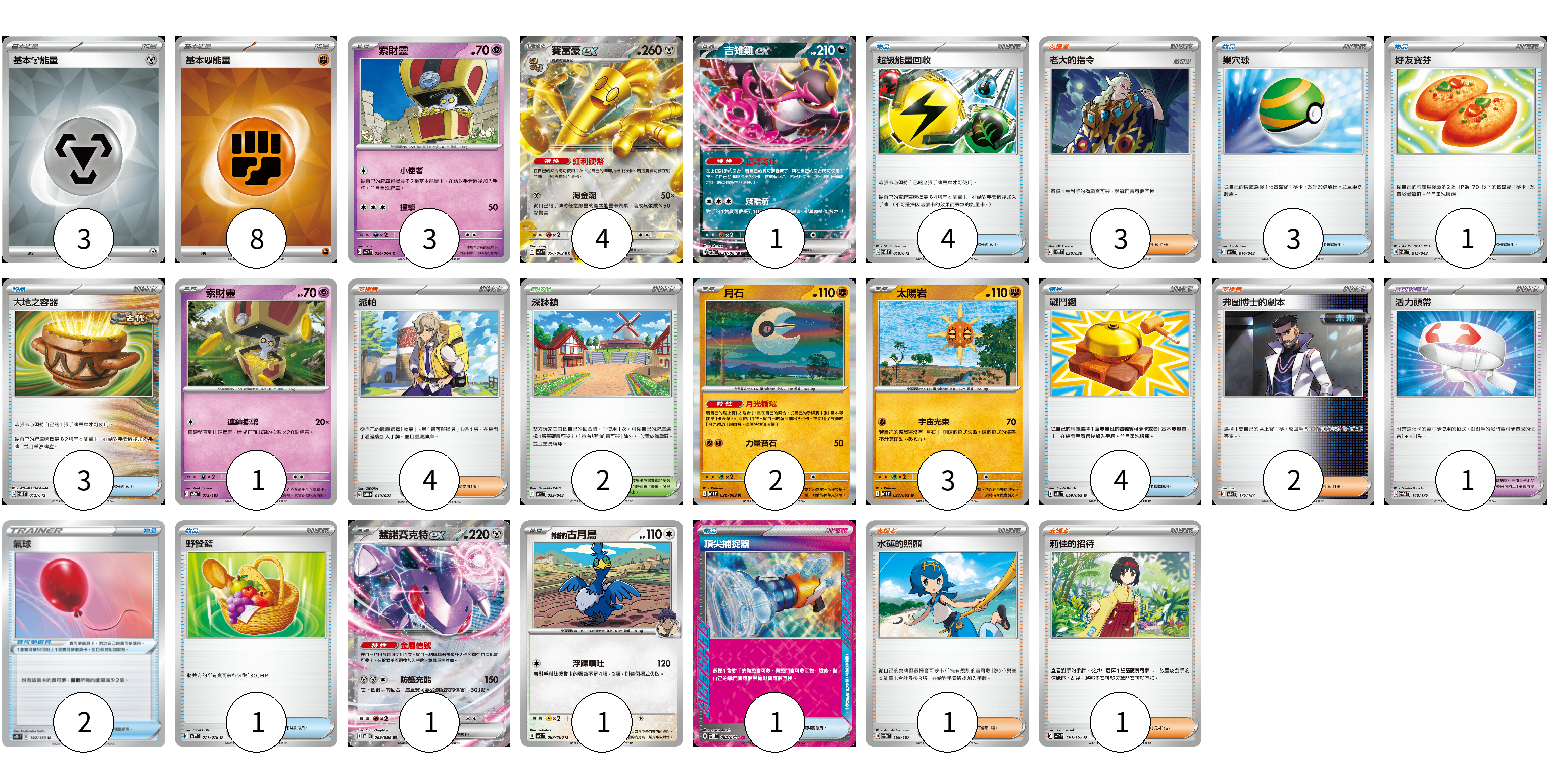 牌組構築方案 以此牌組為基礎新構築牌組 顯示卡面 顯示列表 寶可夢卡(16) 3 4 1 1 2 3 1 1 寶可夢道具(3) 1 2 物品卡(17) 4 3 1 3 4 1 1 支援者卡(11) 3 4 2 1 1 競技場卡(2) 2 能量卡(11) 3 8 寶可夢卡(16) 卡牌名稱 張數 卡牌名稱 張數 索財靈 SV7a 024/064 03 賽富豪ex SV3a 050/062 04 吉雉雞ex SV6a 038/064 01 索財靈 SV8a 073/187 01 月石 M1L 026/063 02 太陽岩 M1L 027/063 03 蓋諾賽克特ex SV11B 069/086 01 赫普的古月鳥 SV9 087/100 01 寶可夢道具(3) 卡牌名稱 張數 卡牌名稱 張數 活力頭帶 SVM 140/175 01 氣球 SC1b 142/153 02 物品卡(17) 卡牌名稱 張數 卡牌名稱 張數 超級能量回收 SVK 010/042 04 巢穴球 SVK 016/042 03 好友寶芬 SVK 015/042 01 大地之容器 SVK 012/042 03 戰鬥鑼 M1L 059/063 04 野餐籃 SV1V 071/078 01 頂尖捕捉器 SV5M 062/071 01 支援者卡(11) 卡牌名稱 張數 卡牌名稱 張數 老大的指令 SVEM 020/020 03 派帕 SVTM 019/022 04 弗圖博士的劇本 SV8a 175/187 02 水蓮的照顧 SV8a 168/187 01 莉佳的招待 SV2a 161/165 01 競技場卡(2) 卡牌名稱 張數 卡牌名稱 張數 深缽鎮 SVK 039/042 02 能量卡(11) 卡牌名稱 張數 卡牌名稱 張數 基本【鋼】能量 SVK MET 03 基本【鬥】能量 SVK FIG 08 以此牌組為基礎新構築牌組 牌組編碼 HqovDC-gIMijB-KzWAAU copy 列印牌組單 牌組編碼已複製 分享至SNS