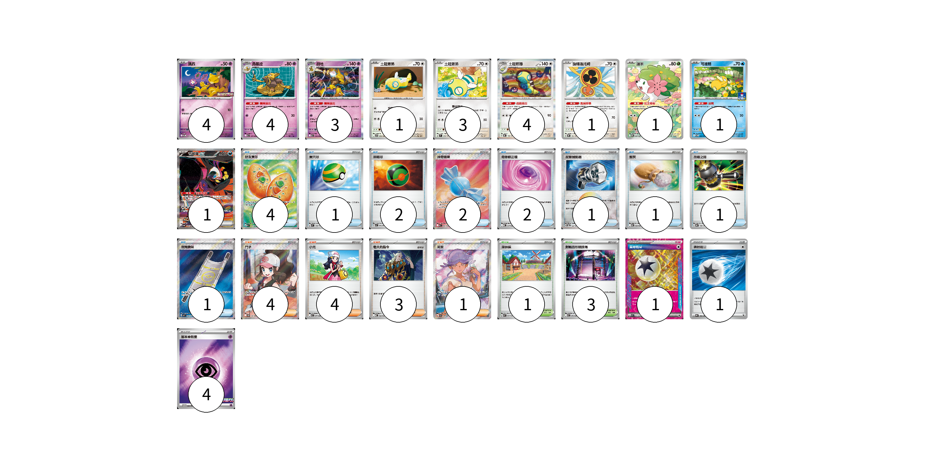 牌組構築方案 以此牌組為基礎新構築牌組 顯示卡面 顯示列表 寶可夢卡(23) 4 4 3 1 3 4 1 1 1 1 物品卡(15) 4 1 2 2 2 1 1 1 1 支援者卡(12) 4 4 3 1 競技場卡(4) 1 3 能量卡(6) 1 1 4 寶可夢卡(23) 卡牌名稱 張數 卡牌名稱 張數 凱西 M-P 004/M-P 04 勇基拉 M1S 037/063 04 胡地 M1S 038/063 03 土龍弟弟 SV9 078/100 01 土龍弟弟 SVM 095/175 03 土龍節節 SV8a 130/187 04 旋轉洛托姆 SV8a 131/187 01 謝米 SV9a 066/063 01 可達鴨 SV-P 220/SV-P 01 吉雉雞ex SV6a 089/064 01 物品卡(15) 卡牌名稱 張數 卡牌名稱 張數 好友寶芬 M1S 081/063 04 巢穴球 SVM 133/175 01 黑暗球 SV7a 054/064 02 神奇糖果 M1S 082/063 02 奇跡修正檔 MBD 017/022 02 反擊捕捉器 SV8a 139/187 01 聖灰 SV9a 056/063 01 改造之錘 SV8a 138/187 01 夜間擔架 M1L 083/063 01 支援者卡(12) 卡牌名稱 張數 卡牌名稱 張數 鬥子 SV11W 166/086 04 小光 M2 077/080 04 老大的指令 MBD 020/022 03 莉普 SV4M 087/066 01 競技場卡(4) 卡牌名稱 張數 卡牌名稱 張數 深缽鎮 SVK 039/042 01 對戰圓形競技場 M2 079/080 03 能量卡(6) 卡牌名稱 張數 卡牌名稱 張數 富裕能量 SV7a 064/064 01 噴射能量 SV8a 185/187 01 基本【超】能量 M-P 033/M-P 04 以此牌組為基礎新構築牌組 牌組編碼 HqtILd-OjTZcG-hRYmlV copy 列印牌組單 牌組編碼已複製 分享至SNS