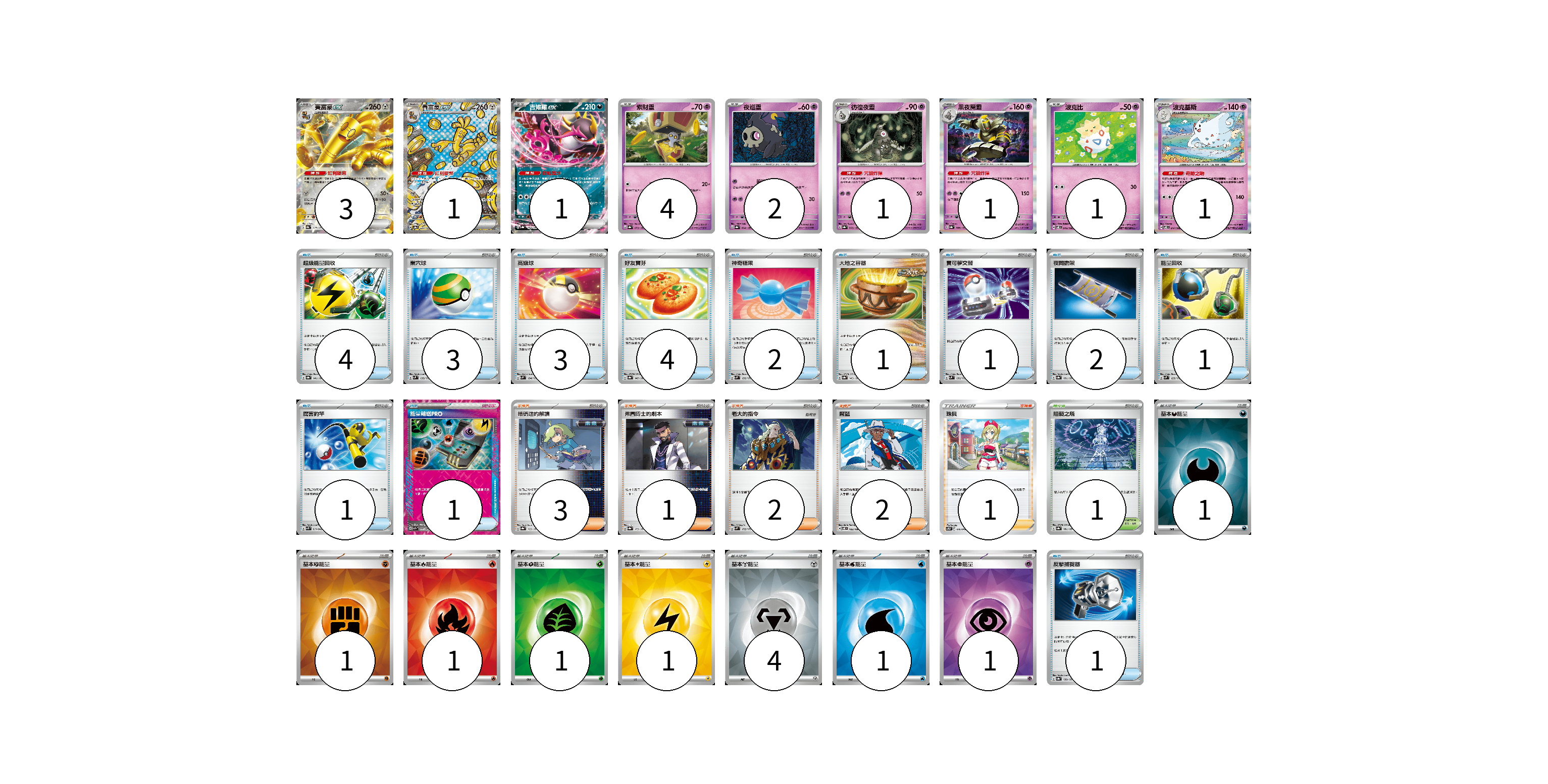 牌組構築方案 以此牌組為基礎新構築牌組 顯示卡面 顯示列表 寶可夢卡(15) 3 1 1 4 2 1 1 1 1 物品卡(24) 4 3 3 4 2 1 1 2 1 1 1 1 支援者卡(9) 3 1 2 2 1 競技場卡(1) 1 能量卡(11) 1 1 1 1 1 4 1 1 寶可夢卡(15) 卡牌名稱 張數 卡牌名稱 張數 賽富豪ex SV8a 117/187 03 賽富豪ex SV8a 220/187 01 吉雉雞ex SV8a 104/187 01 索財靈 SV8a 073/187 04 夜巡靈 SV8a 064/187 02 彷徨夜靈 SV8a 065/187 01 黑夜魔靈 SV8a 066/187 01 波克比 SV8 045/106 01 波克基斯 SV8 047/106 01 物品卡(24) 卡牌名稱 張數 卡牌名稱 張數 超級能量回收 SV8a 141/187 04 巢穴球 SVM 133/175 03 高級球 SVM 134/175 03 好友寶芬 SV8a 147/187 04 神奇糖果 SVM 135/175 02 大地之容器 SV8a 143/187 01 寶可夢交替 SVM 136/175 01 夜間擔架 SV8a 151/187 02 能量回收 SVM 125/175 01 厲害釣竿 SVK 011/042 01 能量輸送PRO SV7a 052/064 01 反擊捕捉器 SV8a 139/187 01 支援者卡(9) 卡牌名稱 張數 卡牌名稱 張數 暗碼迷的解讀 SV8a 165/187 03 弗圖博士的劇本 SV8a 175/187 01 老大的指令 SVM 172/175 02 席藍 SV8 102/106 02 珠貝 SVTG 016/019 01 競技場卡(1) 卡牌名稱 張數 卡牌名稱 張數 阻礙之塔 SV8a 181/187 01 能量卡(11) 卡牌名稱 張數 卡牌名稱 張數 基本【惡】能量 SVK DAR 01 基本【鬥】能量 SVK FIG 01 基本【火】能量 SVK FIR 01 基本【草】能量 SVK GRA 01 基本【雷】能量 SVK LIG 01 基本【鋼】能量 SVK MET 04 基本【水】能量 SVK WAT 01 基本【超】能量 SVK PSY 01 以此牌組為基礎新構築牌組 牌組編碼 HrGzXG-rCUczv-NyOKod copy 列印牌組單 牌組編碼已複製 分享至SNS