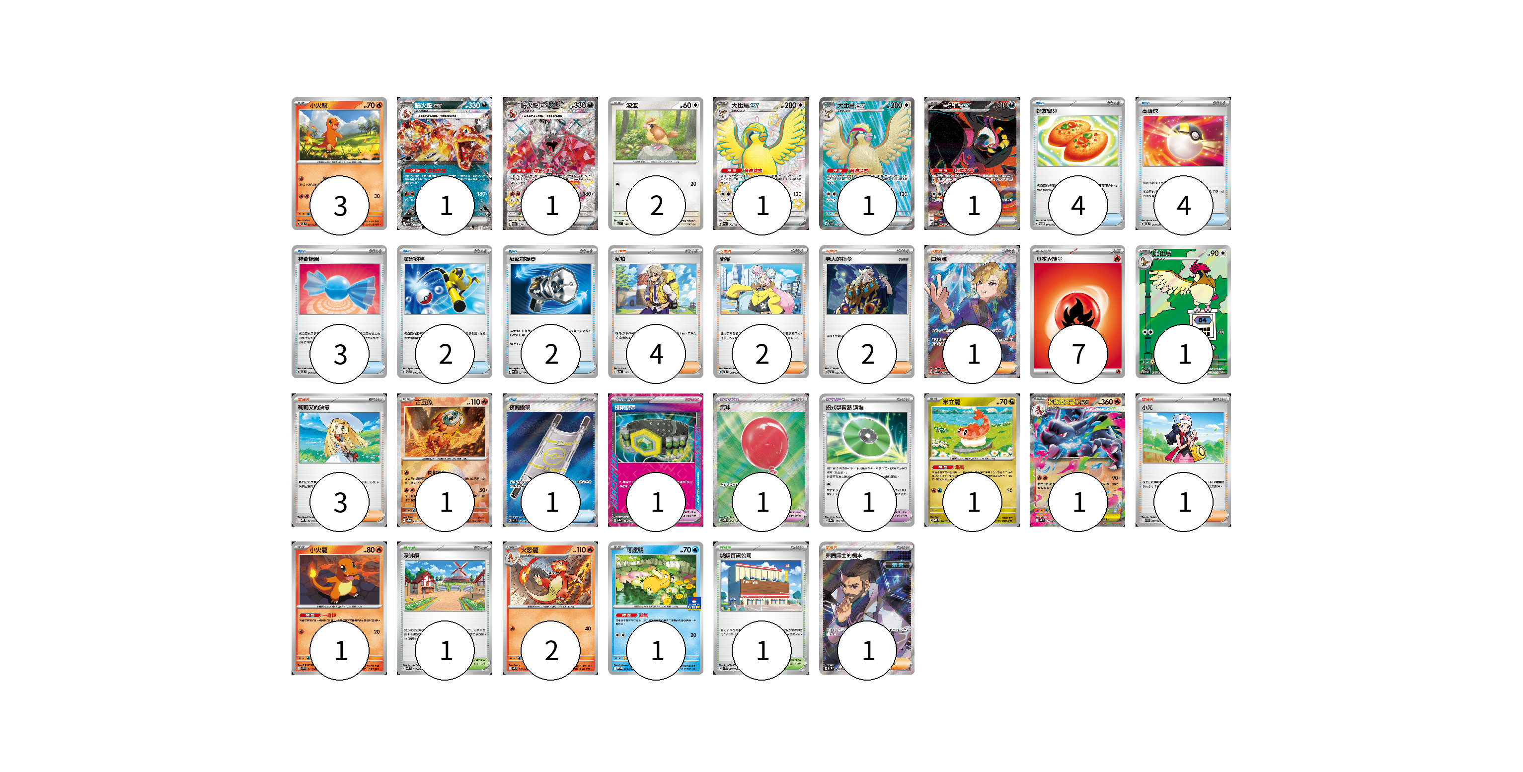 牌組構築方案 以此牌組為基礎新構築牌組 顯示卡面 顯示列表 寶可夢卡(18) 3 1 1 2 1 1 1 1 1 1 1 1 2 1 寶可夢道具(5) 2 1 1 1 物品卡(16) 4 4 3 2 2 1 支援者卡(12) 4 2 1 3 1 1 競技場卡(2) 1 1 能量卡(7) 7 寶可夢卡(18) 卡牌名稱 張數 卡牌名稱 張數 小火龍 SVTL 001/021 03 噴火龍ex SV4a 115/190 01 噴火龍ex SV4a 331/190 01 波波 SV3 087/108 02 大比鳥ex SV4a 335/190 01 大比鳥ex SV3 128/108 01 吉雉雞ex SV6a 089/064 01 比比鳥 SV3 119/108 01 古玉魚 SV8a 025/187 01 米立龍 MBD 010/022 01 超級噴火龍Xex M2 013/080 01 小火龍 M2 011/080 01 火恐龍 M2 012/080 02 可達鴨 SV-P 220/SV-P 01 寶可夢道具(5) 卡牌名稱 張數 卡牌名稱 張數 奇樹 SVTL 018/021 02 極限腰帶 SV8a 159/187 01 氣球 M1L 084/063 01 招式學習器 演進 SV8a 160/187 01 物品卡(16) 卡牌名稱 張數 卡牌名稱 張數 好友寶芬 SVTM 011/022 04 高級球 SVTL 012/021 04 神奇糖果 SVTL 013/021 03 厲害釣竿 SVTL 009/021 02 反擊捕捉器 SV4M 059/066 02 夜間擔架 M1L 083/063 01 支援者卡(12) 卡牌名稱 張數 卡牌名稱 張數 派帕 SV4a 180/190 04 老大的指令 SVTL 021/021 02 白蕾雅 SV7 126/102 01 莉莉艾的決意 MBD 021/022 03 小光 M2 077/080 01 弗圖博士的劇本 SV4M 086/066 01 競技場卡(2) 卡牌名稱 張數 卡牌名稱 張數 深缽鎮 SVK 039/042 01 城鎮百貨公司 SVK 037/042 01 能量卡(7) 卡牌名稱 張數 卡牌名稱 張數 基本火能量 sv-p FIR 07 以此牌組為基礎新構築牌組 牌組編碼 HrTidW-bVNUiY-ulihzt copy 列印牌組單 牌組編碼已複製 分享至SNS