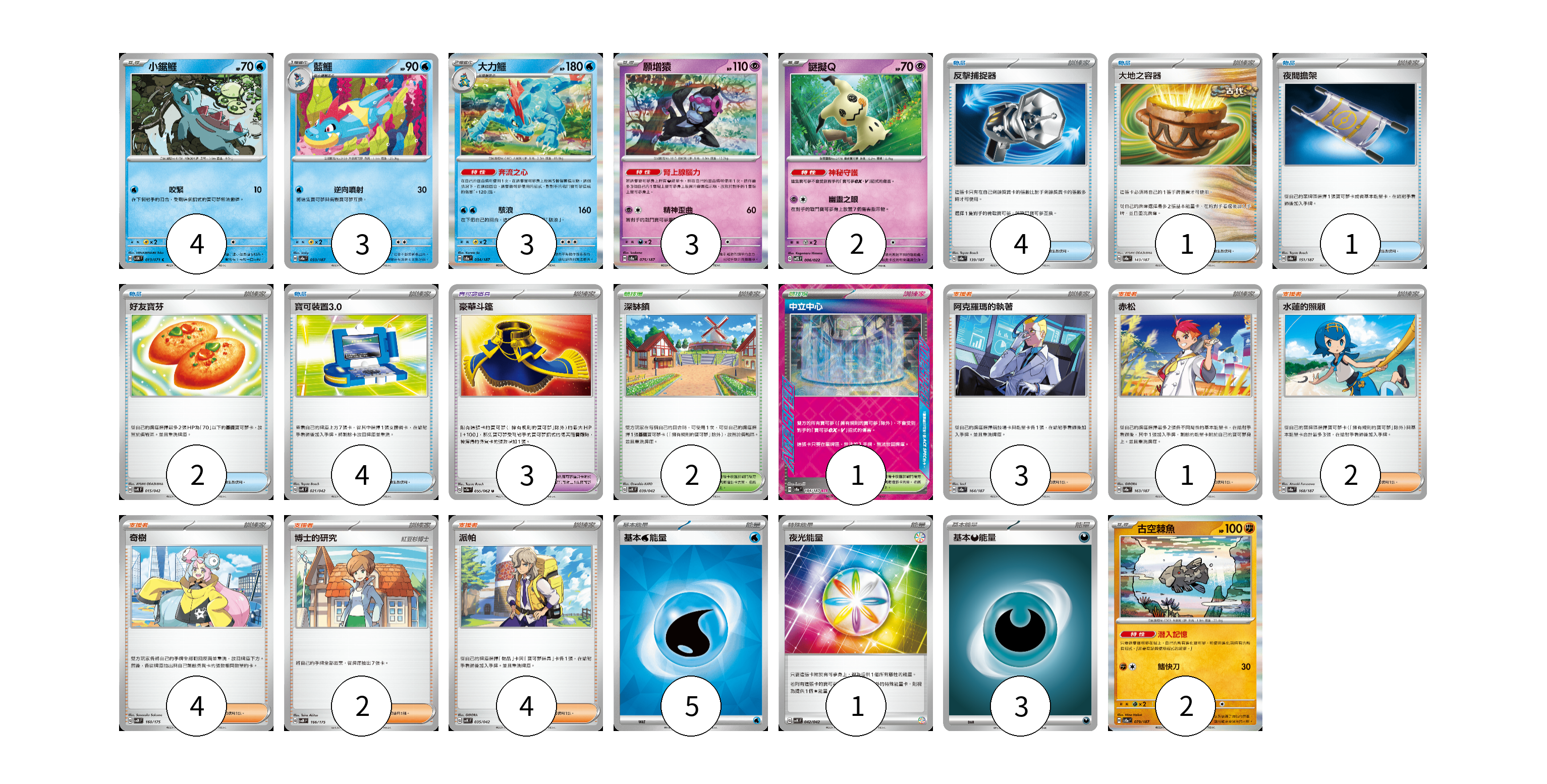 牌組構築方案 以此牌組為基礎新構築牌組 顯示卡面 顯示列表 寶可夢卡(17) 4 3 3 3 2 2 寶可夢道具(3) 3 物品卡(12) 4 1 1 2 4 支援者卡(16) 3 1 2 4 2 4 競技場卡(3) 2 1 能量卡(9) 5 1 3 寶可夢卡(17) 卡牌名稱 張數 卡牌名稱 張數 小鋸鱷 SV5K 013/071 04 藍鱷 SV8a 033/187 03 大力鱷 SV8a 034/187 03 願增猿 SV8a 075/187 03 謎擬Q SVTS 006/022 02 古空棘魚 SV8a 079/187 02 寶可夢道具(3) 卡牌名稱 張數 卡牌名稱 張數 豪華斗篷 SV3a 055/062 03 物品卡(12) 卡牌名稱 張數 卡牌名稱 張數 反擊捕捉器 SV8a 139/187 04 大地之容器 SV8a 143/187 01 夜間擔架 SV8a 151/187 01 好友寶芬 SVK 015/042 02 寶可裝置3.0 SVK 021/042 04 支援者卡(16) 卡牌名稱 張數 卡牌名稱 張數 阿克羅瑪的執著 SV8a 164/187 03 赤松 SV8a 163/187 01 水蓮的照顧 SV8a 168/187 02 奇樹 SVM 160/175 04 博士的研究 SVM 166/175 02 派帕 SVK 035/042 04 競技場卡(3) 卡牌名稱 張數 卡牌名稱 張數 深缽鎮 SVK 039/042 02 中立中心 SV8a 184/187 01 能量卡(9) 卡牌名稱 張數 卡牌名稱 張數 基本【水】能量 SVM WAT 05 夜光能量 SVK 042/042 01 基本【惡】能量 SVF DAR 03 以此牌組為基礎新構築牌組 牌組編碼 HsBNfX-ZVMECy-AdCsIb copy 列印牌組單 牌組編碼已複製 分享至SNS
