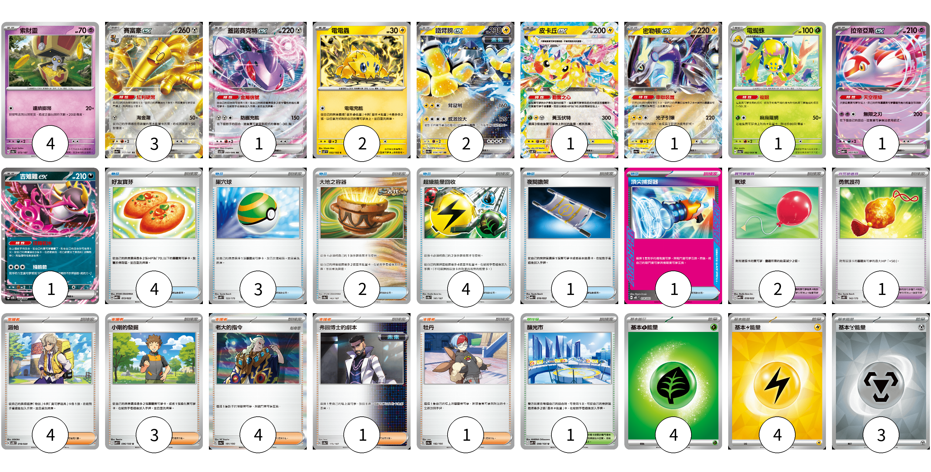 牌組構築方案 以此牌組為基礎新構築牌組 顯示卡面 顯示列表 寶可夢卡(17) 4 3 1 2 2 1 1 1 1 1 寶可夢道具(3) 2 1 物品卡(15) 4 3 2 4 1 1 支援者卡(13) 4 3 4 1 1 競技場卡(1) 1 能量卡(11) 4 4 3 寶可夢卡(17) 卡牌名稱 張數 卡牌名稱 張數 索財靈 SV8a 073/187 04 賽富豪ex SV8a 117/187 03 蓋諾賽克特ex SV11B 069/086 01 電電蟲 SV7 032/102 02 鐵臂膀ex SV8a 054/187 02 皮卡丘ex SV8 033/106 01 密勒頓ex SV4a 071/190 01 電蜘蛛 SV6a 002/064 01 拉帝亞斯ex MBD 003/022 01 吉雉雞ex SVOD 004/020 01 寶可夢道具(3) 卡牌名稱 張數 卡牌名稱 張數 氣球 MBD 018/022 02 勇氣護符 SVM 142/175 01 物品卡(15) 卡牌名稱 張數 卡牌名稱 張數 好友寶芬 MBD 013/022 04 巢穴球 SVM 133/175 03 大地之容器 SV8a 143/187 02 超級能量回收 SV8a 141/187 04 夜間擔架 MBD 016/022 01 頂尖捕捉器 MBG 014/022 01 支援者卡(13) 卡牌名稱 張數 卡牌名稱 張數 派帕 SVOD 018/020 04 小剛的發掘 SV9 096/100 03 老大的指令 SV4a 181/190 04 弗圖博士的劇本 SV8a 175/187 01 牡丹 SV4a 182/190 01 競技場卡(1) 卡牌名稱 張數 卡牌名稱 張數 釀光市 SV9 098/100 01 能量卡(11) 卡牌名稱 張數 卡牌名稱 張數 基本【草】能量 M-P GRA 04 基本【雷】能量 SVQP LIG 04 基本【鋼】能量 SVOD MET 03 以此牌組為基礎新構築牌組 牌組編碼 HsOlcj-rDlmUE-cLlidS copy 列印牌組單 牌組編碼已複製 分享至SNS