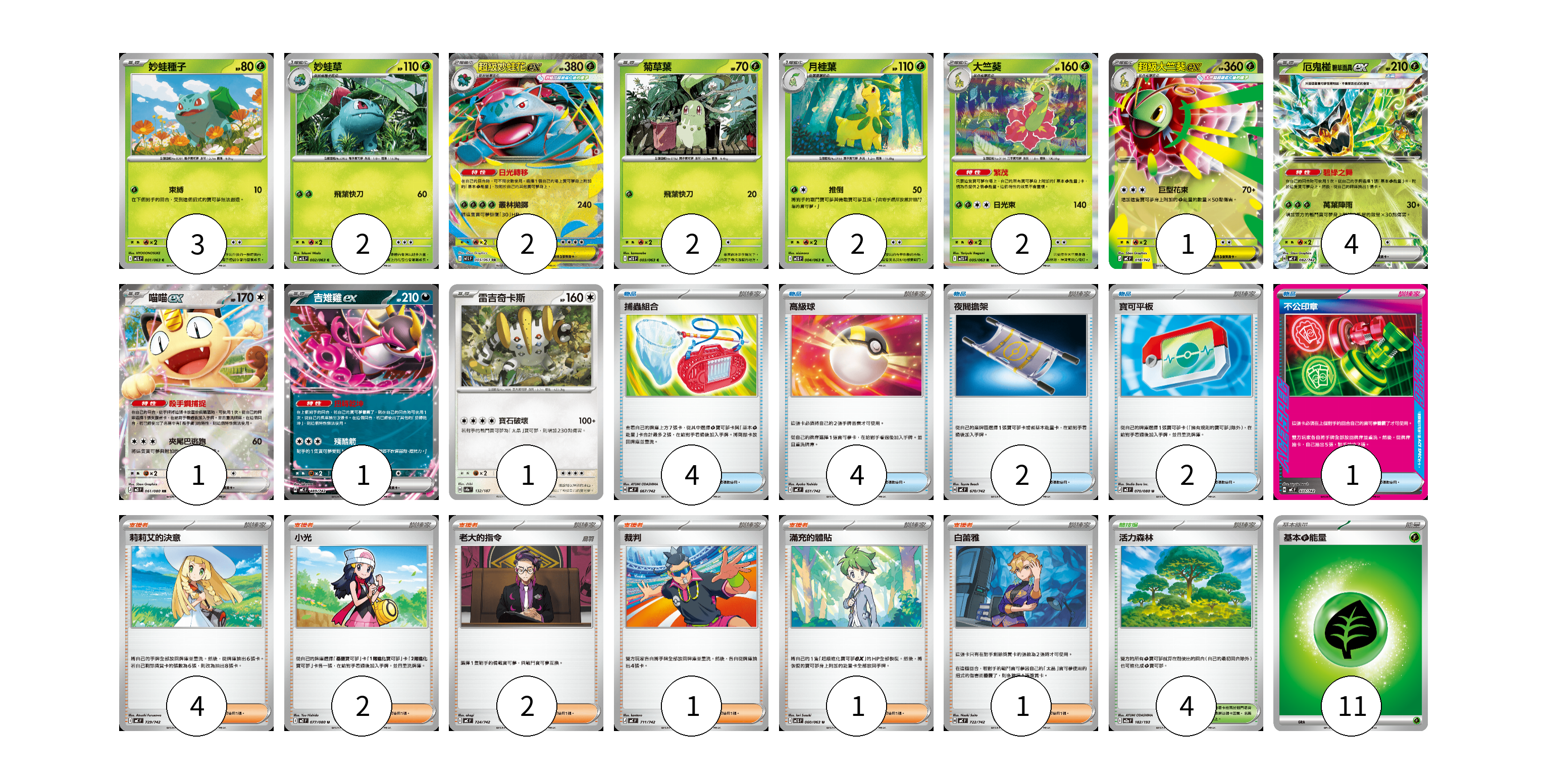 牌組構築方案 以此牌組為基礎新構築牌組 顯示卡面 顯示列表 寶可夢卡(21) 3 2 2 2 2 2 1 4 1 1 1 物品卡(13) 4 4 2 2 1 支援者卡(11) 4 2 2 1 1 1 競技場卡(4) 4 能量卡(11) 11 寶可夢卡(21) 卡牌名稱 張數 卡牌名稱 張數 妙蛙種子 M1L 001/063 03 妙蛙草 M1L 002/063 02 超級妙蛙花ex M1L 003/063 02 菊草葉 M1S 003/063 02 月桂葉 M1S 004/063 02 大竺葵 M1S 005/063 02 超級大竺葵ex MC 018/742 01 厄鬼椪 碧草面具ex MC 082/742 04 喵喵ex M3 061/080 01 吉雉雞ex MC 489/742 01 雷吉奇卡斯 SV8a 132/187 01 物品卡(13) 卡牌名稱 張數 卡牌名稱 張數 捕蟲組合 MC 667/742 04 高級球 MC 651/742 04 夜間擔架 MC 670/742 02 寶可平板 M3 070/080 02 不公印章 MC 633/742 01 支援者卡(11) 卡牌名稱 張數 卡牌名稱 張數 莉莉艾的決意 MC 729/742 04 小光 M2 077/080 02 老大的指令 MC 724/742 02 裁判 MC 711/742 01 滿充的體貼 M1S 060/063 01 白蕾雅 MC 722/742 01 競技場卡(4) 卡牌名稱 張數 卡牌名稱 張數 活力森林 M2a 182/193 04 能量卡(11) 卡牌名稱 張數 卡牌名稱 張數 基本【草】能量 MJ GRA 11 以此牌組為基礎新構築牌組 牌組編碼 HtSbEi-ylKqzP-bOaOzQ copy 列印牌組單 牌組編碼已複製 分享至SNS