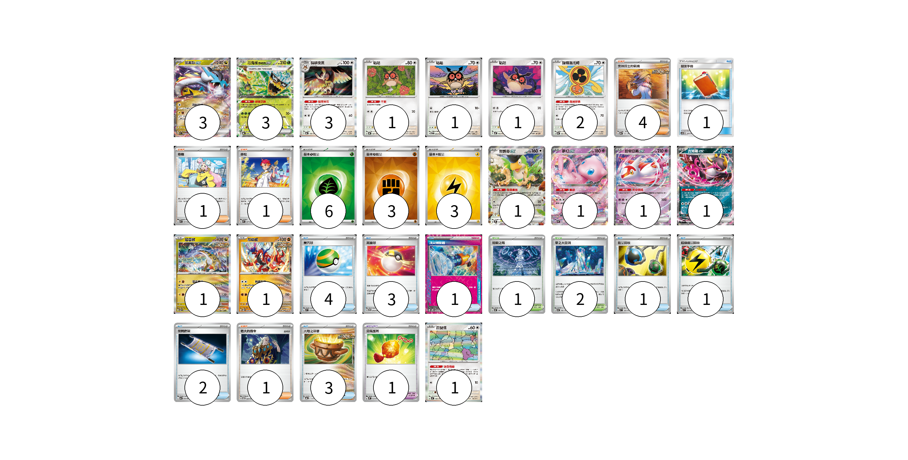 牌組構築方案 以此牌組為基礎新構築牌組 顯示卡面 顯示列表 寶可夢卡(21) 3 3 3 1 1 1 2 1 1 1 1 1 1 1 寶可夢道具(1) 1 物品卡(16) 1 4 3 1 1 1 2 3 支援者卡(7) 4 1 1 1 競技場卡(3) 1 2 能量卡(12) 6 3 3 寶可夢卡(21) 卡牌名稱 張數 卡牌名稱 張數 猛雷鼓ex SV5K 053/071 03 厄鬼椪 碧草面具ex SV8a 020/187 03 貓頭夜鷹 SV8a 128/187 03 咕咕 SV8a 127/187 01 咕咕 SV7 076/102 01 咕咕 SV5K 054/071 01 旋轉洛托姆 SV8a 131/187 02 怒鸚哥ex SV2P 065/071 01 夢幻ex SV2a 151/165 01 拉帝亞斯ex SV7a 019/064 01 吉雉雞ex SV6a 038/064 01 猛雷鼓 SV7 075/102 01 故勒頓 SV8 069/106 01 百變怪 SV4a 144/190 01 寶可夢道具(1) 卡牌名稱 張數 卡牌名稱 張數 勇氣護符 SV2D 067/071 01 物品卡(16) 卡牌名稱 張數 卡牌名稱 張數 朋友手冊 AC2D 145/176 01 巢穴球 SVK 016/042 04 高級球 SVTG 013/019 03 頂尖捕捉器 SV5M 062/071 01 能量回收 SVM 125/175 01 超級能量回收 SVK 010/042 01 夜間擔架 SV6a 056/064 02 大地之容器 SVHK 011/022 03 支援者卡(7) 卡牌名稱 張數 卡牌名稱 張數 奧琳博士的氣魄 SV8a 167/187 04 奇樹 SVK 031/042 01 赤松 SVK 027/042 01 老大的指令 SVTM 020/022 01 競技場卡(3) 卡牌名稱 張數 卡牌名稱 張數 阻礙之塔 SV8a 181/187 01 零之大空洞 SV8a 182/187 02 能量卡(12) 卡牌名稱 張數 卡牌名稱 張數 基本【草】能量 SVM GRA 06 基本【鬥】能量 SVM FIG 03 基本【雷】能量 SVM LIG 03 以此牌組為基礎新構築牌組 牌組編碼 HxeIDm-YMPfXo-mYMbsf copy 列印牌組單 牌組編碼已複製 分享至SNS