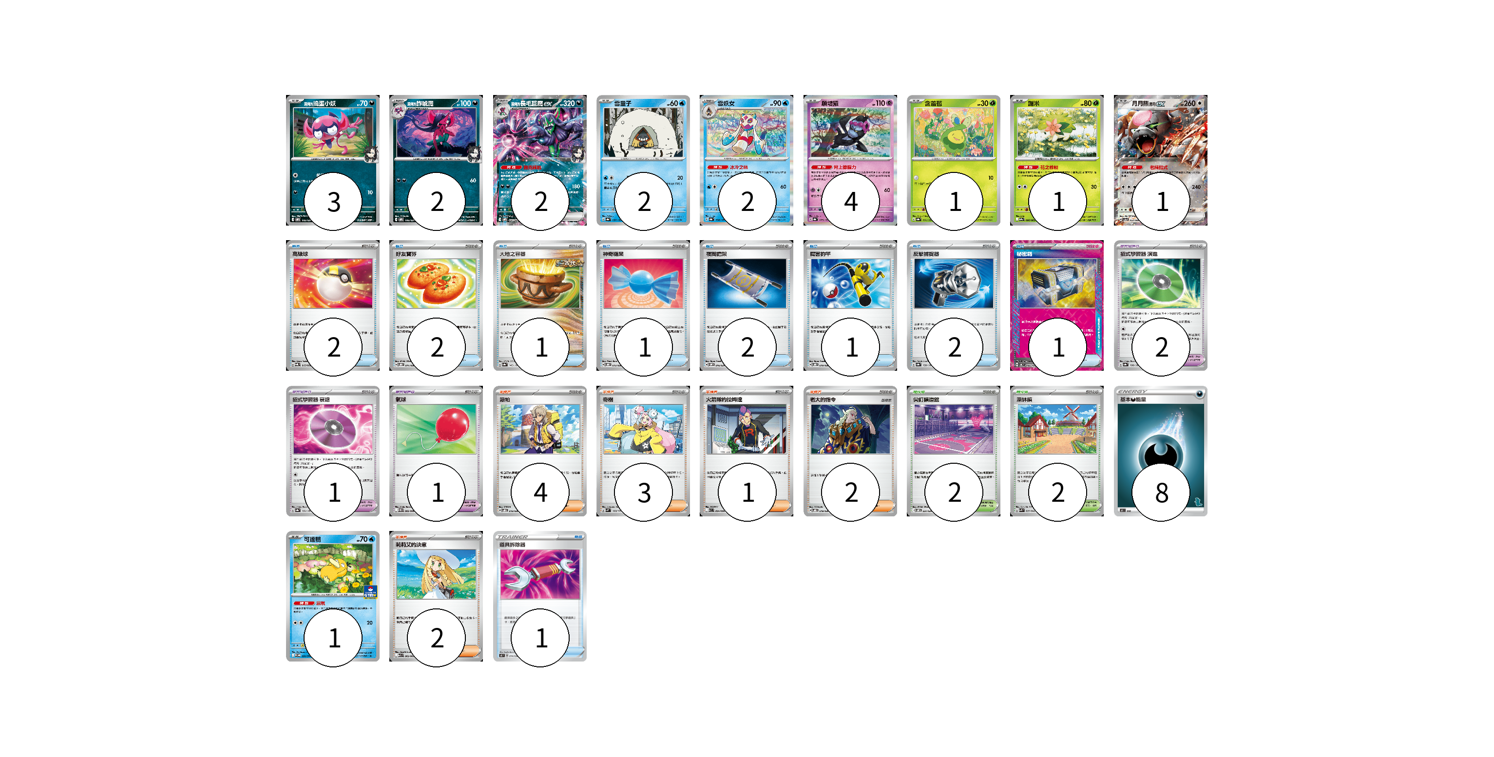 牌組構築方案 以此牌組為基礎新構築牌組 顯示卡面 顯示列表 寶可夢卡(19) 3 2 2 2 2 4 1 1 1 1 寶可夢道具(4) 2 1 1 物品卡(13) 2 2 1 1 2 1 2 1 1 支援者卡(12) 4 3 1 2 2 競技場卡(4) 2 2 能量卡(8) 8 寶可夢卡(19) 卡牌名稱 張數 卡牌名稱 張數 <瑪俐的>搗蛋小妖 SVOM 005/021 03 <瑪俐的>詐唬魔 SVOM 006/021 02 <瑪俐的>長毛巨魔ex SVOM 007/021 02 雪童子 SV8a 037/187 02 雪妖女 SV8a 038/187 02 願增猿 SV8a 075/187 04 含羞苞 SV8a 001/187 01 謝米 SV9a 006/063 01 月月熊 赫月 ex SV5a 052/066 01 可達鴨 SV-P 220/SV-P 01 寶可夢道具(4) 卡牌名稱 張數 卡牌名稱 張數 招式學習器 演進 SV8a 160/187 02 招式學習器 衰退 SV8a 161/187 01 氣球 SV11B 082/086 01 物品卡(13) 卡牌名稱 張數 卡牌名稱 張數 高級球 SVQL 015/022 02 好友寶芬 SVOD 011/020 02 大地之容器 SV8a 143/187 01 神奇糖果 SVOD 013/020 01 夜間擔架 SVOM 016/021 02 厲害釣竿 SVOD 010/020 01 反擊捕捉器 SV8a 139/187 02 秘密箱 SV6 092/101 01 道具拆除器 SK 014/030 01 支援者卡(12) 卡牌名稱 張數 卡牌名稱 張數 派帕 SVOD 018/020 04 奇樹 SVM 160/175 03 火箭隊的拉姆達 SV10 094/098 01 老大的指令 SVOD 019/020 02 莉莉艾的決意 M1L 062/063 02 競技場卡(4) 卡牌名稱 張數 卡牌名稱 張數 尖釘鎮道館 SVOM 021/021 02 深缽鎮 SVK 039/042 02 能量卡(8) 卡牌名稱 張數 卡牌名稱 張數 基本惡能量 SH DAR 08 以此牌組為基礎新構築牌組 牌組編碼 HyRzlc-aElpNq-gKLnGj copy 列印牌組單 牌組編碼已複製 分享至SNS
