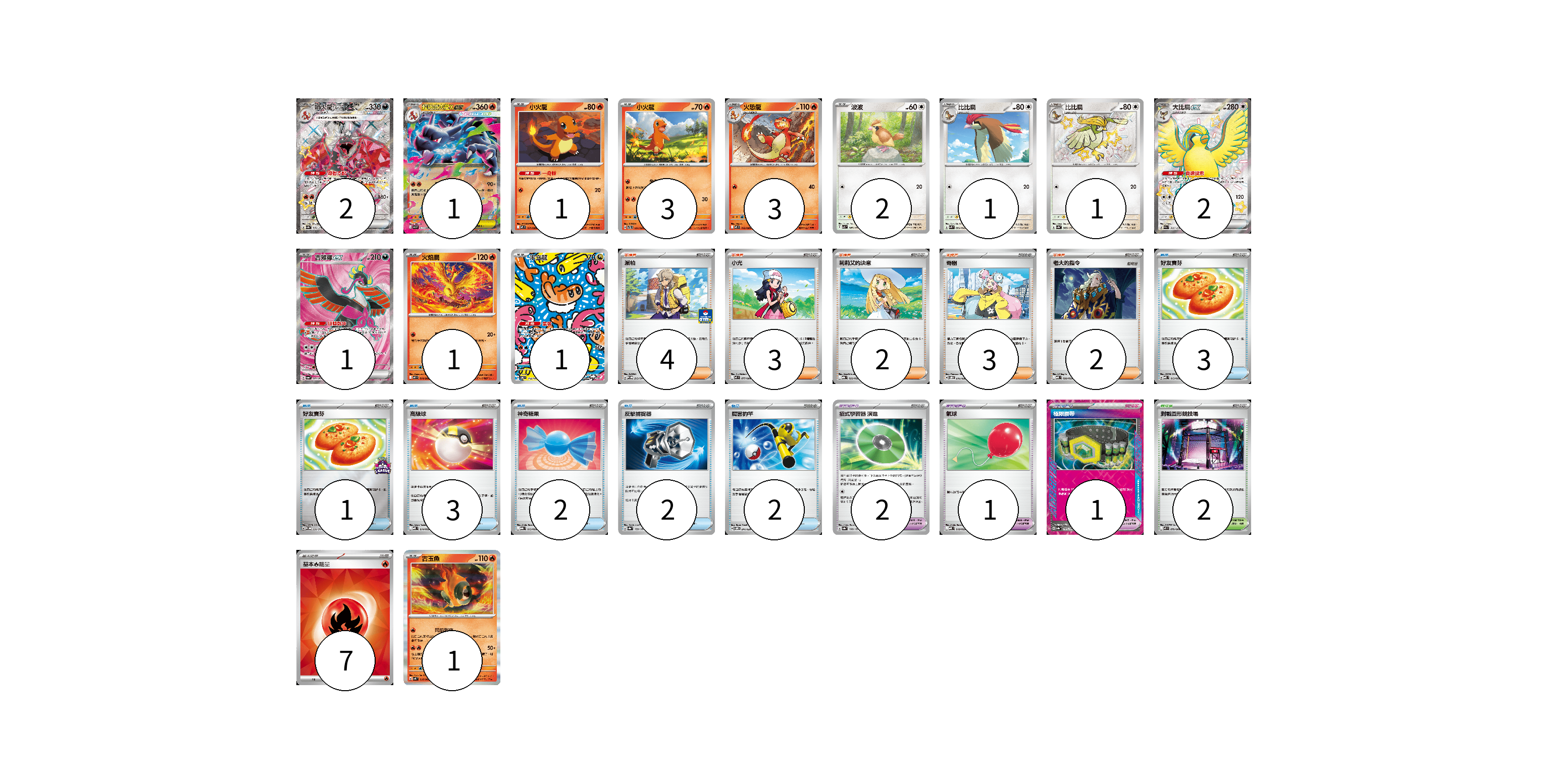 牌組構築方案 以此牌組為基礎新構築牌組 顯示卡面 顯示列表 寶可夢卡(20) 2 1 1 3 3 2 1 1 2 1 1 1 1 寶可夢道具(4) 2 1 1 物品卡(13) 3 1 3 2 2 2 支援者卡(14) 4 3 2 3 2 競技場卡(2) 2 能量卡(7) 7 寶可夢卡(20) 卡牌名稱 張數 卡牌名稱 張數 噴火龍ex SV4a 331/190 02 超級噴火龍Xex M2 013/080 01 小火龍 M2 011/080 01 小火龍 SVTL 001/021 03 火恐龍 M2 012/080 03 波波 SV3 087/108 02 比比鳥 SVK 004/042 01 比比鳥 SV4a 305/190 01 大比鳥ex SV4a 335/190 02 吉雉雞ex SV6a 081/064 01 火焰鳥 M2 014/080 01 米立龍 SV6 112/101 01 古玉魚 SV4K 016/066 01 寶可夢道具(4) 卡牌名稱 張數 卡牌名稱 張數 招式學習器 演進 SV8a 160/187 02 氣球 MBD 018/022 01 極限腰帶 SV8a 159/187 01 物品卡(13) 卡牌名稱 張數 卡牌名稱 張數 好友寶芬 MBD 013/022 03 好友寶芬 SV-P 230/SV-P 01 高級球 MBD 014/022 03 神奇糖果 MBG 013/022 02 反擊捕捉器 SV8a 139/187 02 厲害釣竿 SVOM 011/021 02 支援者卡(14) 卡牌名稱 張數 卡牌名稱 張數 派帕 SV-P 213/SV-P 04 小光 M2 077/080 03 莉莉艾的決意 MBG 022/022 02 奇樹 SVOD 016/020 03 老大的指令 MBD 020/022 02 競技場卡(2) 卡牌名稱 張數 卡牌名稱 張數 對戰圓形競技場 M2 079/080 02 能量卡(7) 卡牌名稱 張數 卡牌名稱 張數 基本【火】能量 SVQL FIR 07 以此牌組為基礎新構築牌組 牌組編碼 HzRGID-neqRSh-oBpiUi copy 列印牌組單 牌組編碼已複製 分享至SNS
