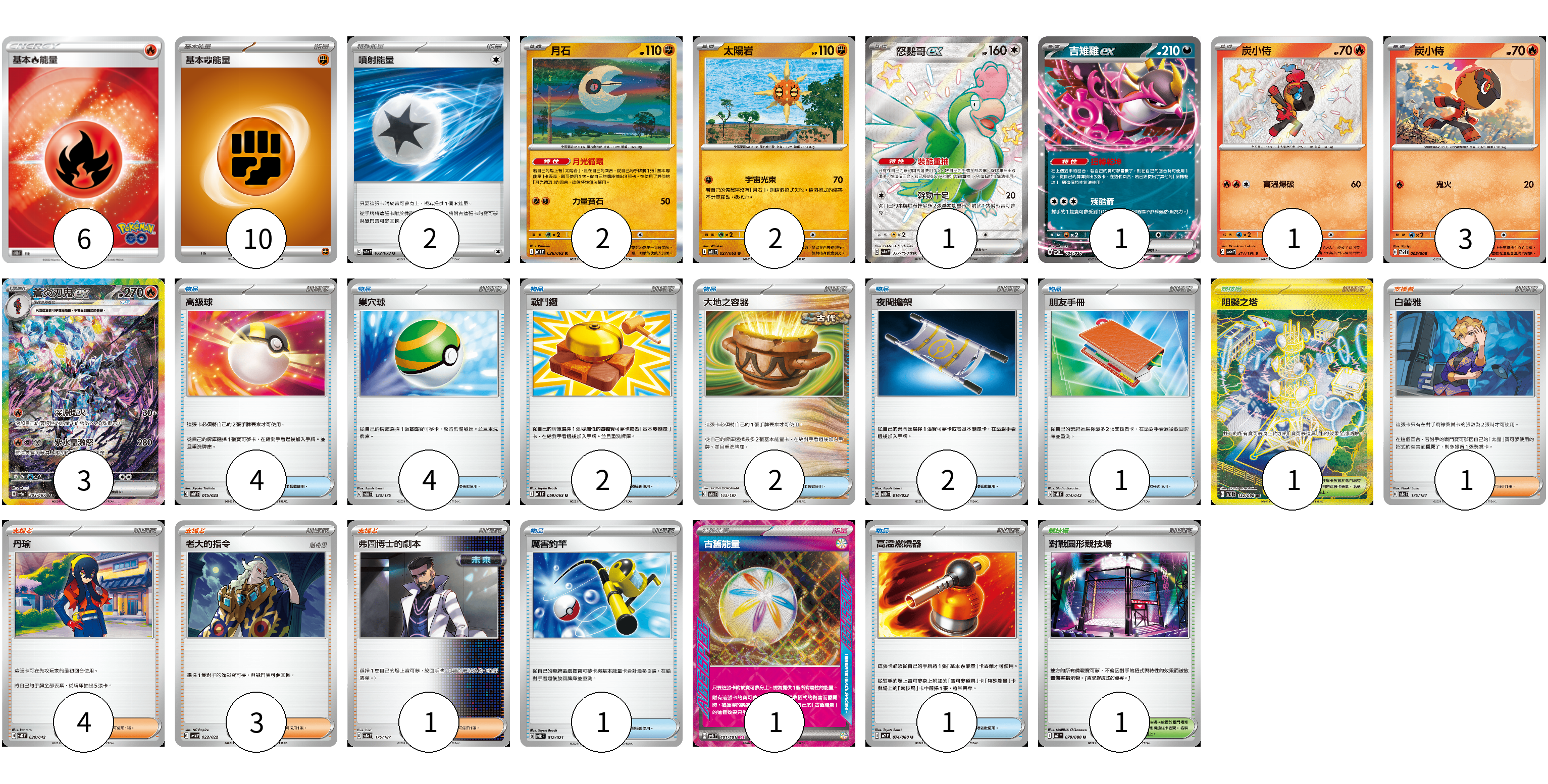 牌組構築方案 以此牌組為基礎新構築牌組 顯示卡面 顯示列表 寶可夢卡(13) 2 2 1 1 1 3 3 物品卡(17) 4 4 2 2 2 1 1 1 支援者卡(9) 1 4 3 1 競技場卡(2) 1 1 能量卡(19) 6 10 2 1 寶可夢卡(13) 卡牌名稱 張數 卡牌名稱 張數 月石 M1L 026/063 02 太陽岩 M1L 027/063 02 怒鸚哥ex SV4a 337/190 01 吉雉雞ex SVOD 004/020 01 炭小侍 SV4a 217/190 01 炭小侍 SVPS 005/008 03 蒼炎刃鬼ex SV8a 203/187 03 物品卡(17) 卡牌名稱 張數 卡牌名稱 張數 高級球 SVQP 015/023 04 巢穴球 SVM 133/175 04 戰鬥鑼 M1L 059/063 02 大地之容器 SV8a 143/187 02 夜間擔架 MBD 016/022 02 朋友手冊 SVK 014/042 01 厲害釣竿 SVTR 012/021 01 高溫燃燒器 M2 074/080 01 支援者卡(9) 卡牌名稱 張數 卡牌名稱 張數 白蕾雅 SV8a 176/187 01 丹瑜 SVK 030/042 04 老大的指令 SVHM 022/022 03 弗圖博士的劇本 SV8a 175/187 01 競技場卡(2) 卡牌名稱 張數 卡牌名稱 張數 阻礙之塔 SV10 132/098 01 對戰圓形競技場 M2 079/080 01 能量卡(19) 卡牌名稱 張數 卡牌名稱 張數 基本火能量 S10b FIR 06 基本鬥能量 sv-p FIG 10 噴射能量 SV1a 072/073 02 古舊能量 SV6 101/101 01 以此牌組為基礎新構築牌組 牌組編碼 IAwfXV-EiDXhk-HuGxVa copy 列印牌組單 牌組編碼已複製 分享至SNS