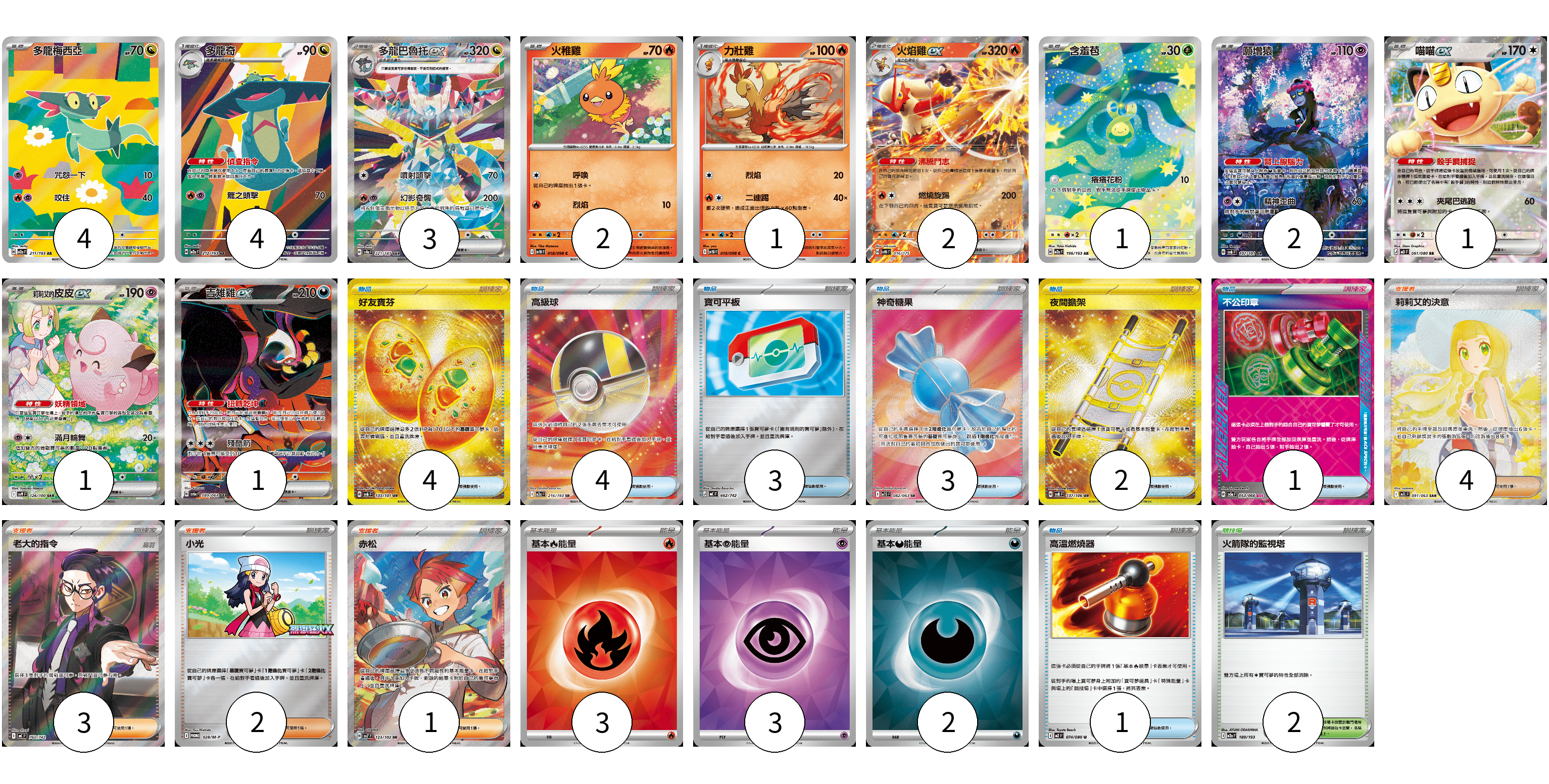 牌組構築方案 以此牌組為基礎新構築牌組 顯示卡面 顯示列表 寶可夢卡(22) 4 4 3 2 1 2 1 2 1 1 1 物品卡(18) 4 4 3 3 2 1 1 支援者卡(10) 4 3 2 1 競技場卡(2) 2 能量卡(8) 3 3 2 寶可夢卡(22) 卡牌名稱 張數 卡牌名稱 張數 多龍梅西亞 M2a 211/193 04 多龍奇 M2a 212/193 04 多龍巴魯托ex SV8a 221/187 03 火稚雞 SV10 018/098 02 力壯雞 SV10 019/098 01 火焰雞ex SVM 016/175 02 含羞苞 M2a 196/193 01 願增猿 SV6 107/101 02 喵喵ex M3 061/080 01 莉莉艾的皮皮ex SV9 126/100 01 吉雉雞ex SV6a 089/064 01 物品卡(18) 卡牌名稱 張數 卡牌名稱 張數 好友寶芬 SV6 133/101 04 高級球 M2a 216/193 04 寶可平板 MC 662/742 03 神奇糖果 M1S 082/063 03 夜間擔架 SV8 137/106 02 不公印章 SV5a 053/066 01 高溫燃燒器 M2 074/080 01 支援者卡(10) 卡牌名稱 張數 卡牌名稱 張數 莉莉艾的決意 M1L 091/063 04 老大的指令(烏羽) MC 760/742 03 小光 M-P 028/M-P 02 赤松 SV7 123/102 01 競技場卡(2) 卡牌名稱 張數 卡牌名稱 張數 火箭隊的監視塔 M2a 189/193 02 能量卡(8) 卡牌名稱 張數 卡牌名稱 張數 基本【火】能量 SVM FIR 03 基本【超】能量 SVM PSY 03 基本【惡】能量 SVM DAR 02 以此牌組為基礎新構築牌組 牌組編碼 ICBToh-ydcoBo-qypLZV copy 列印牌組單 牌組編碼已複製 分享至SNS