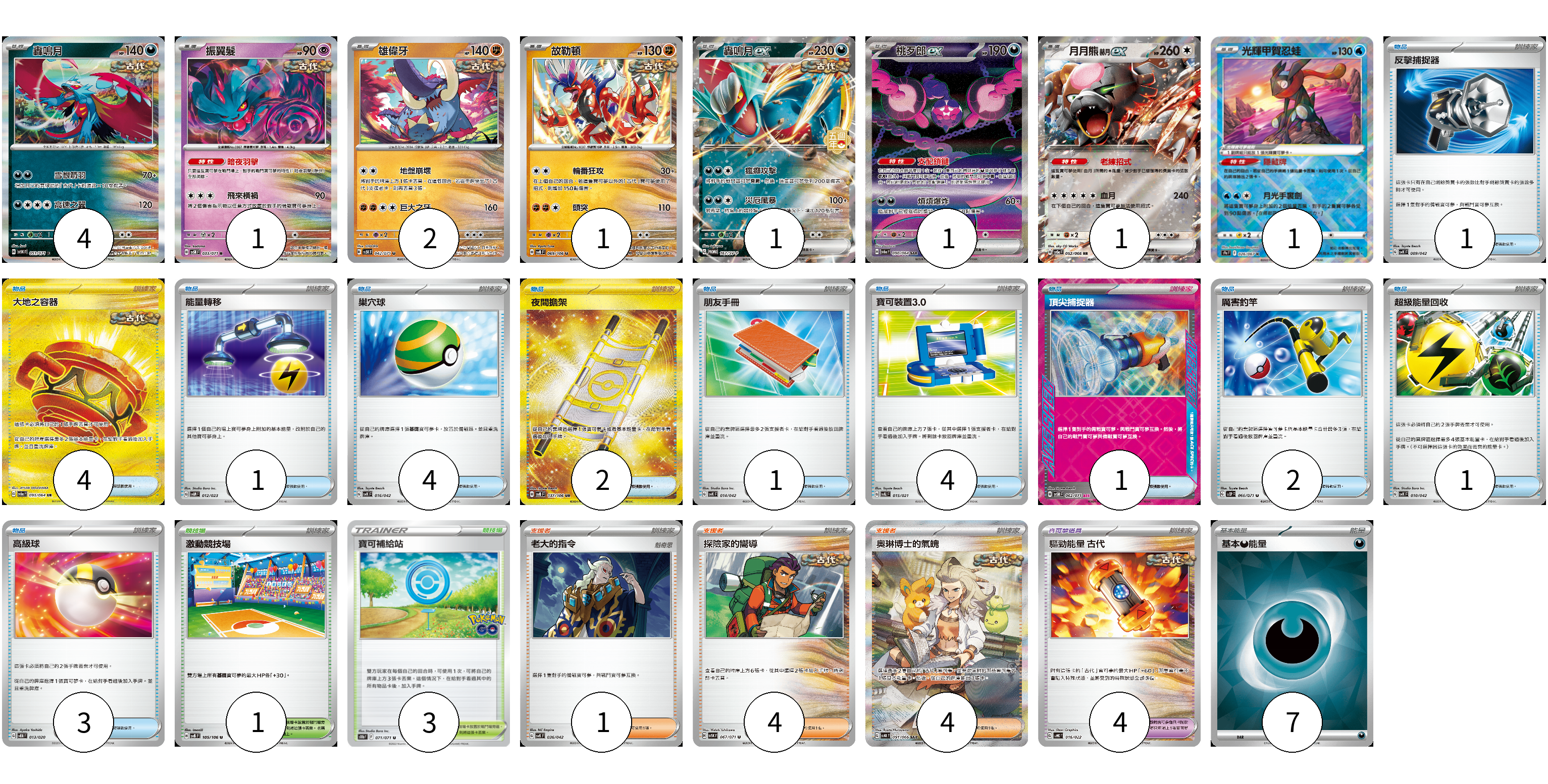 牌組構築方案 以此牌組為基礎新構築牌組 顯示卡面 顯示列表 寶可夢卡(12) 4 1 2 1 1 1 1 1 寶可夢道具(4) 4 物品卡(24) 1 4 1 4 2 1 4 1 2 1 3 支援者卡(9) 1 4 4 競技場卡(4) 1 3 能量卡(7) 7 寶可夢卡(12) 卡牌名稱 張數 卡牌名稱 張數 轟鳴月 SV5K 051/071 04 振翼髮 SV5K 033/071 01 雄偉牙 SV5K 042/071 02 故勒頓 SV8 069/106 01 轟鳴月ex SV-P 167/SV-P 01 桃歹郎ex SV6a 090/064 01 月月熊 赫月 ex SV5a 052/066 01 光輝甲賀忍蛙 S9a 026/067 01 寶可夢道具(4) 卡牌名稱 張數 卡牌名稱 張數 驅勁能量 古代 SVHK 016/022 04 物品卡(24) 卡牌名稱 張數 卡牌名稱 張數 反擊捕捉器 SVK 009/042 01 大地之容器 SV6a 093/064 04 能量轉移 SVAM 012/023 01 巢穴球 SVK 016/042 04 夜間擔架 SV8 137/106 02 朋友手冊 SVK 014/042 01 寶可裝置3.0 SVAL 015/021 04 頂尖捕捉器 SV5M 062/071 01 厲害釣竿 SV2P 066/071 02 超級能量回收 SVK 010/042 01 高級球 SVEM 013/020 03 支援者卡(9) 卡牌名稱 張數 卡牌名稱 張數 老大的指令 SVK 036/042 01 探險家的嚮導 SV5K 067/071 04 奧琳博士的氣魄 SV4K 091/066 04 競技場卡(4) 卡牌名稱 張數 卡牌名稱 張數 激動競技場 SV8 105/106 01 寶可補給站 S10b 071/071 03 能量卡(7) 卡牌名稱 張數 卡牌名稱 張數 基本【惡】能量 SVK DAR 07 以此牌組為基礎新構築牌組 牌組編碼 ICNGxk-SKVOWM-HFSemq copy 列印牌組單 牌組編碼已複製 分享至SNS