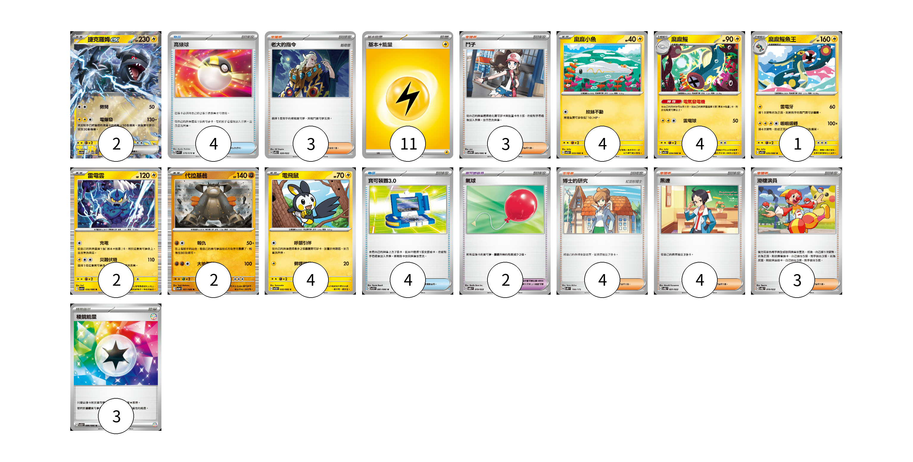 牌組構築方案 以此牌組為基礎新構築牌組 顯示卡面 顯示列表 寶可夢卡(19) 2 4 4 1 2 2 4 寶可夢道具(2) 2 物品卡(8) 4 4 支援者卡(17) 3 3 4 4 3 能量卡(14) 11 3 寶可夢卡(19) 卡牌名稱 張數 卡牌名稱 張數 捷克羅姆ex SV11B 037/086 02 麻麻小魚 SV11B 033/086 04 麻麻鰻 SV11B 034/086 04 麻麻鰻魚王 SV11B 035/086 01 雷電雲 SV11B 036/086 02 代拉基翁 SV11W 051/086 02 電飛鼠 SV11B 032/086 04 寶可夢道具(2) 卡牌名稱 張數 卡牌名稱 張數 氣球 MBG 019/022 02 物品卡(8) 卡牌名稱 張數 卡牌名稱 張數 高級球 SV1V 070/078 04 寶可裝置3.0 SV11B 081/086 04 支援者卡(17) 卡牌名稱 張數 卡牌名稱 張數 老大的指令 SVTS 020/022 03 鬥子 SV11W 085/086 03 博士的研究 SVM 166/175 04 黑連 SVQL 021/022 04 滑稽演員 SVQL 019/022 03 能量卡(14) 卡牌名稱 張數 卡牌名稱 張數 基本雷能量 sv-p LIG 11 稜鏡能量 SV11B 086/086 03 以此牌組為基礎新構築牌組 牌組編碼 IEVXKv-utLuHx-FsiPWW copy 列印牌組單 牌組編碼已複製 分享至SNS