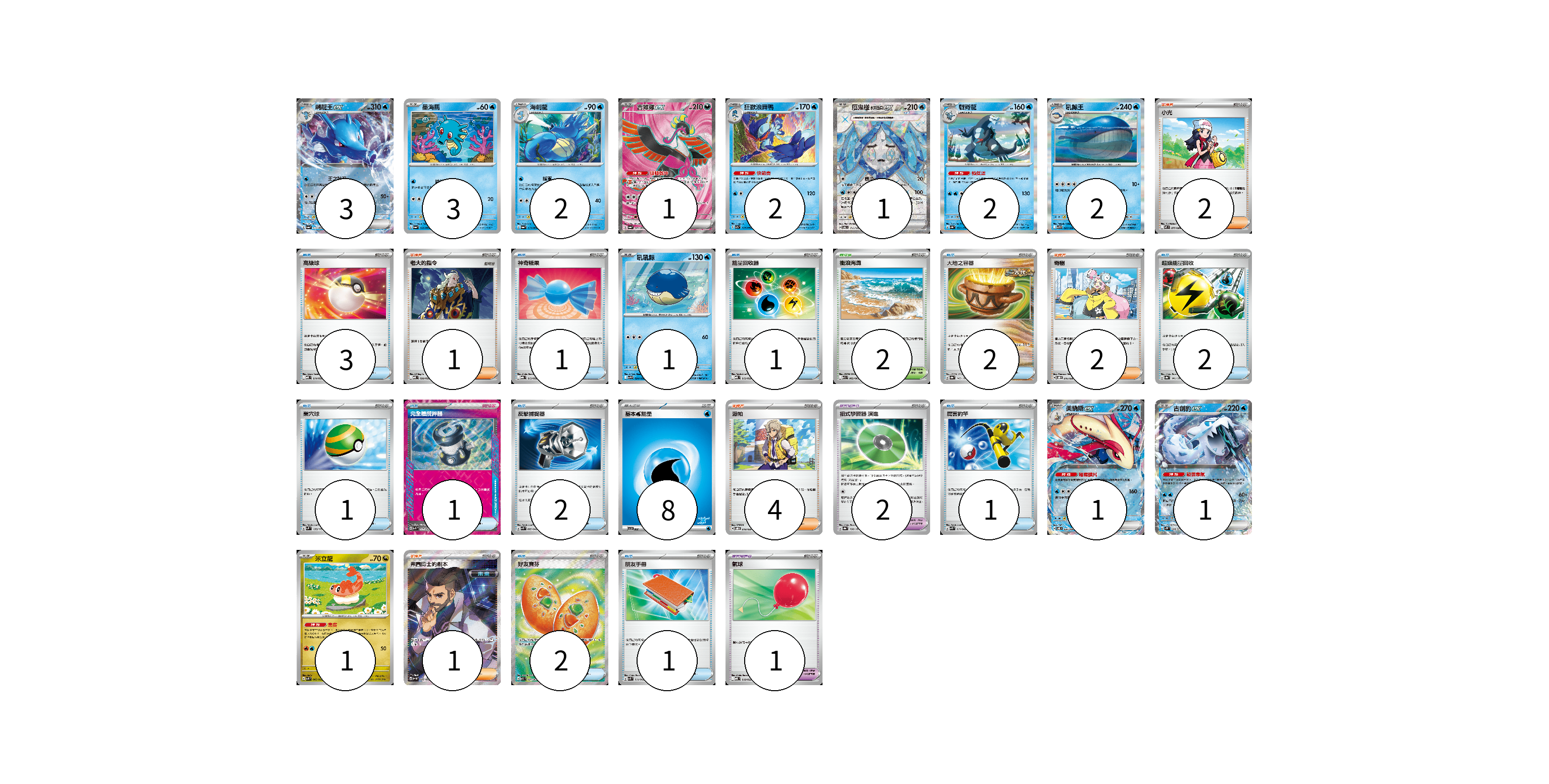 牌組構築方案 以此牌組為基礎新構築牌組 顯示卡面 顯示列表 寶可夢卡(20) 3 3 2 1 2 1 2 2 1 1 1 1 寶可夢道具(3) 2 1 物品卡(17) 3 1 1 2 2 1 1 2 1 2 1 支援者卡(10) 2 1 2 4 1 競技場卡(2) 2 能量卡(8) 8 寶可夢卡(20) 卡牌名稱 張數 卡牌名稱 張數 刺龍王ex SV6a 012/064 03 墨海馬 SV6a 010/064 03 海刺龍 SV6a 011/064 02 吉雉雞ex SV6a 081/064 01 狂歡浪舞鴨 SV7a 015/064 02 厄鬼椪 水井面具ex SV6 117/101 01 戟脊龍 SV4a 053/190 02 吼鯨王 SV9 025/100 02 吼吼鯨 SV9 024/100 01 美納斯ex SV8 026/106 01 古劍豹ex SV2P 028/071 01 米立龍 SVK 002/042 01 寶可夢道具(3) 卡牌名稱 張數 卡牌名稱 張數 招式學習器 演進 SV8a 160/187 02 氣球 MBD 018/022 01 物品卡(17) 卡牌名稱 張數 卡牌名稱 張數 高級球 MBD 014/022 03 神奇糖果 MBG 013/022 01 能量回收器 MBD 012/022 01 大地之容器 SV8a 143/187 02 超級能量回收 SV8a 141/187 02 巢穴球 SVM 133/175 01 完全體攪拌器 SVK 017/042 01 反擊捕捉器 SVK 009/042 02 厲害釣竿 SVK 011/042 01 好友寶芬 M1S 081/063 02 朋友手冊 SVK 014/042 01 支援者卡(10) 卡牌名稱 張數 卡牌名稱 張數 小光 M2 077/080 02 老大的指令 MBD 020/022 01 奇樹 SVOD 016/020 02 派帕 SVOD 018/020 04 弗圖博士的劇本 SV4M 086/066 01 競技場卡(2) 卡牌名稱 張數 卡牌名稱 張數 衝浪海灘 M1S 062/063 02 能量卡(8) 卡牌名稱 張數 卡牌名稱 張數 基本【水】能量 SVI WAT 08 以此牌組為基礎新構築牌組 牌組編碼 IEhDub-SnnMhq-McuPmS copy 列印牌組單 牌組編碼已複製 分享至SNS