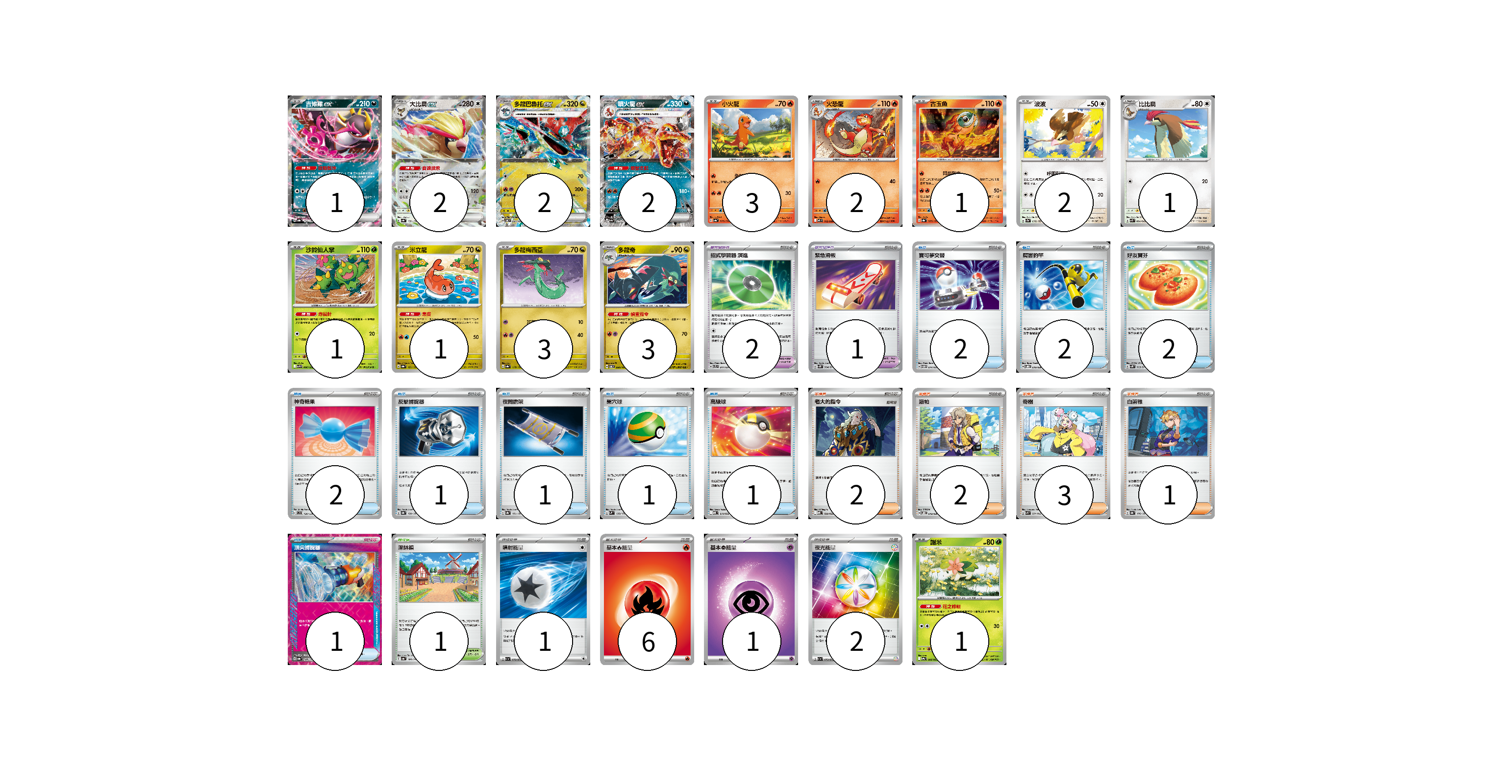 牌組構築方案 以此牌組為基礎新構築牌組 顯示卡面 顯示列表 寶可夢卡(25) 1 2 2 2 3 2 1 2 1 1 1 3 3 1 寶可夢道具(3) 2 1 物品卡(13) 2 2 2 2 1 1 1 1 1 支援者卡(8) 2 2 3 1 競技場卡(1) 1 能量卡(10) 1 6 1 2 寶可夢卡(25) 卡牌名稱 張數 卡牌名稱 張數 吉雉雞ex SV8a 104/187 01 大比鳥ex SV4a 139/190 02 多龍巴魯托ex SV6 081/101 02 噴火龍ex SV4a 115/190 02 小火龍 SV4a 025/190 03 火恐龍 M2 012/080 02 古玉魚 SV8a 025/187 01 波波 SV2a 016/165 02 比比鳥 SVK 004/042 01 沙鈴仙人掌 SV9 006/100 01 米立龍 SV8a 121/187 01 多龍梅西亞 SV8a 118/187 03 多龍奇 SV6 080/101 03 謝米 SV9a 006/063 01 寶可夢道具(3) 卡牌名稱 張數 卡牌名稱 張數 招式學習器 演進 SVTL 017/021 02 緊急滑板 SV5K 064/071 01 物品卡(13) 卡牌名稱 張數 卡牌名稱 張數 寶可夢交替 SVTM 014/022 02 厲害釣竿 SVOD 010/020 02 好友寶芬 SV5K 063/071 02 神奇糖果 SVD 120/139 02 反擊捕捉器 SV8a 139/187 01 夜間擔架 SV8a 151/187 01 巢穴球 SVM 133/175 01 高級球 MBD 014/022 01 頂尖捕捉器 SV8a 148/187 01 支援者卡(8) 卡牌名稱 張數 卡牌名稱 張數 老大的指令 MBD 020/022 02 派帕 SVOD 018/020 02 奇樹 SVK 031/042 03 白蕾雅 SV8a 176/187 01 競技場卡(1) 卡牌名稱 張數 卡牌名稱 張數 深缽鎮 SV4a 185/190 01 能量卡(10) 卡牌名稱 張數 卡牌名稱 張數 噴射能量 SV1a 072/073 01 基本火能量 sv-p FIR 06 基本【超】能量 MBD PSY 01 夜光能量 SV1a 073/073 02 以此牌組為基礎新構築牌組 牌組編碼 IHCwyW-fFmMDe-VSoeDD copy 列印牌組單 牌組編碼已複製 分享至SNS