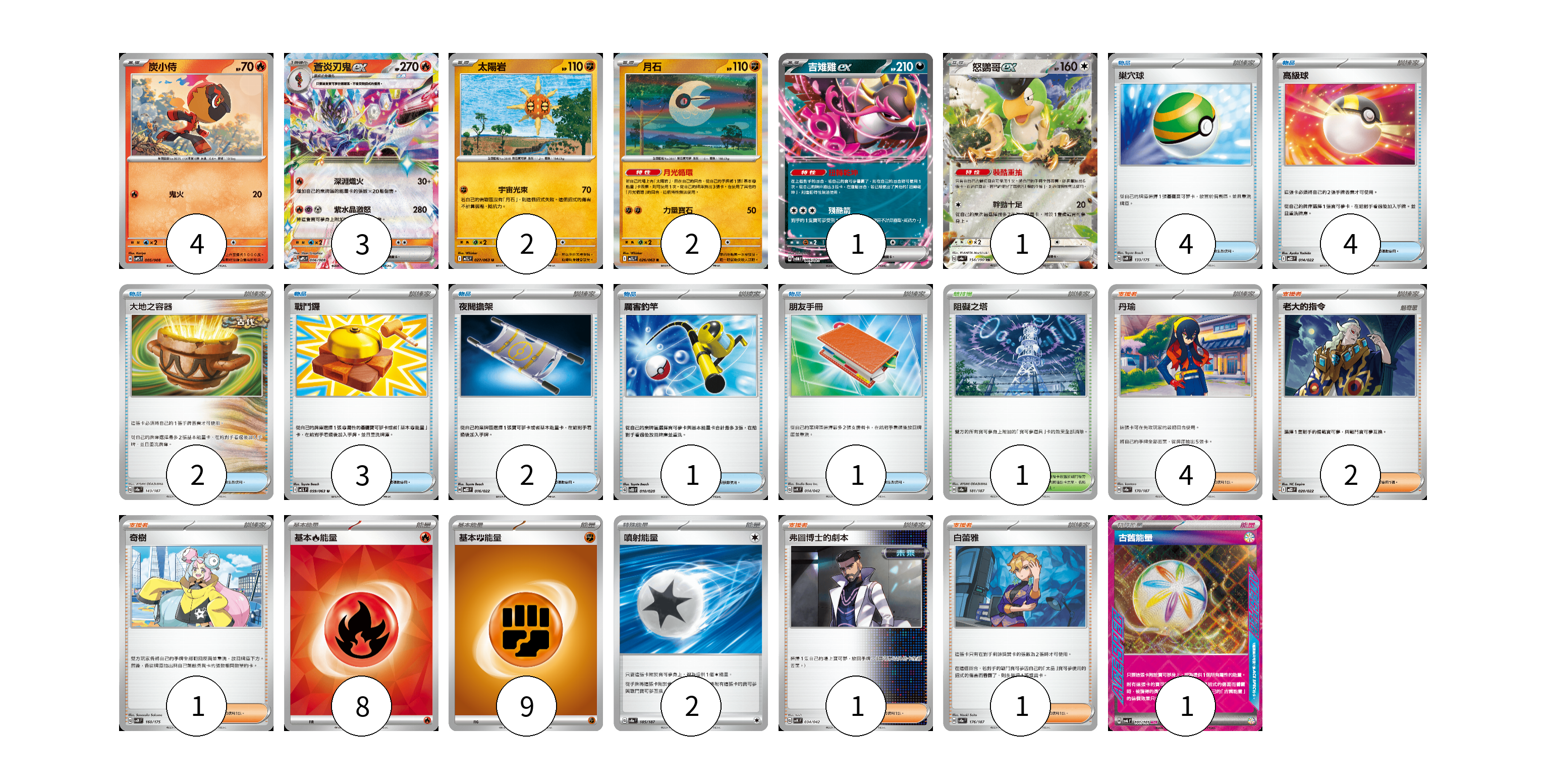 牌組構築方案 以此牌組為基礎新構築牌組 顯示卡面 顯示列表 寶可夢卡(13) 4 3 2 2 1 1 物品卡(17) 4 4 2 3 2 1 1 支援者卡(9) 4 2 1 1 1 競技場卡(1) 1 能量卡(20) 8 9 2 1 寶可夢卡(13) 卡牌名稱 張數 卡牌名稱 張數 炭小侍 SVPS 005/008 04 蒼炎刃鬼ex SVPS 006/008 03 太陽岩 M1L 027/063 02 月石 M1L 026/063 02 吉雉雞ex SVOM 009/021 01 怒鸚哥ex SV4a 154/190 01 物品卡(17) 卡牌名稱 張數 卡牌名稱 張數 巢穴球 SVM 133/175 04 高級球 MBD 014/022 04 大地之容器 SV8a 143/187 02 戰鬥鑼 M1L 059/063 03 夜間擔架 MBD 016/022 02 厲害釣竿 SVOD 010/020 01 朋友手冊 SVK 014/042 01 支援者卡(9) 卡牌名稱 張數 卡牌名稱 張數 丹瑜 SV8a 170/187 04 老大的指令 MBD 020/022 02 奇樹 SVM 160/175 01 弗圖博士的劇本 SVK 034/042 01 白蕾雅 SV8a 176/187 01 競技場卡(1) 卡牌名稱 張數 卡牌名稱 張數 阻礙之塔 SV8a 181/187 01 能量卡(20) 卡牌名稱 張數 卡牌名稱 張數 基本【火】能量 SVQL FIR 08 基本【鬥】能量 SVTG FIG 09 噴射能量 SV8a 185/187 02 古舊能量 SV6 101/101 01 以此牌組為基礎新構築牌組 牌組編碼 IIXhic-AUxKOp-gKzmGU copy 列印牌組單 牌組編碼已複製 分享至SNS