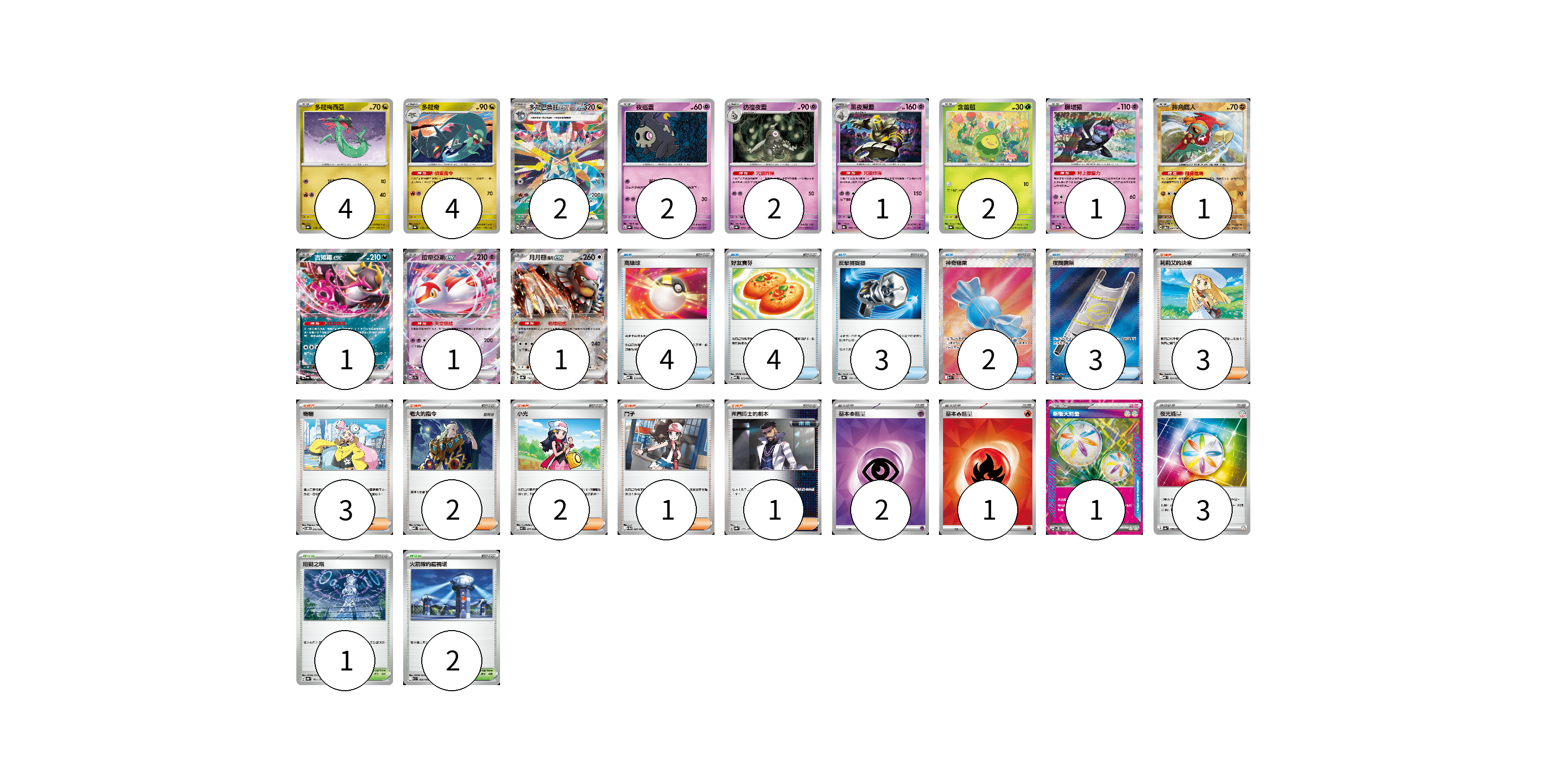 牌組構築方案 以此牌組為基礎新構築牌組 顯示卡面 顯示列表 寶可夢卡(22) 4 4 2 2 2 1 2 1 1 1 1 1 物品卡(16) 4 4 3 2 3 支援者卡(12) 3 3 2 2 1 1 競技場卡(3) 1 2 能量卡(7) 2 1 1 3 寶可夢卡(22) 卡牌名稱 張數 卡牌名稱 張數 多龍梅西亞 SV8a 118/187 04 多龍奇 SV8a 119/187 04 多龍巴魯托ex SV8a 221/187 02 夜巡靈 SV8a 064/187 02 彷徨夜靈 SV8a 065/187 02 黑夜魔靈 SV8a 066/187 01 含羞苞 SV8a 001/187 02 願增猿 SV8a 075/187 01 摔角鷹人 SV8a 084/187 01 吉雉雞ex SV6a 038/064 01 拉帝亞斯ex SV7a 019/064 01 月月熊 赫月ex SV8a 134/187 01 物品卡(16) 卡牌名稱 張數 卡牌名稱 張數 高級球 MBD 014/022 04 好友寶芬 MBD 013/022 04 反擊捕捉器 SV8a 139/187 03 神奇糖果 M1S 082/063 02 夜間擔架 M1L 083/063 03 支援者卡(12) 卡牌名稱 張數 卡牌名稱 張數 莉莉艾的決意 MBD 021/022 03 奇樹 SVOD 016/020 03 老大的指令 MBD 020/022 02 小光 M2 077/080 02 鬥子 SV11W 085/086 01 弗圖博士的劇本 SV8a 175/187 01 競技場卡(3) 卡牌名稱 張數 卡牌名稱 張數 阻礙之塔 SV8a 181/187 01 火箭隊的監視塔 SV10 096/098 02 能量卡(7) 卡牌名稱 張數 卡牌名稱 張數 基本【超】能量 SVK PSY 02 基本【火】能量 SVK FIR 01 新衝天能量 SV5K 071/071 01 夜光能量 SV4a 190/190 03 以此牌組為基礎新構築牌組 牌組編碼 IIZCuW-zkgTkd-GlqBnZ copy 列印牌組單 牌組編碼已複製 分享至SNS