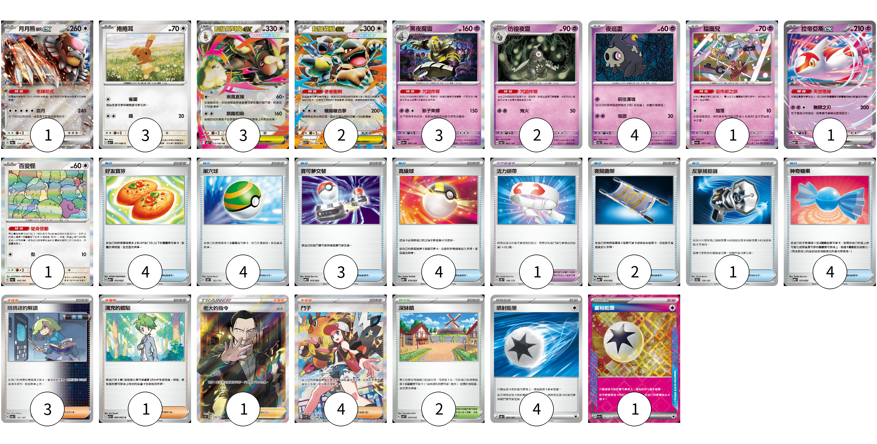 牌組構築方案 以此牌組為基礎新構築牌組 顯示卡面 顯示列表 寶可夢卡(21) 1 3 3 2 3 2 4 1 1 1 寶可夢道具(1) 1 物品卡(22) 4 4 3 4 2 1 4 支援者卡(9) 3 1 1 4 競技場卡(2) 2 能量卡(5) 4 1 寶可夢卡(21) 卡牌名稱 張數 卡牌名稱 張數 月月熊 赫月ex SV8a 134/187 01 捲捲耳 M2 071/080 03 超級長耳兔ex M2 072/080 03 超級袋獸ex M1S 051/063 02 黑夜魔靈 SV8a 066/187 03 彷徨夜靈 SV8a 065/187 02 夜巡靈 SV8a 064/187 04 鑰圈兒 SV4a 087/190 01 拉帝亞斯ex MBD 003/022 01 百變怪 SV4a 144/190 01 寶可夢道具(1) 卡牌名稱 張數 卡牌名稱 張數 活力頭帶 SVM 140/175 01 物品卡(22) 卡牌名稱 張數 卡牌名稱 張數 好友寶芬 MBD 013/022 04 巢穴球 SVM 133/175 04 寶可夢交替 MBG 015/022 03 高級球 MBD 014/022 04 夜間擔架 MBD 016/022 02 反擊捕捉器 SV8a 139/187 01 神奇糖果 MBG 013/022 04 支援者卡(9) 卡牌名稱 張數 卡牌名稱 張數 暗碼迷的解讀 SV8a 165/187 03 滿充的體貼 M1S 060/063 01 老大的指令(坂木) SC1b 170/153 01 鬥子 SV11W 173/086 04 競技場卡(2) 卡牌名稱 張數 卡牌名稱 張數 深缽鎮 SVK 039/042 02 能量卡(5) 卡牌名稱 張數 卡牌名稱 張數 噴射能量 SV8a 185/187 04 富裕能量 SV7a 064/064 01 以此牌組為基礎新構築牌組 牌組編碼 IJoMtn-NsWqOK-HsQCzt copy 列印牌組單 牌組編碼已複製 分享至SNS